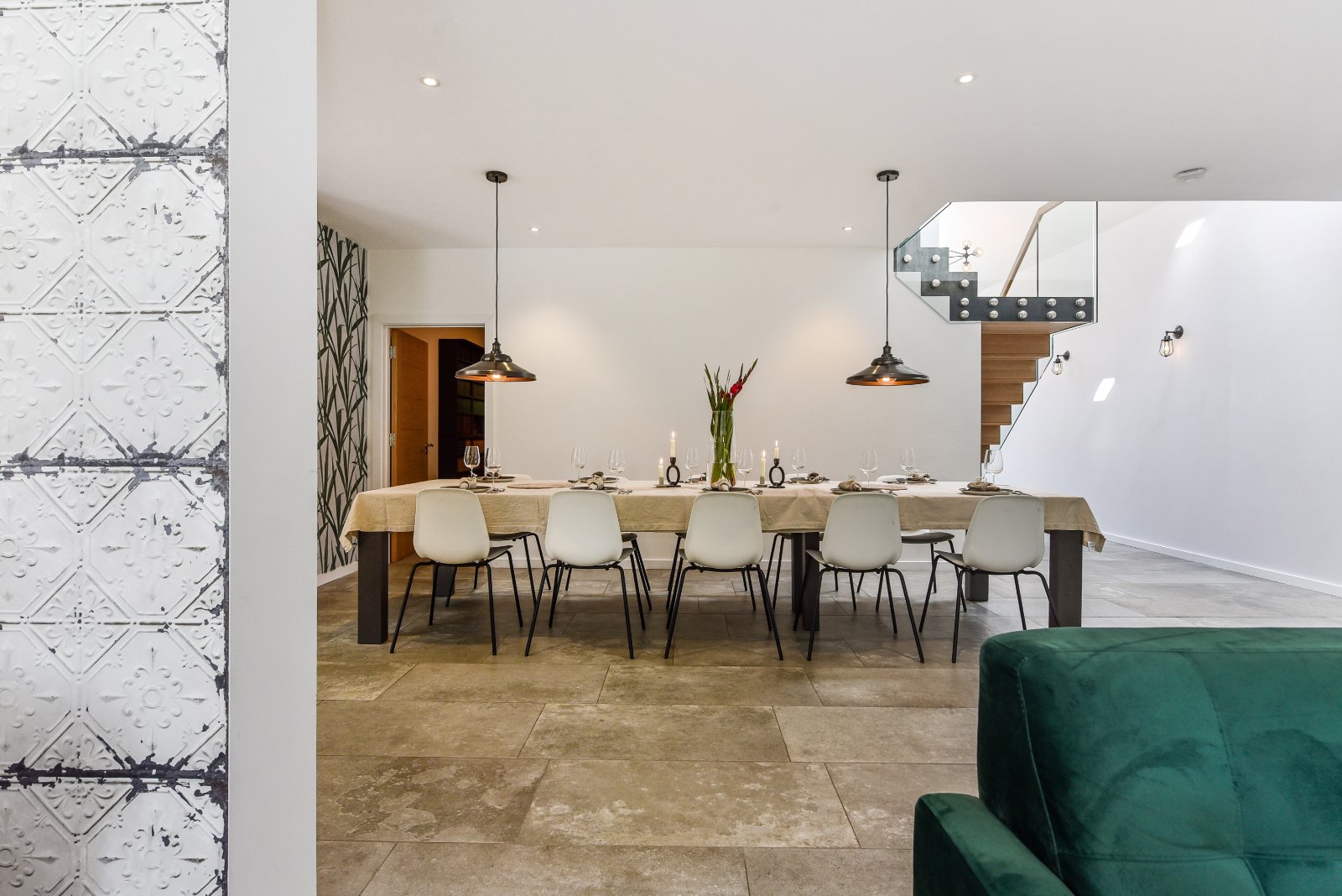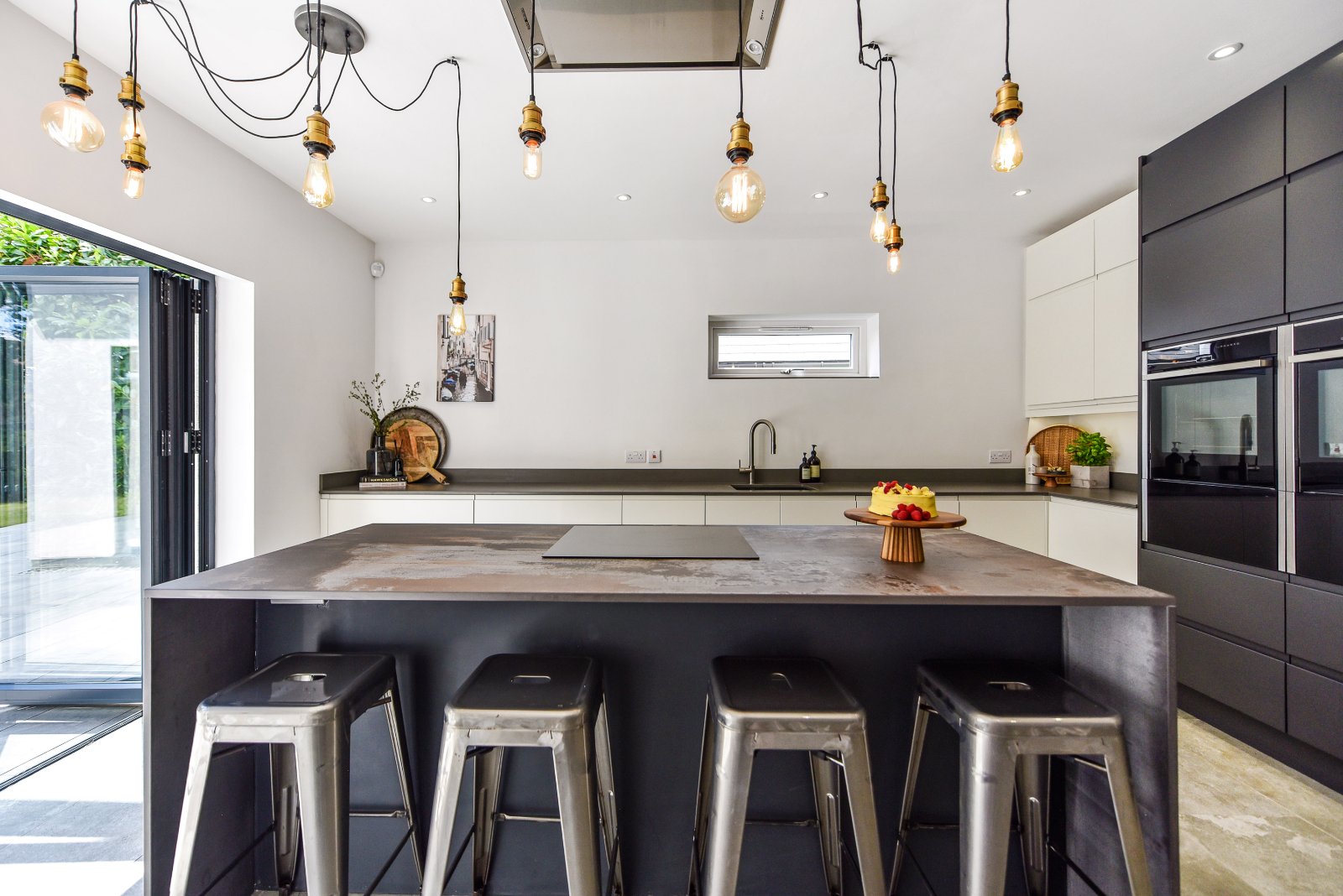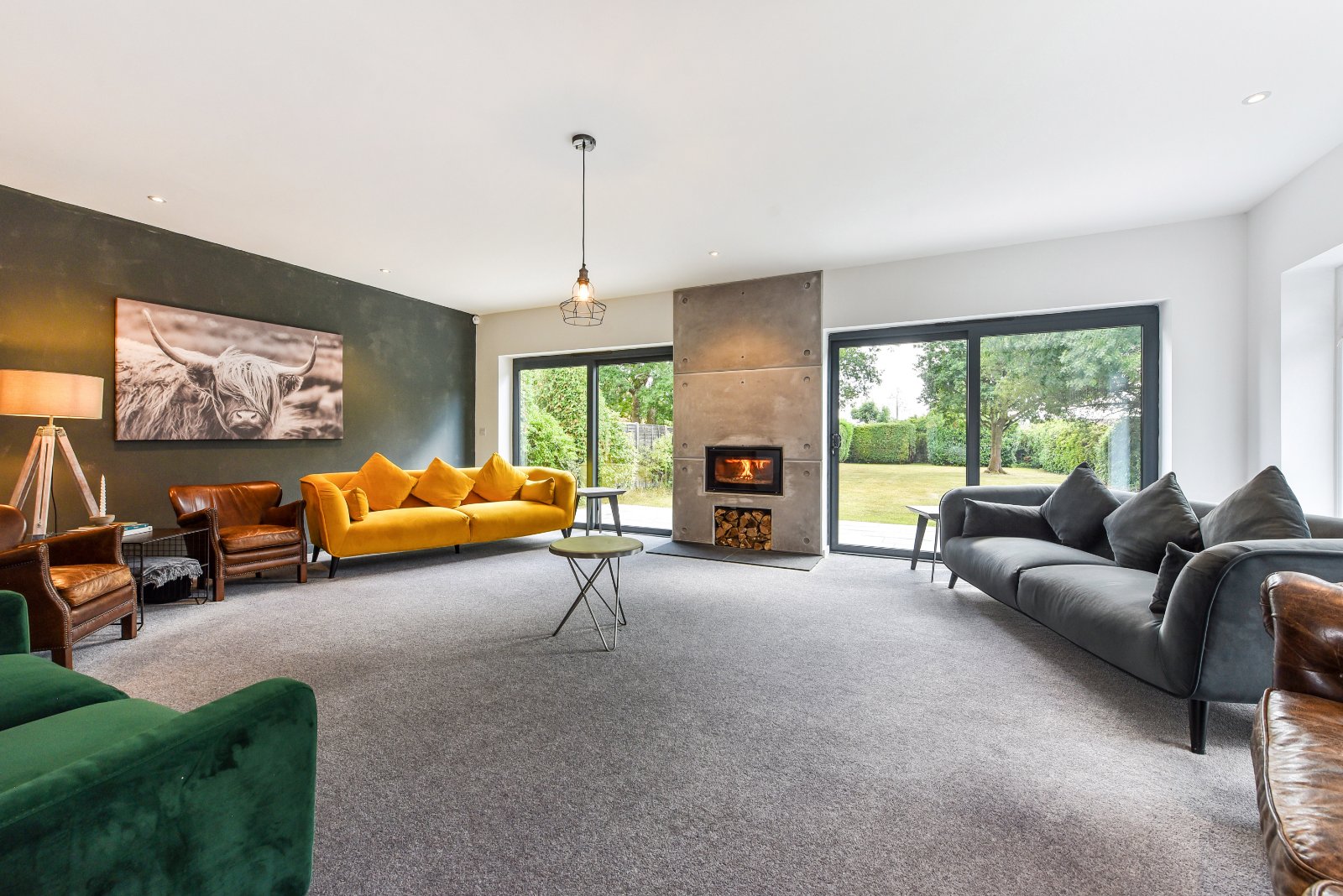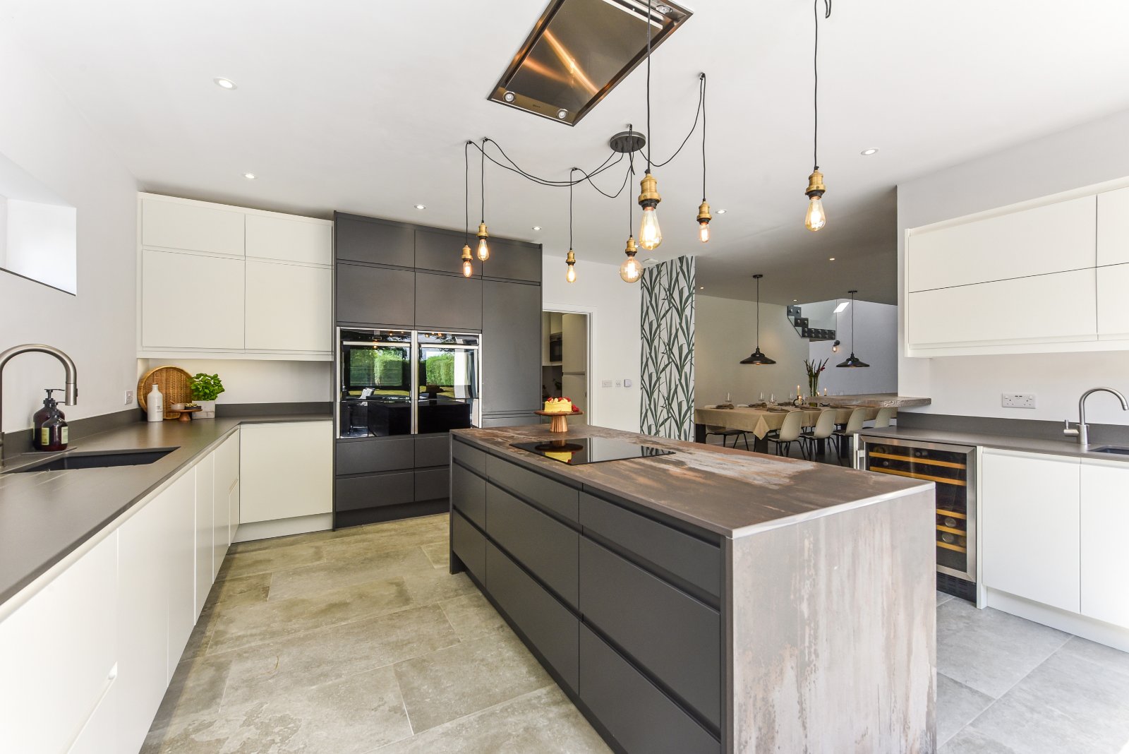 Upon entering the property, you will immediately be struck by the generous sized entrance hallway with vaulted ceiling and feature timber staircase with glazed and wooden banister. The hallway leads into the dining room with space enough for a large dining table and at least 10 chairs. A shelved and mirrored wall with concealed lighting provides a nice focal point to this room and is adjacent to the entrance into the 23ft x 17ft living room. This room is a great space for entertaining and has a stunning feature fireplace set between two sets of sliding doors that open out onto the garden terrace.