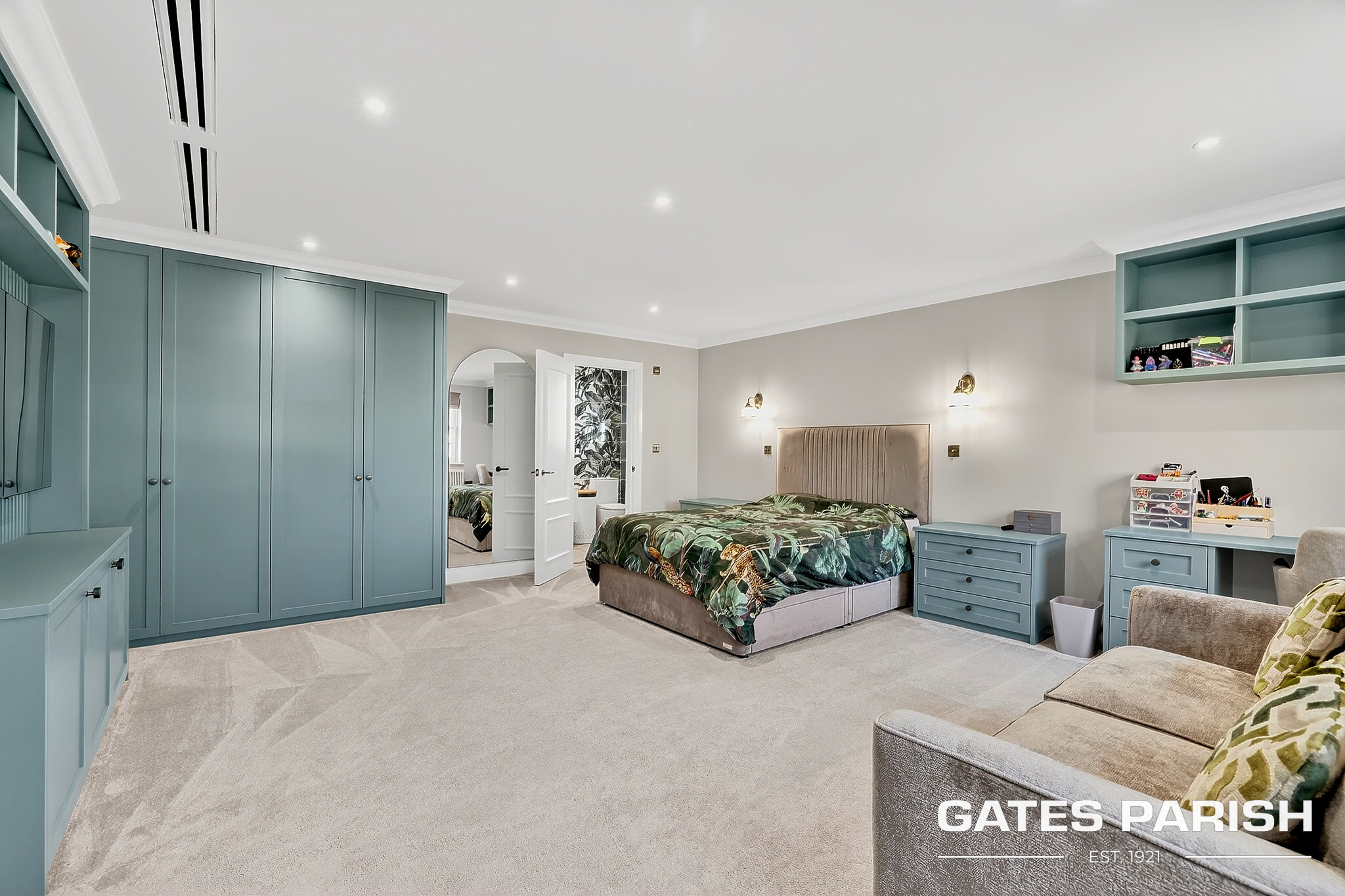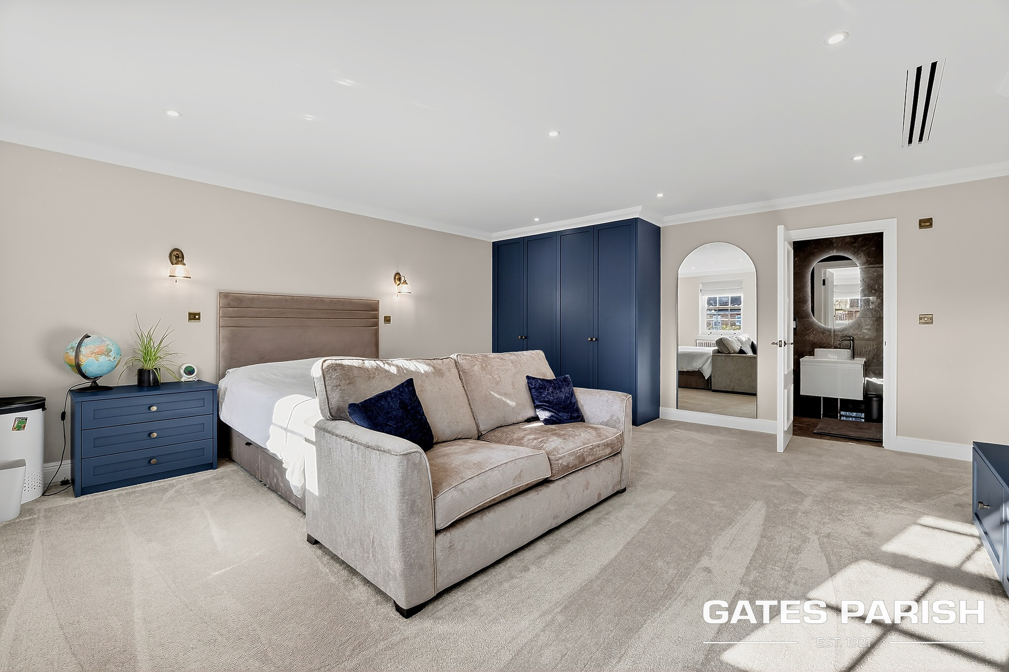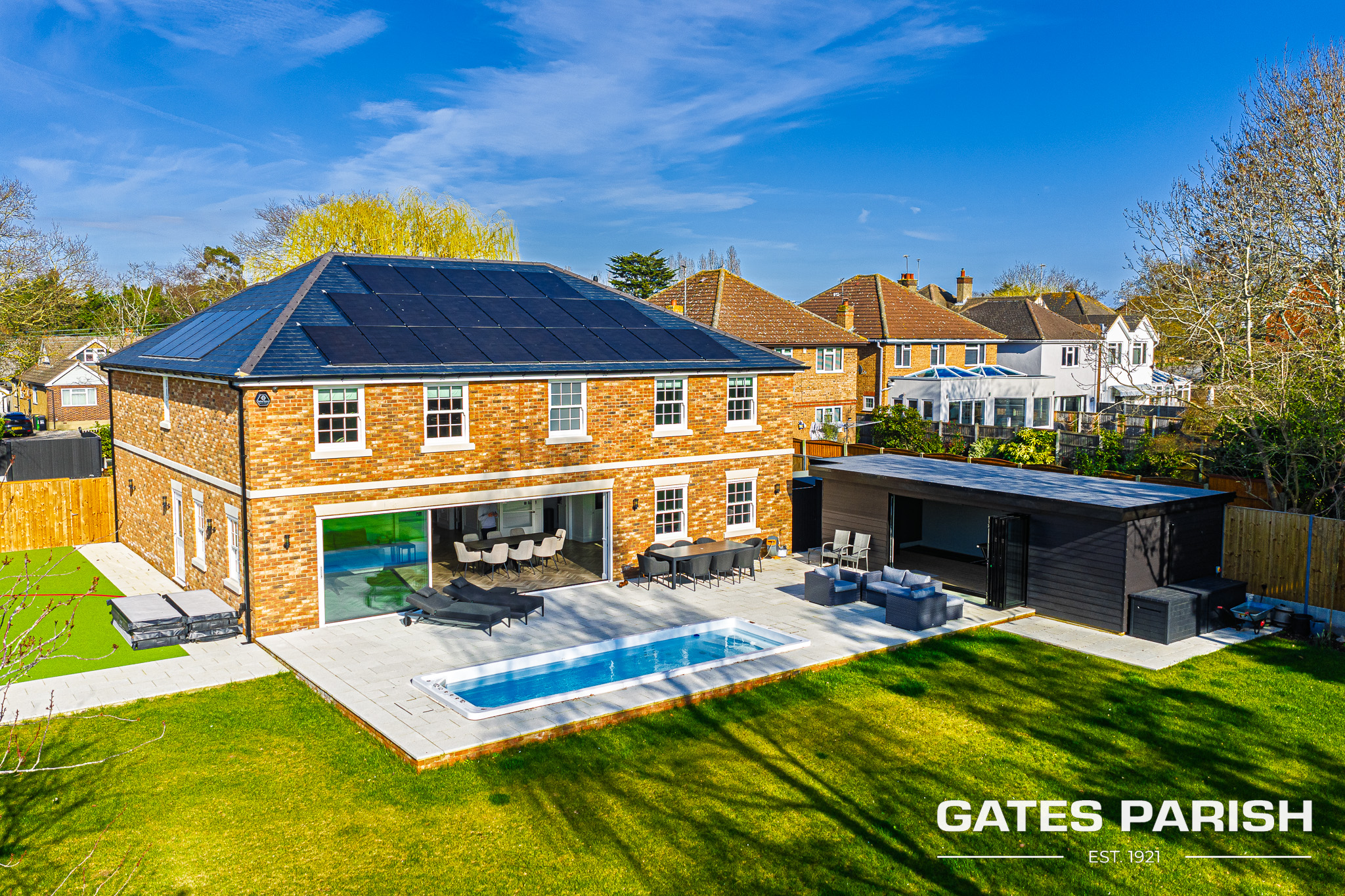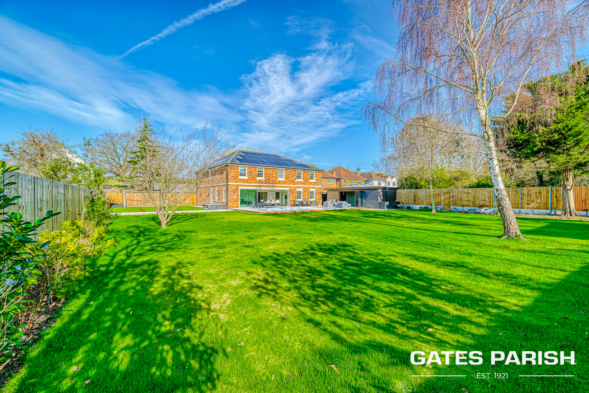The home offers four generous double bedrooms, each with its own luxury en-suite bathroom and bespoke fitted furniture, with air conditioning installed to the kitchen and all bedrooms ensuring year-round comfort. Additional modern technology includes Cat 6 cabling to the lounges and children’s bedrooms, a water softener system, and an impressive solar panel system comprising 31 panels with two 6.25kW battery storage units, enhancing both efficiency and sustainability.