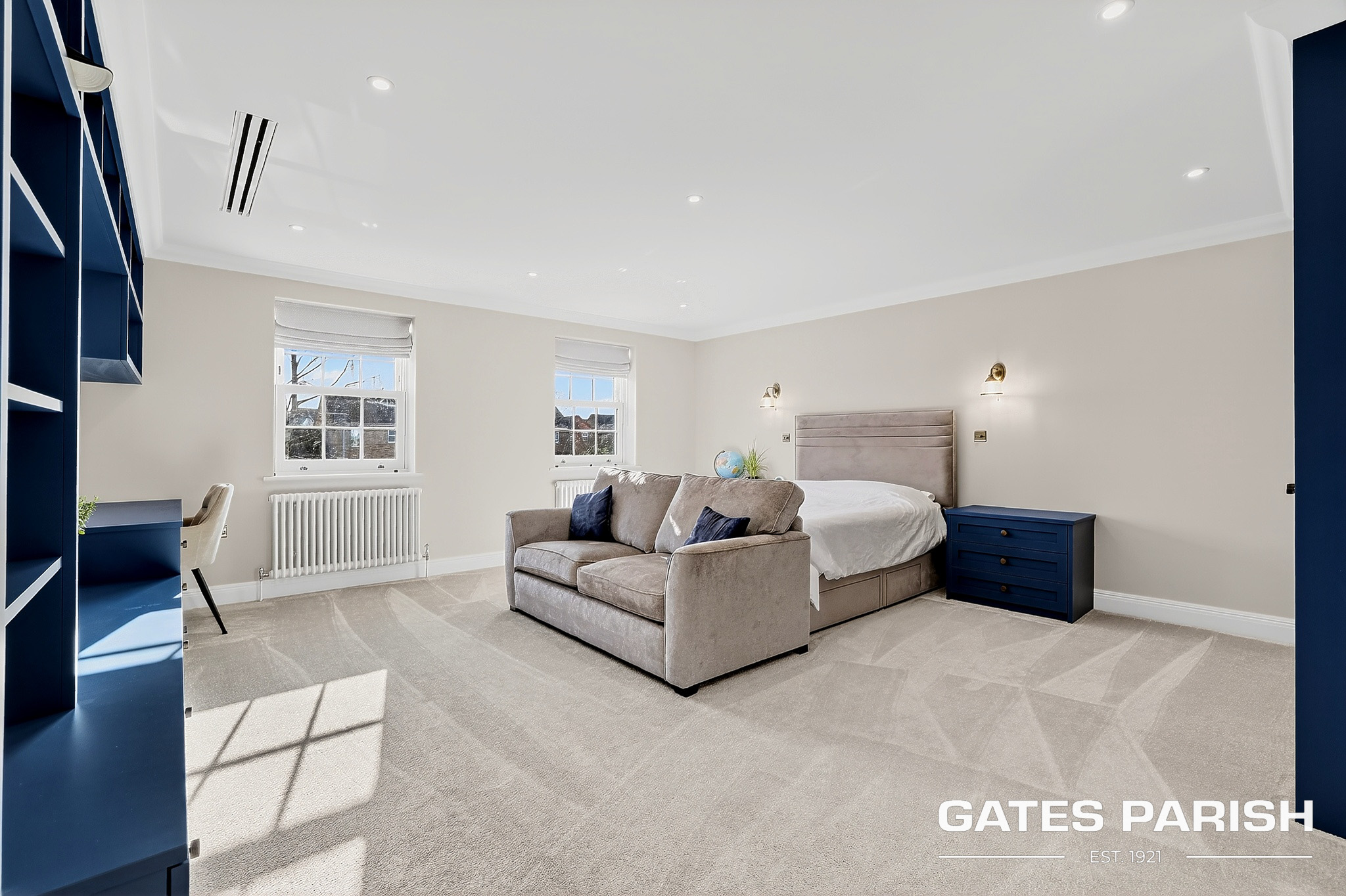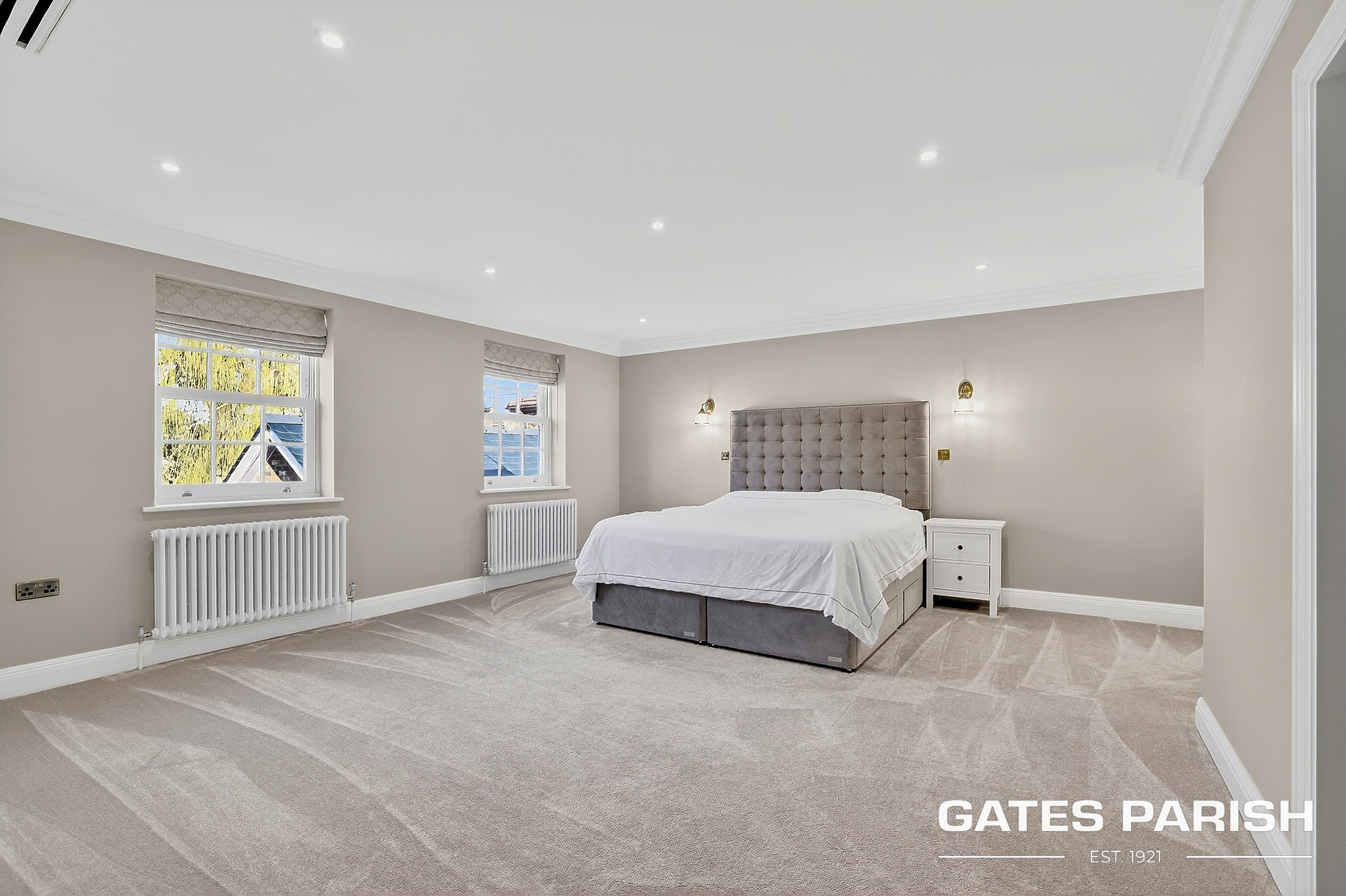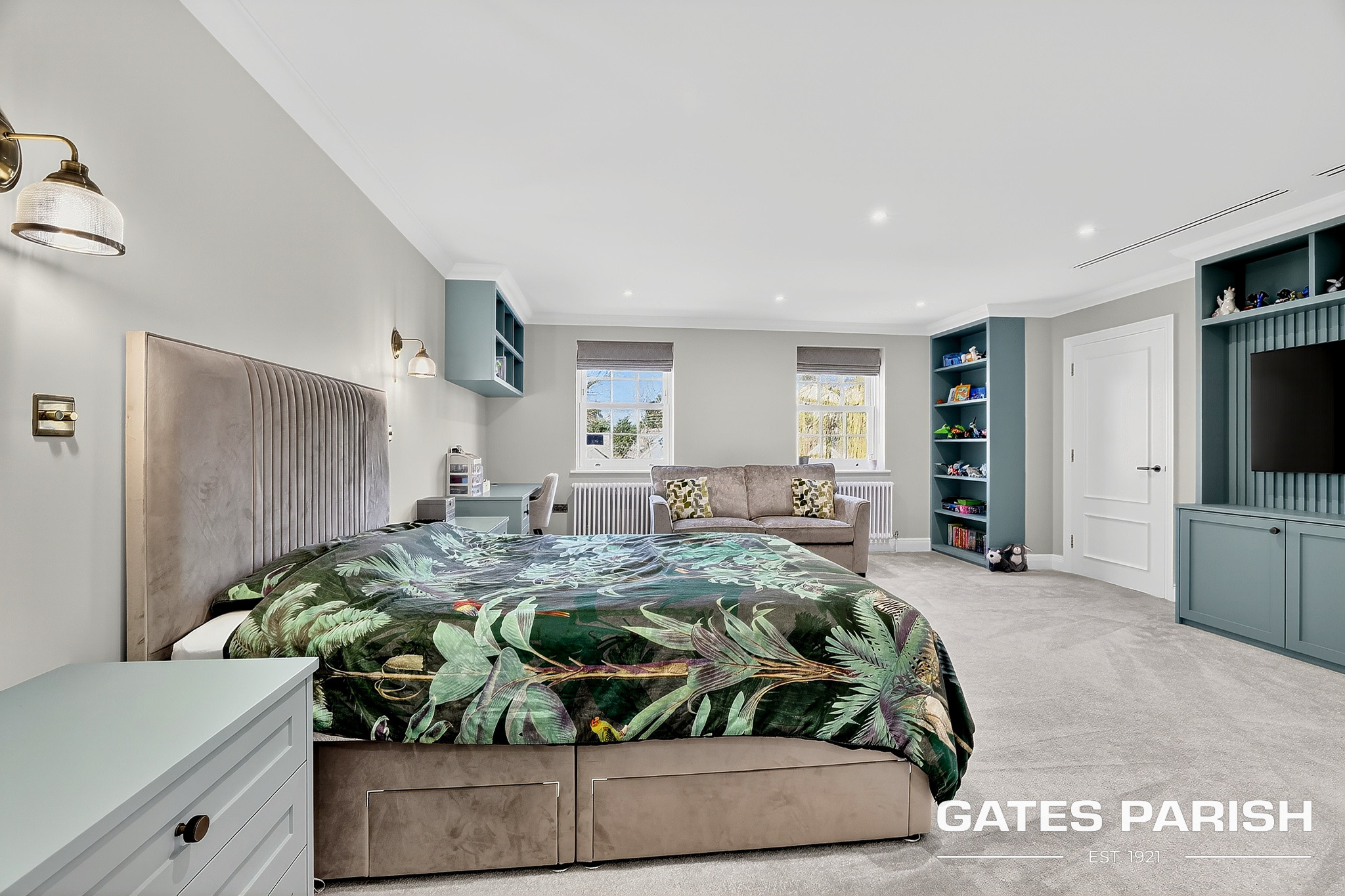 The home offers four generous double bedrooms, each with its own luxury en-suite bathroom and bespoke fitted furniture, with air conditioning installed to the kitchen and all bedrooms ensuring year-round comfort. Additional modern technology includes Cat 6 cabling to the lounges and children’s bedrooms, a water softener system, and an impressive solar panel system comprising 31 panels with two 6.25kW battery storage units, enhancing both efficiency and sustainability.