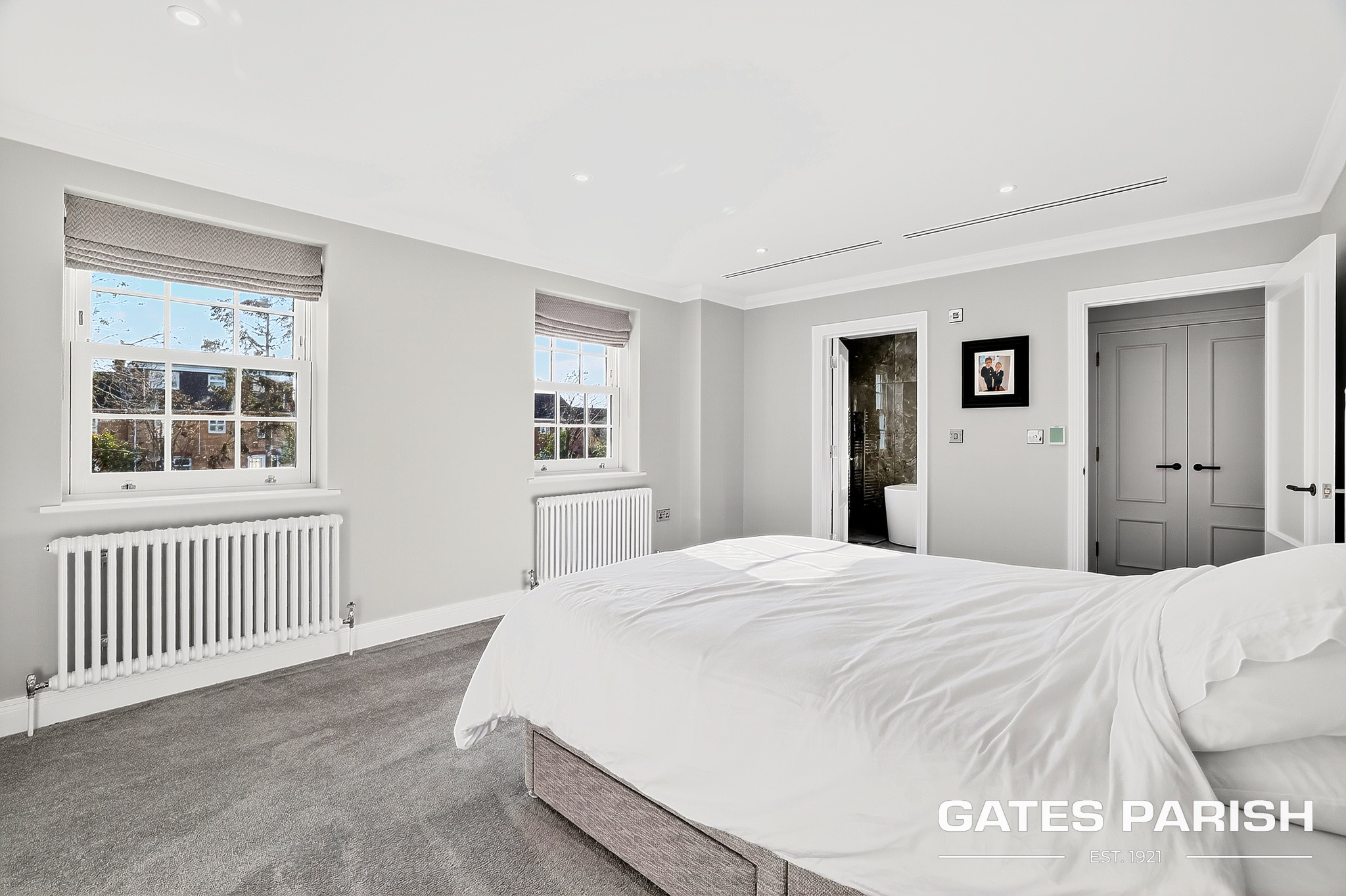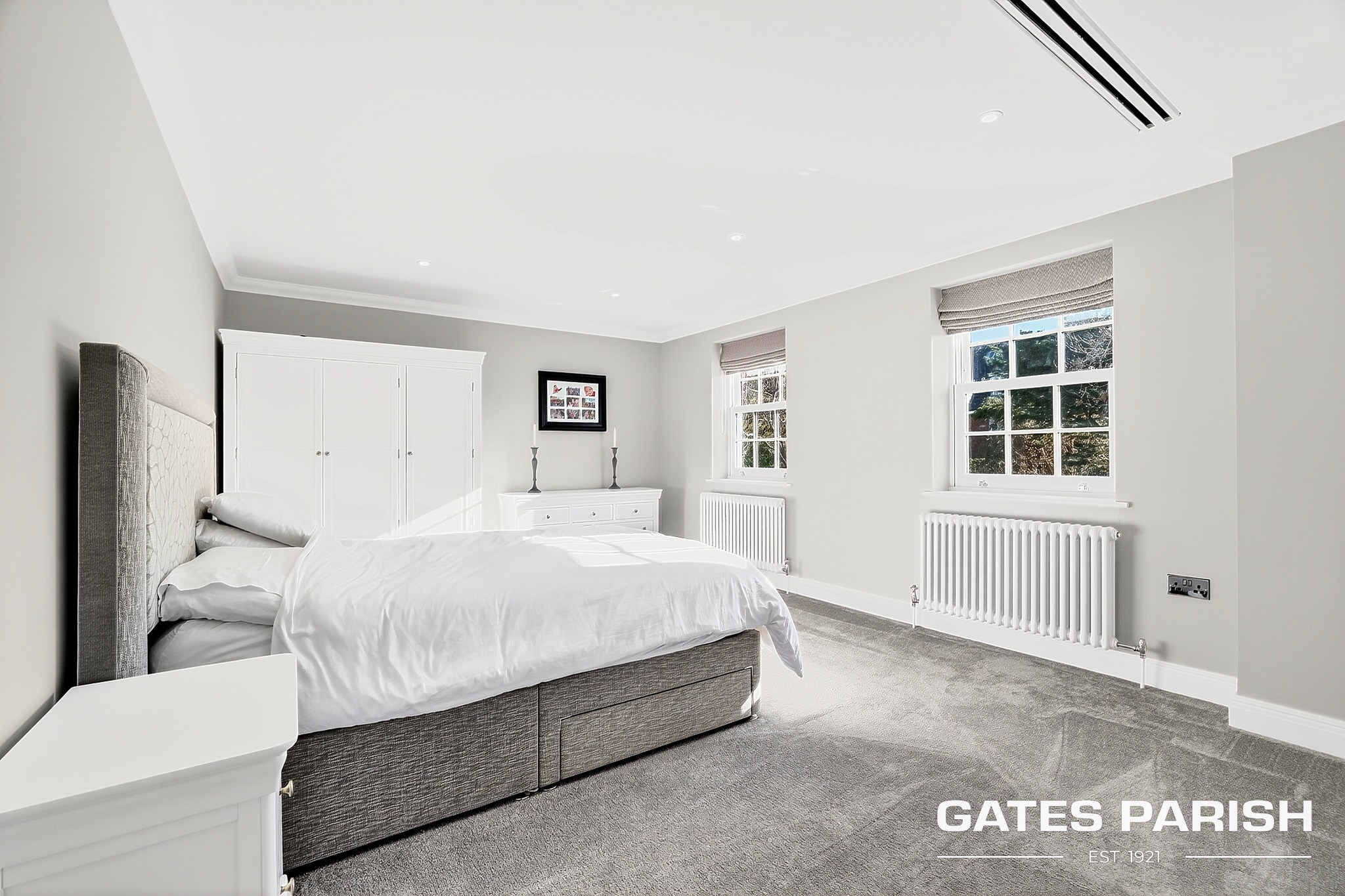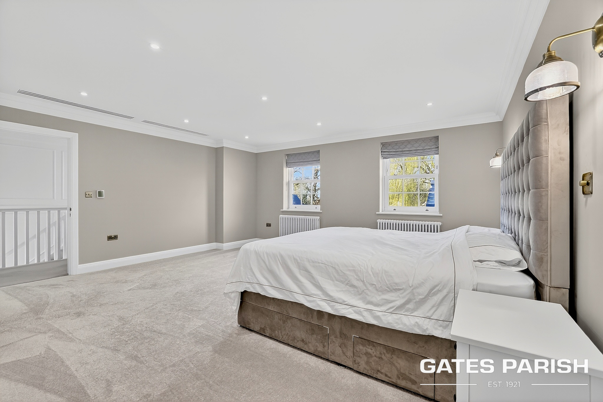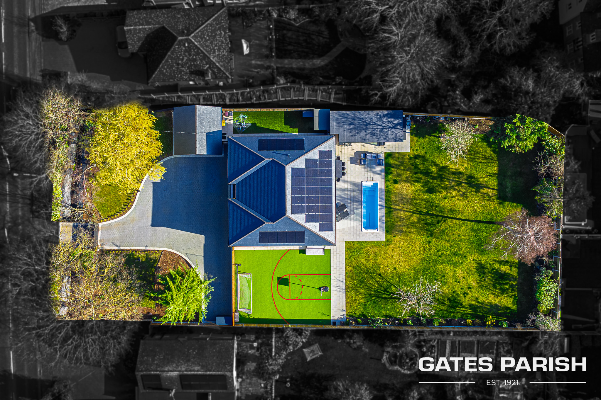 The home offers four generous double bedrooms, each with its own luxury en-suite bathroom and bespoke fitted furniture, with air conditioning installed to the kitchen and all bedrooms ensuring year-round comfort. Additional modern technology includes Cat 6 cabling to the lounges and children’s bedrooms, a water softener system, and an impressive solar panel system comprising 31 panels with two 6.25kW battery storage units, enhancing both efficiency and sustainability.