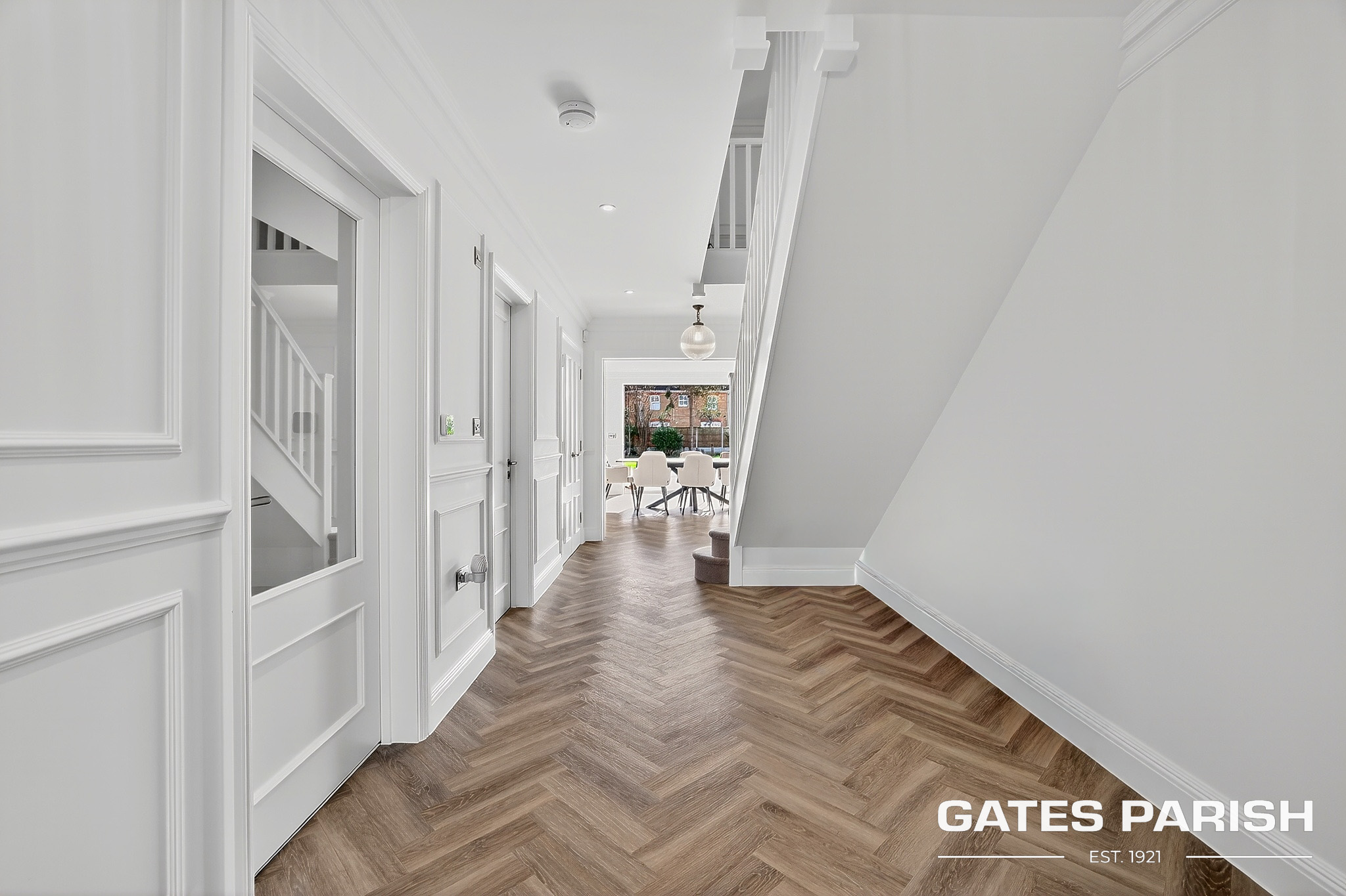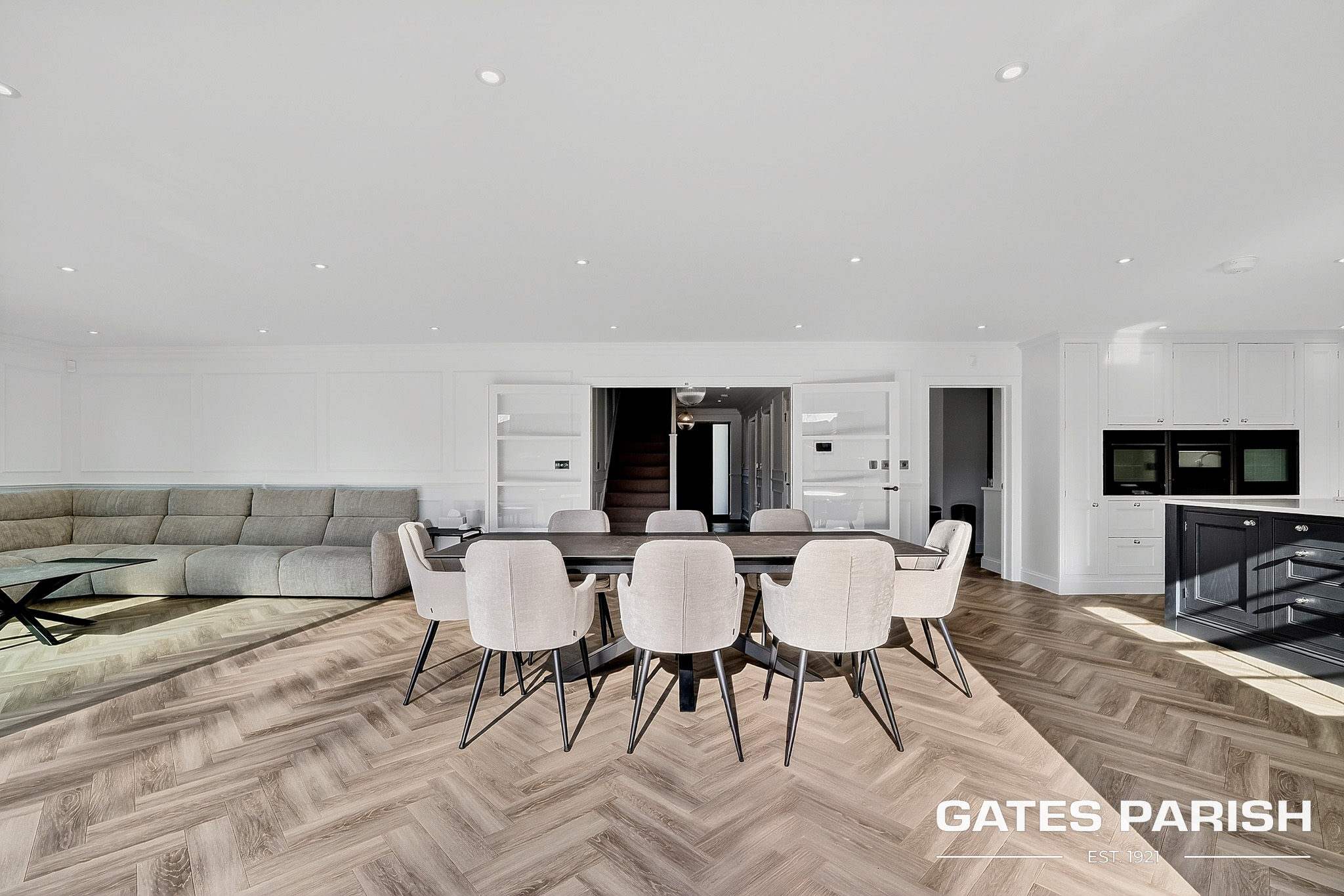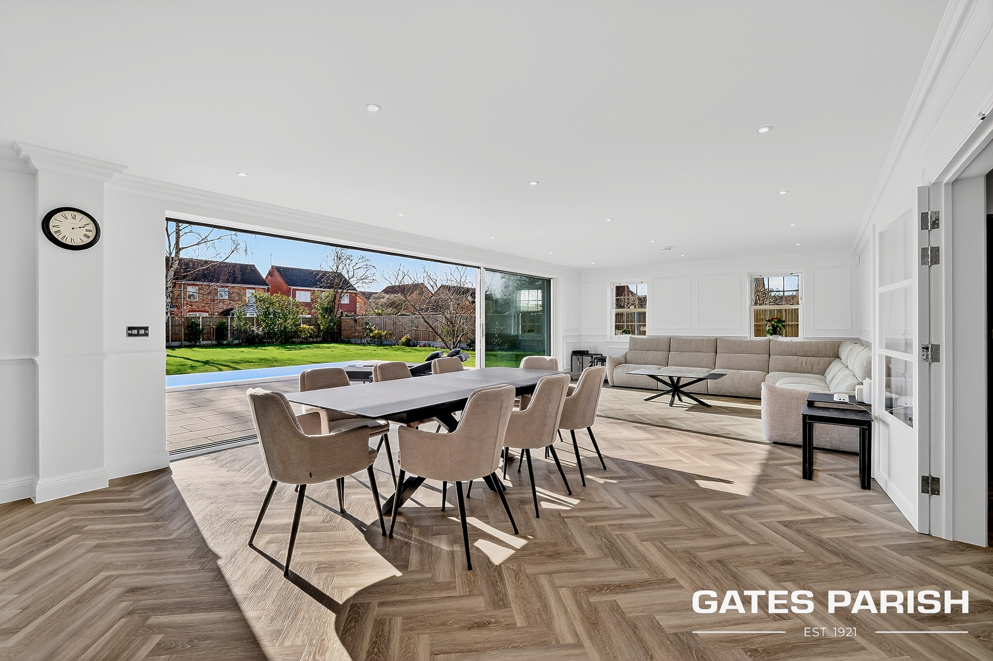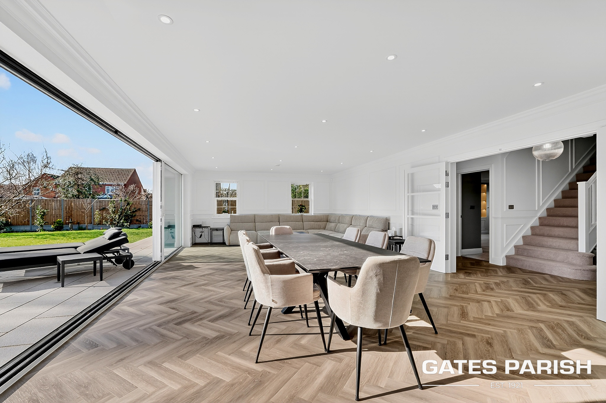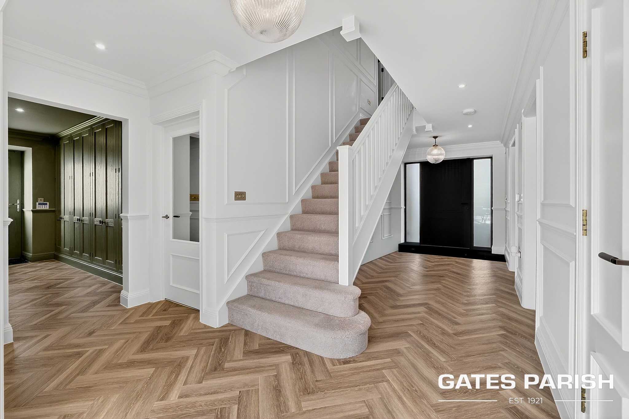 Approached via electric gated entrance, the home immediately impresses with its striking presence and exceptional craftsmanship. Upon entering through the RK front door, you are welcomed into an elegant interior where Amtico herringbone flooring flows through the main living areas, setting the tone for the quality found throughout the property.