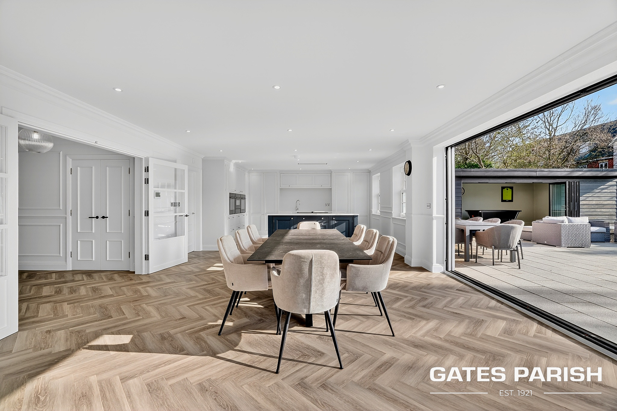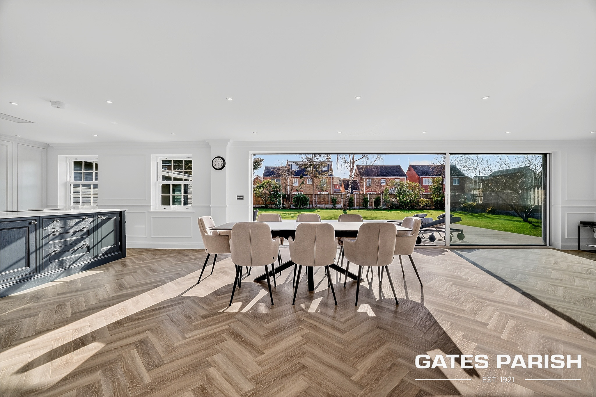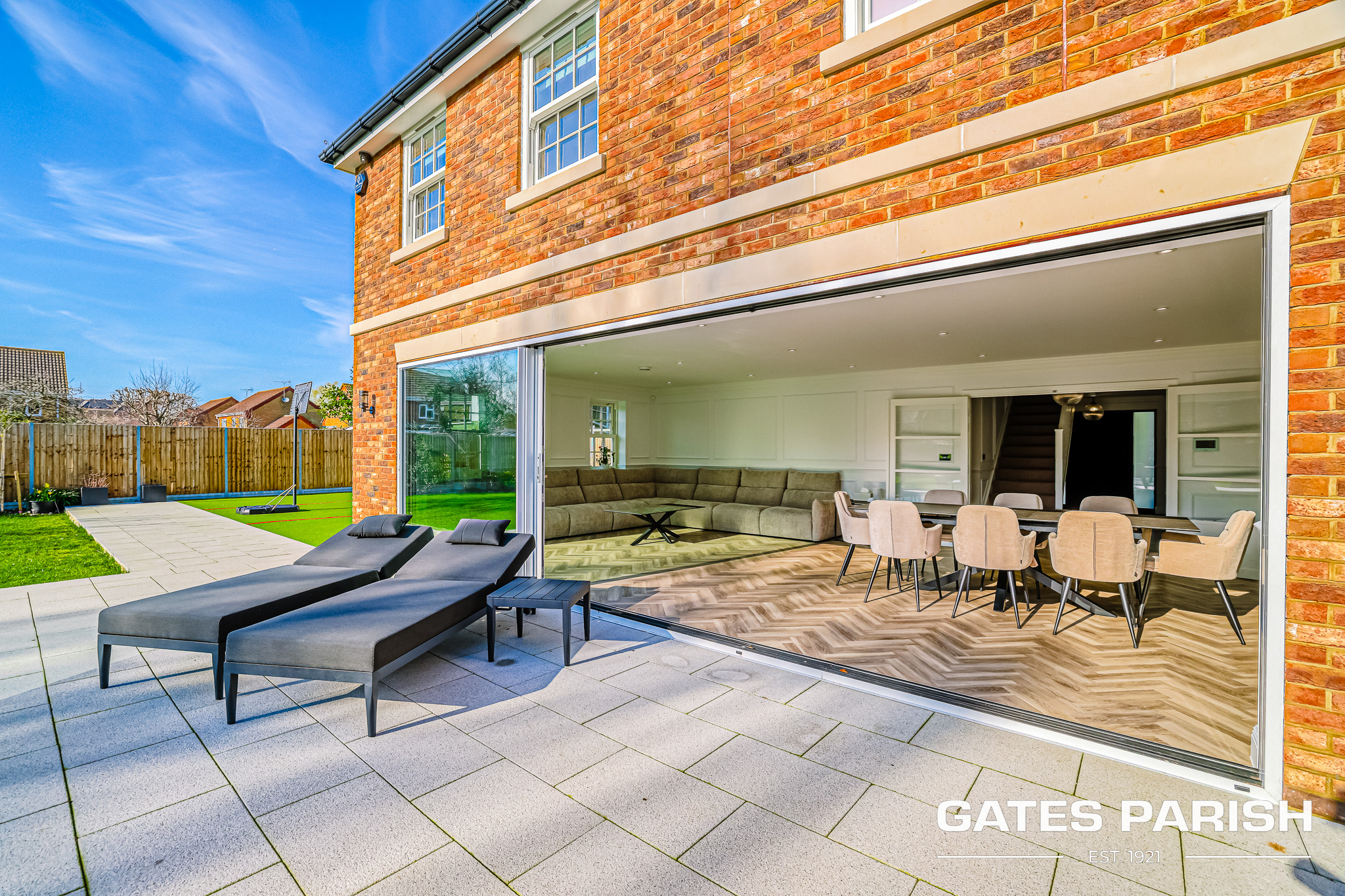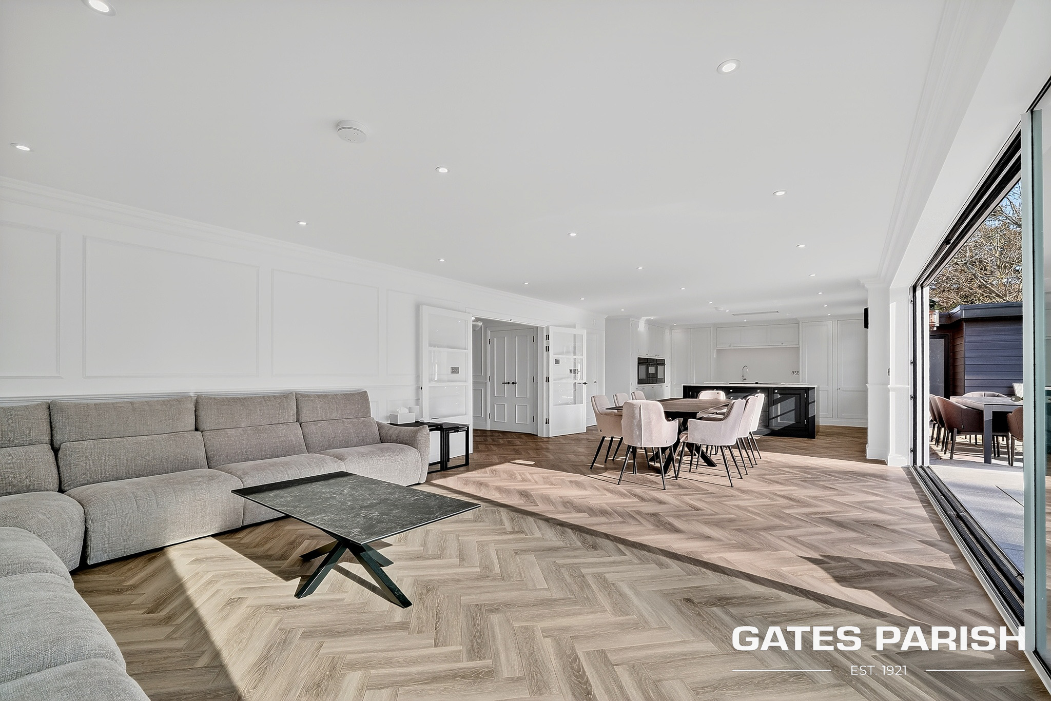 Approached via electric gated entrance, the home immediately impresses with its striking presence and exceptional craftsmanship. Upon entering through the RK front door, you are welcomed into an elegant interior where Amtico herringbone flooring flows through the main living areas, setting the tone for the quality found throughout the property.