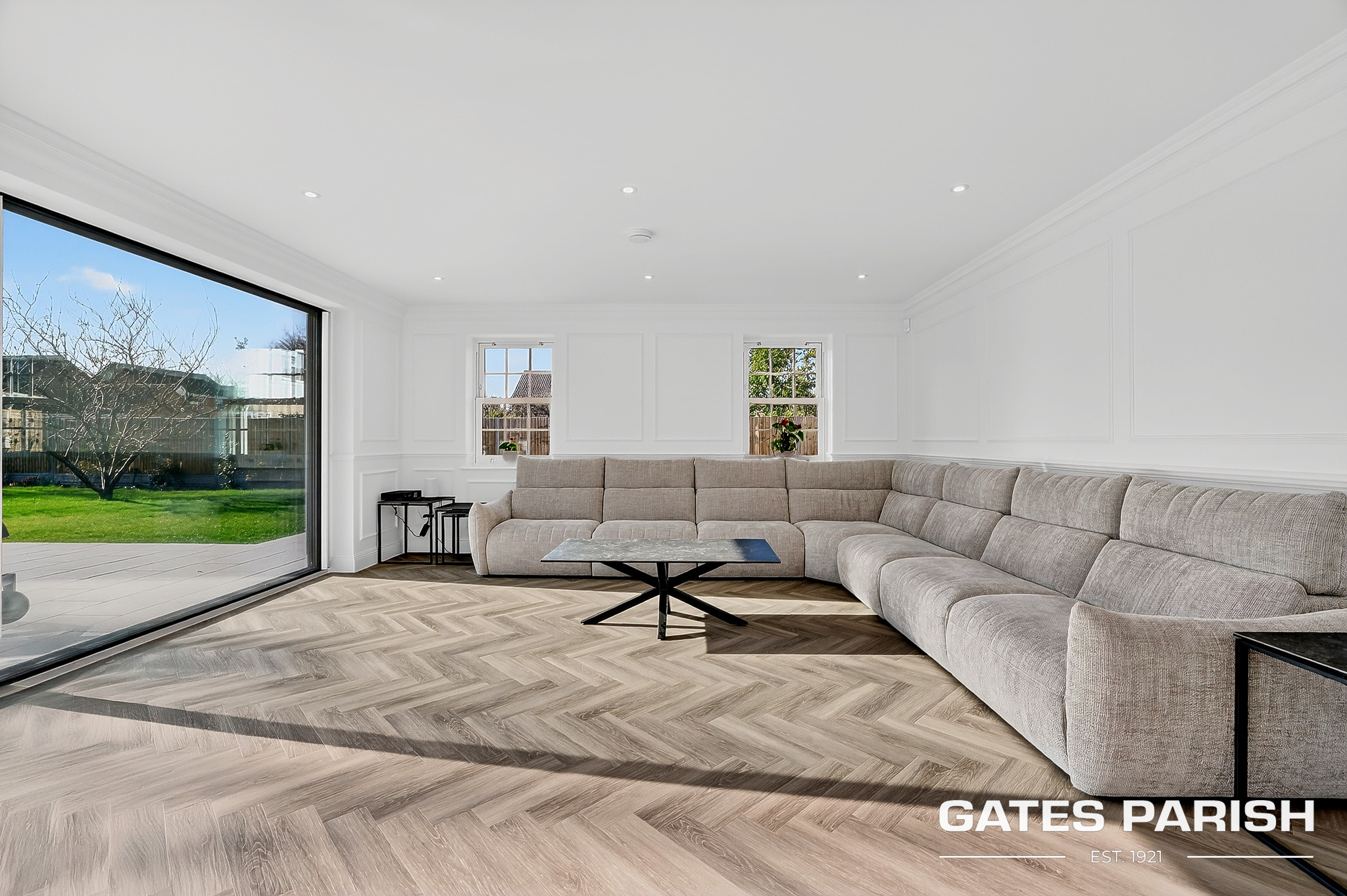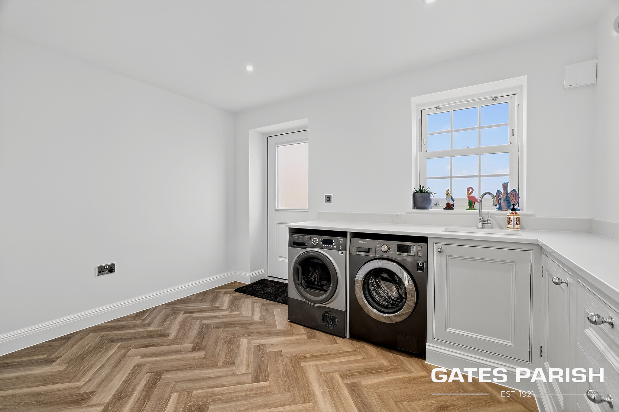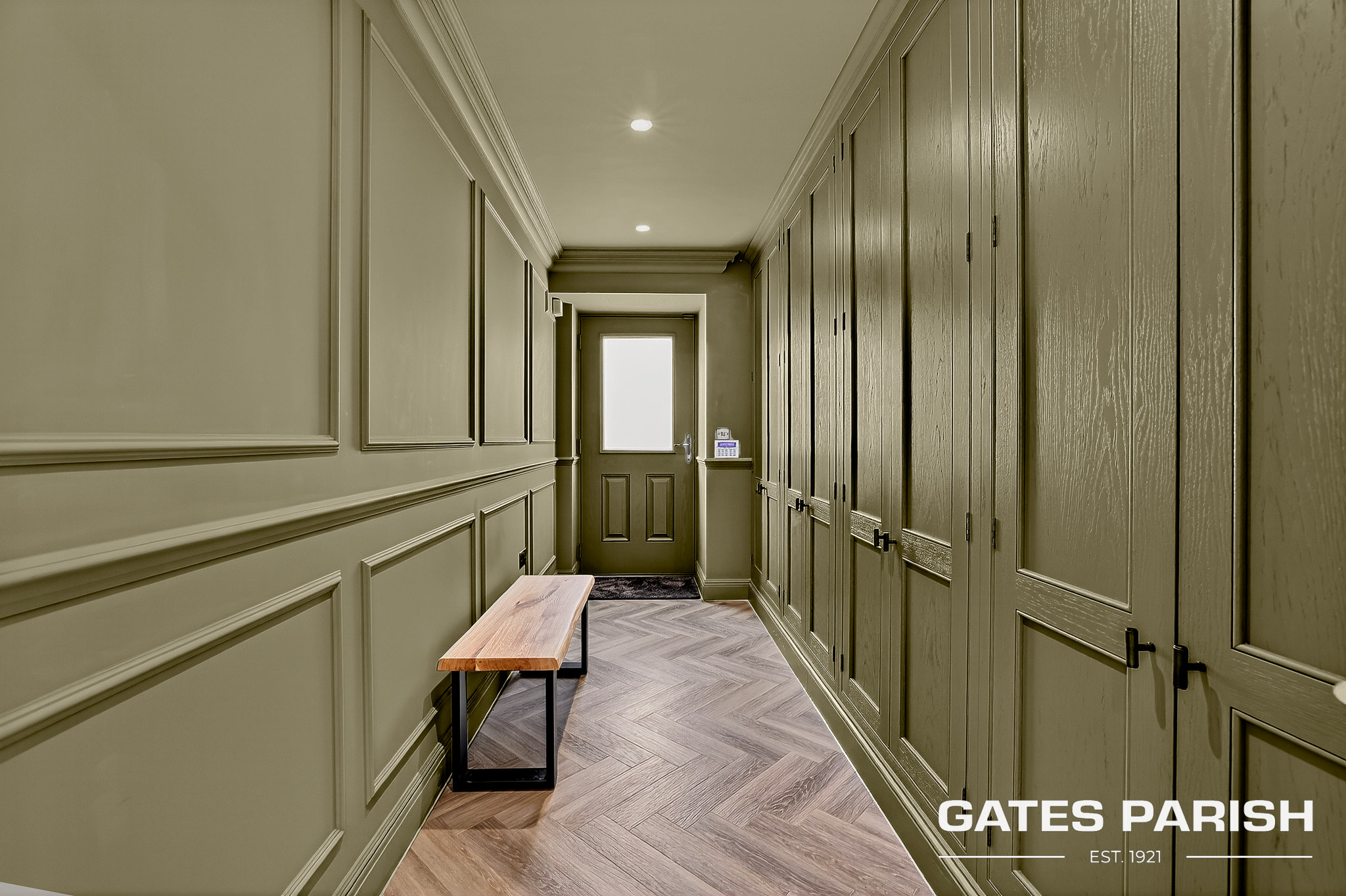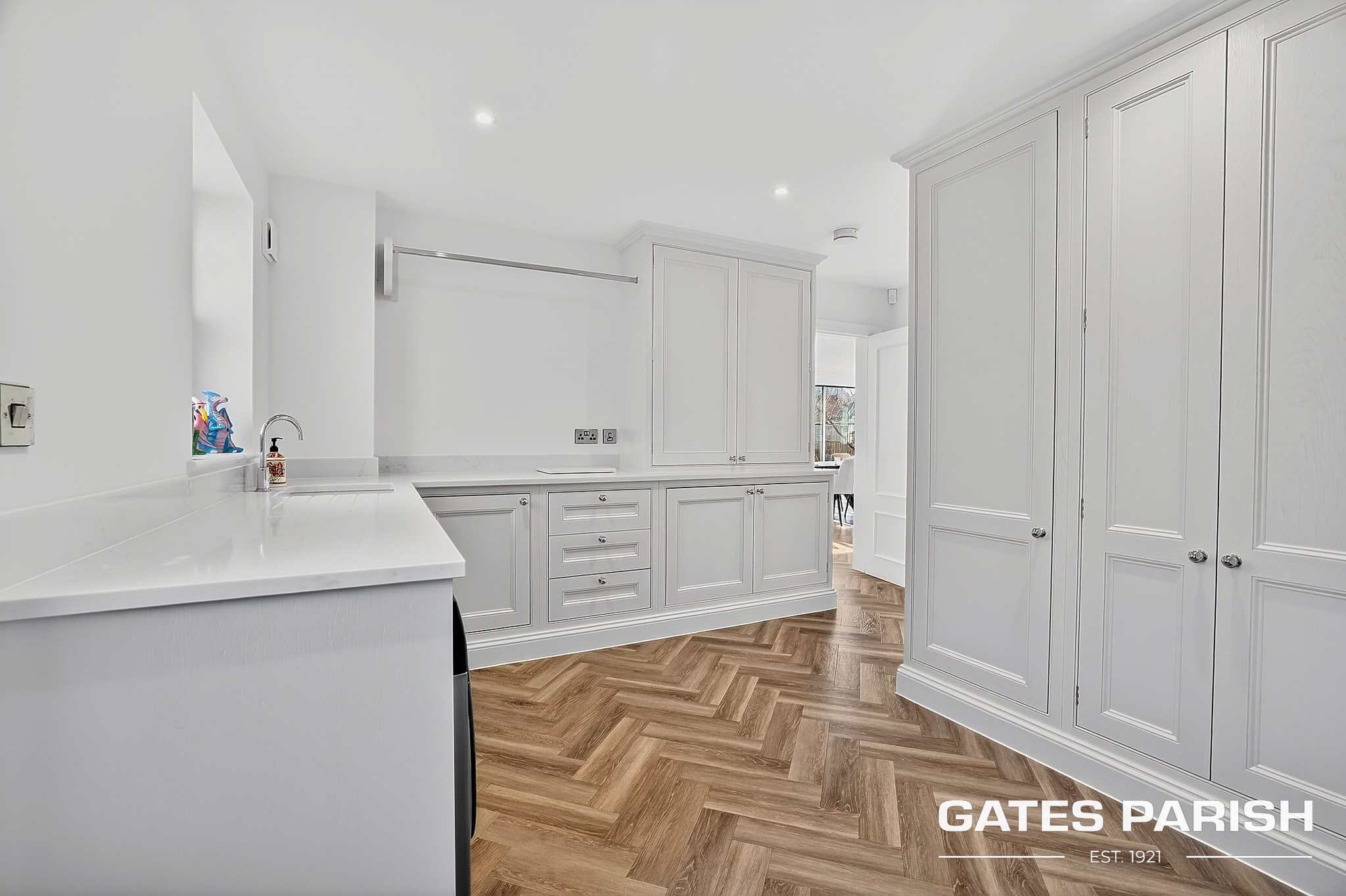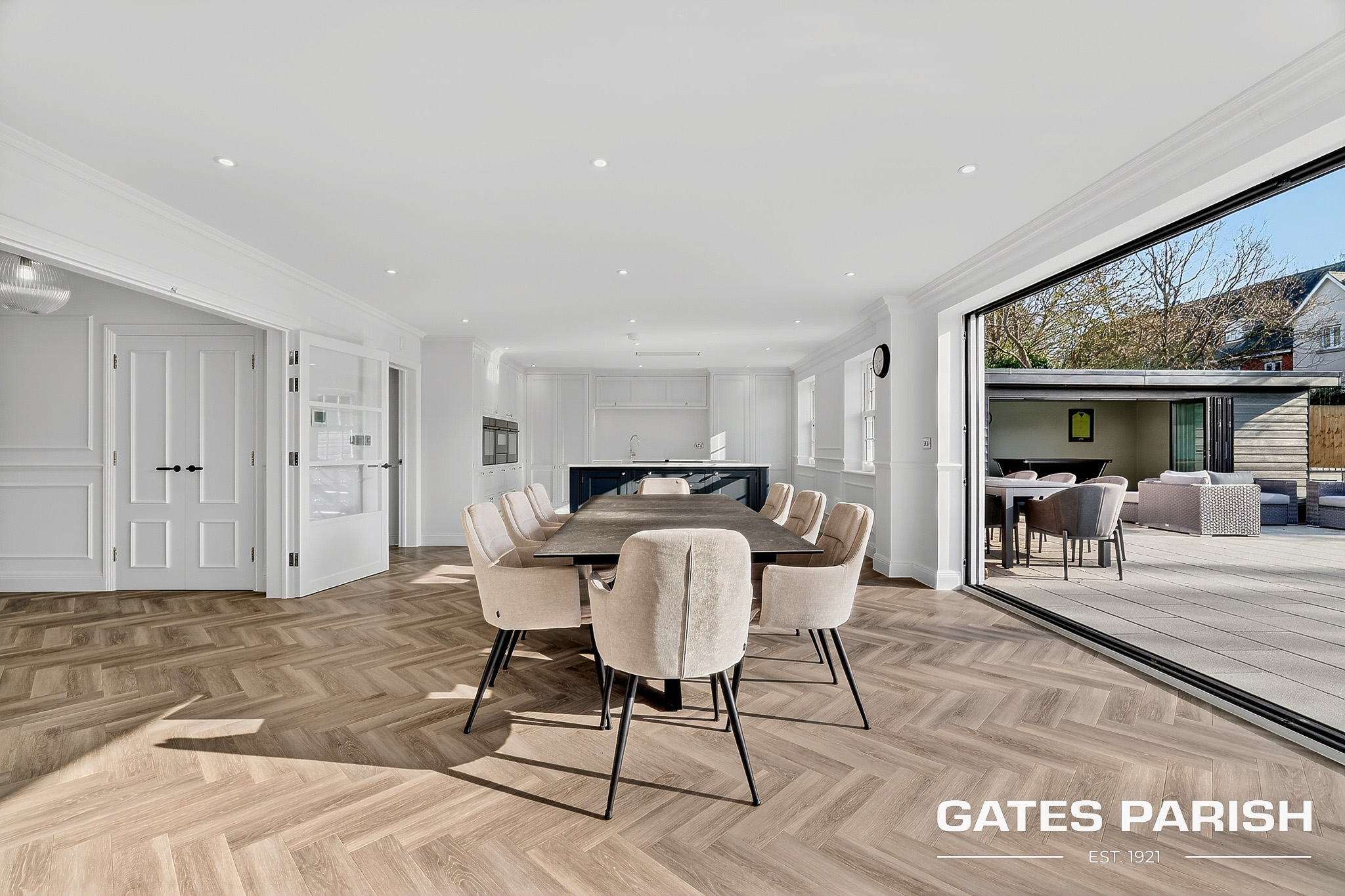 Approached via electric gated entrance, the home immediately impresses with its striking presence and exceptional craftsmanship. Upon entering through the RK front door, you are welcomed into an elegant interior where Amtico herringbone flooring flows through the main living areas, setting the tone for the quality found throughout the property.