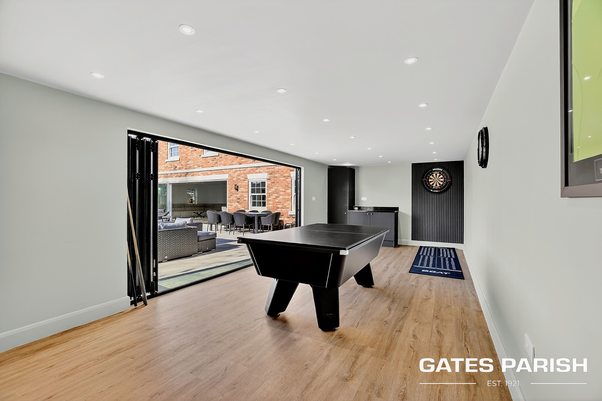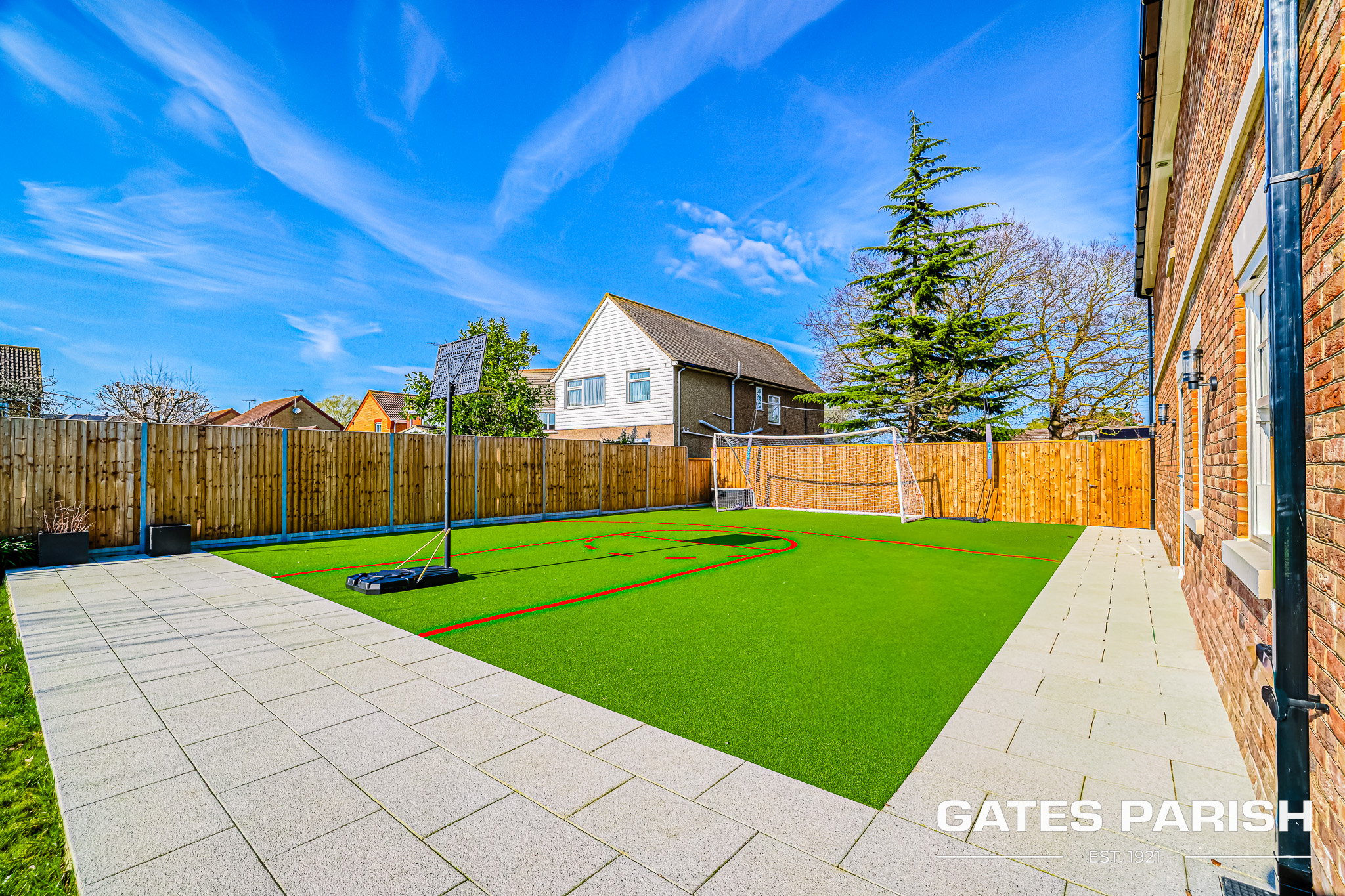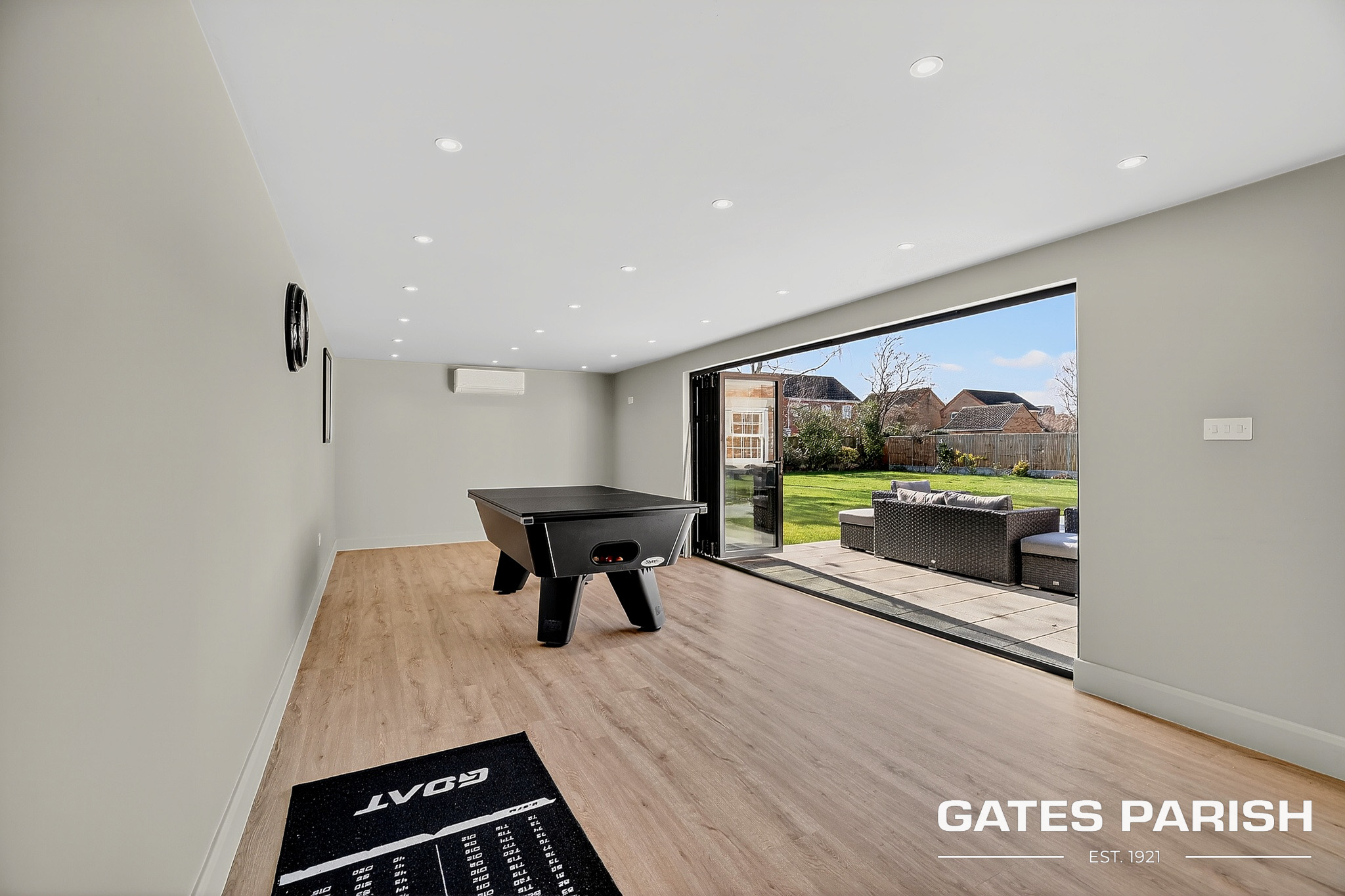 Externally, the property sits on a stunning south-facing landscaped plot, thoughtfully designed to create a private leisure retreat. The impressive outdoor space features a beautiful patio area, a heated swim spa with jacuzzi, and a dedicated Astro pitch. For entertainment and recreation, the property also benefits from a games room with WC, a gym area with golf simulator, and air conditioning to the games room.