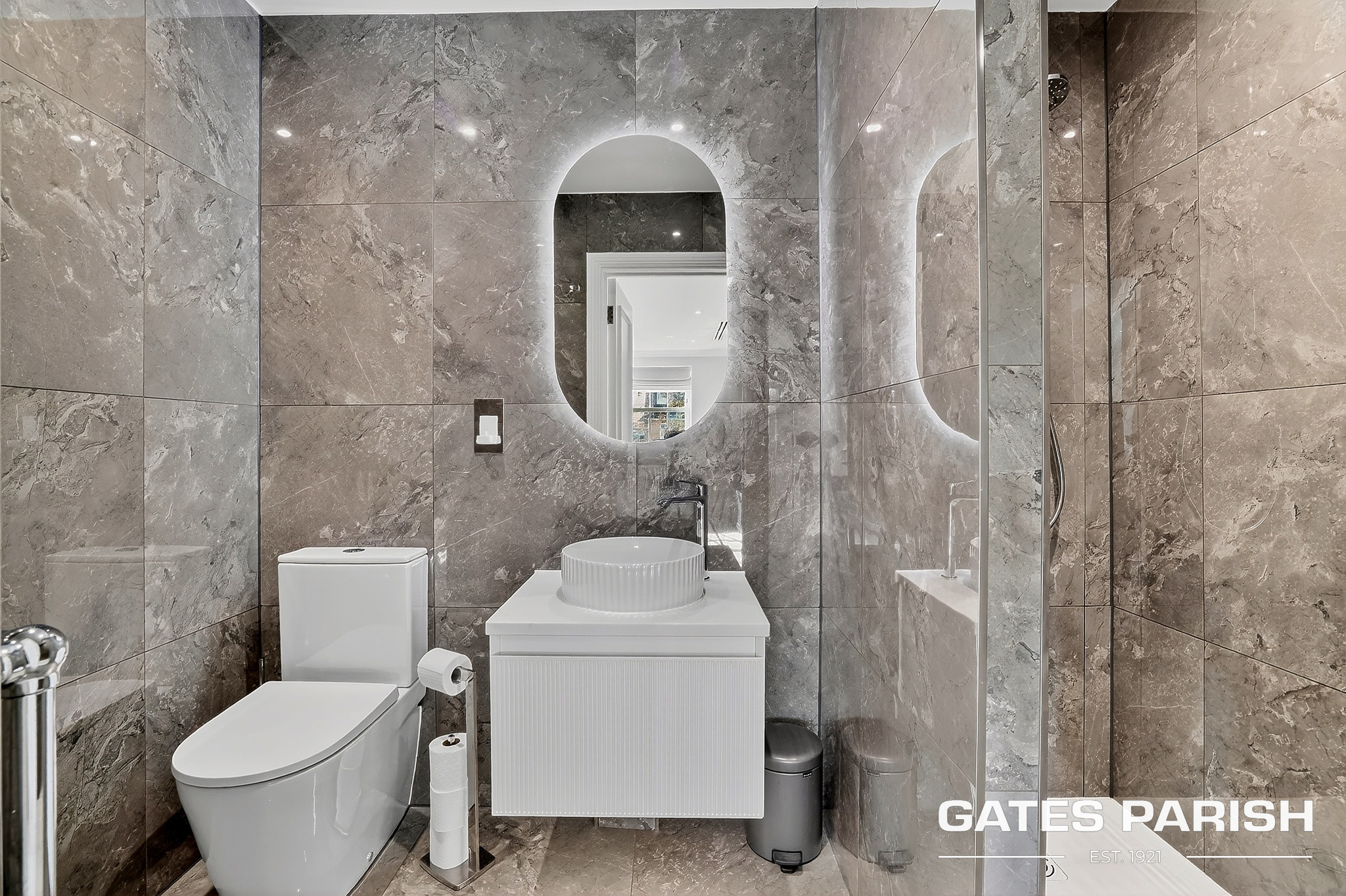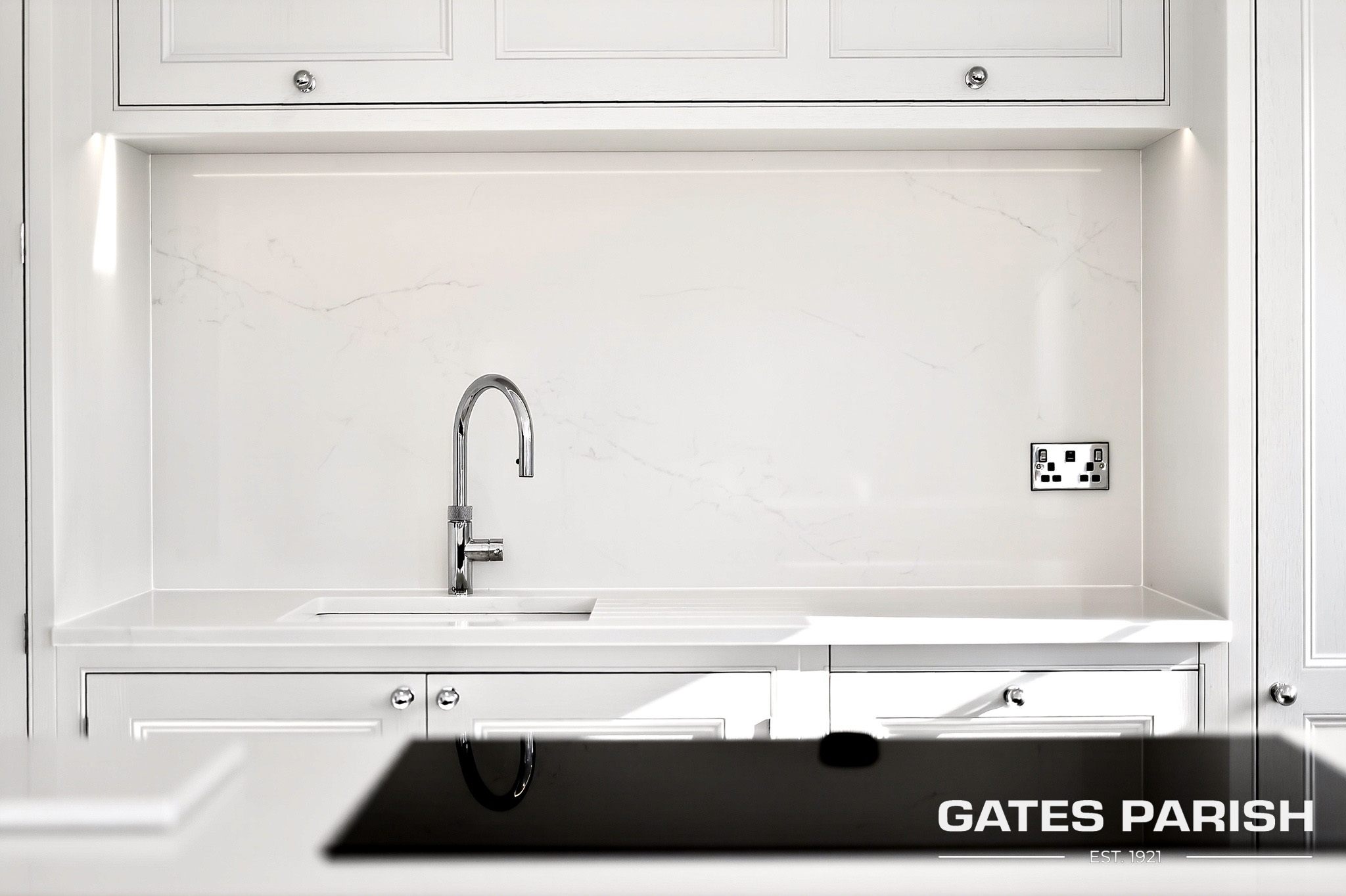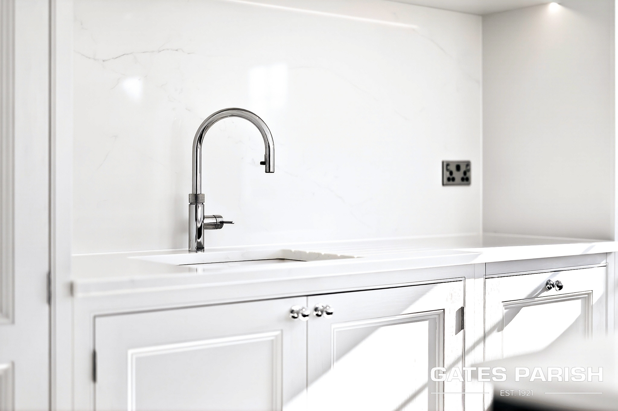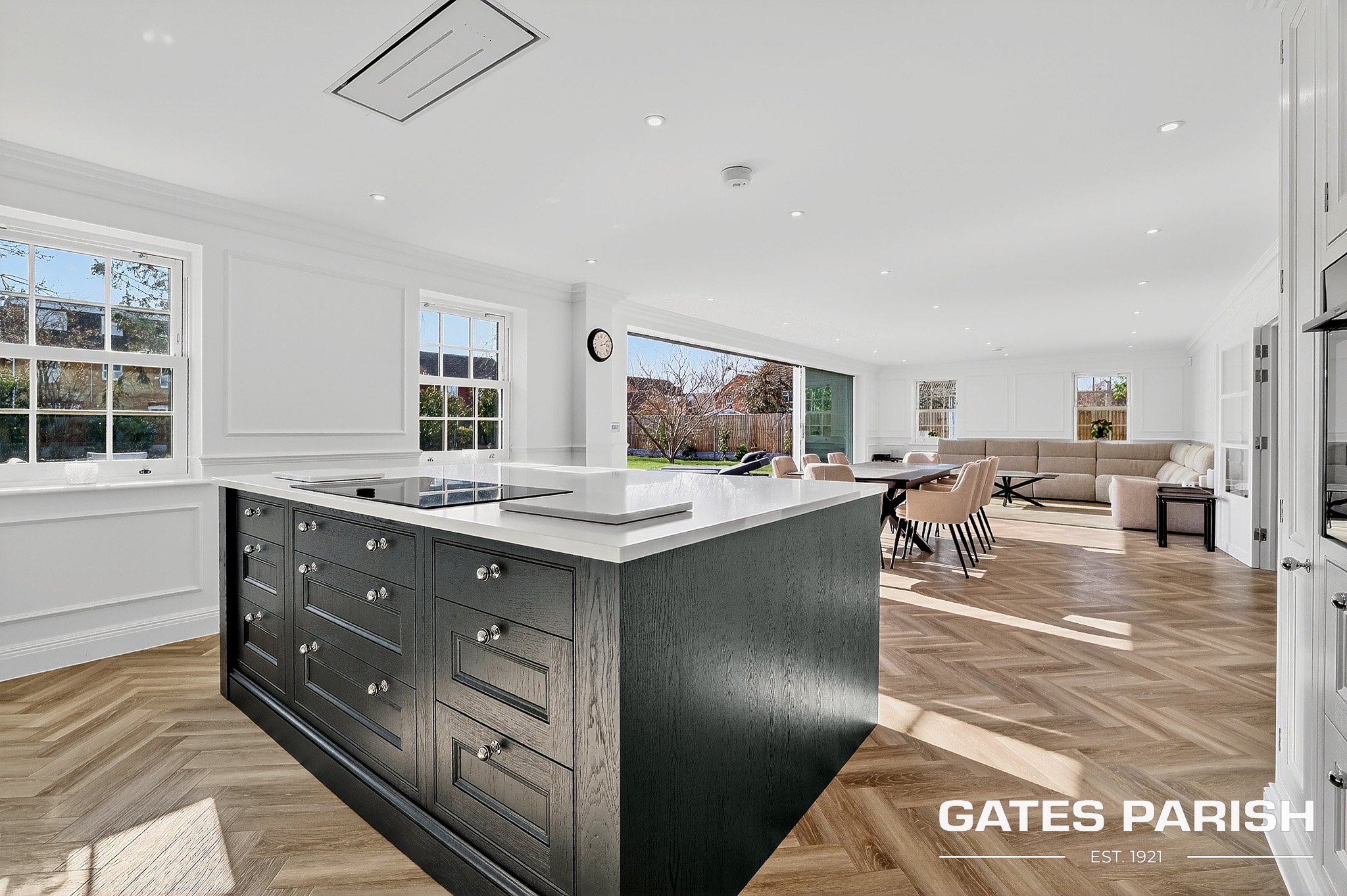 At the heart of the home lies a spectacular open-plan bespoke kitchen and living space, designed for both everyday living and entertaining. The kitchen is fitted with high-end appliances including Neff appliances, a Quooker tap providing boiling, chilled and sparkling water, and bespoke cabinetry that perfectly complements the contemporary design. Large open living areas create a seamless connection between indoor and outdoor spaces.