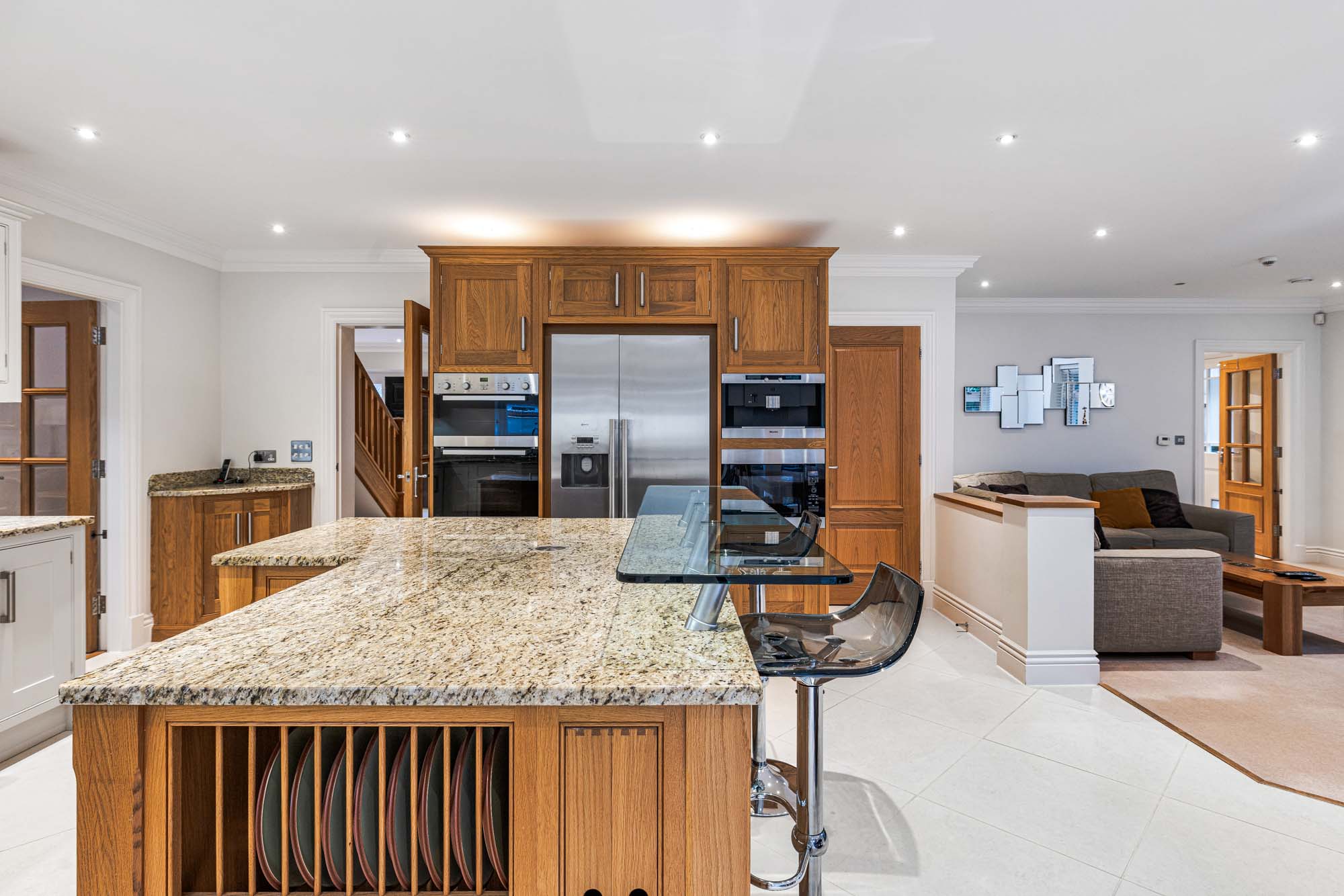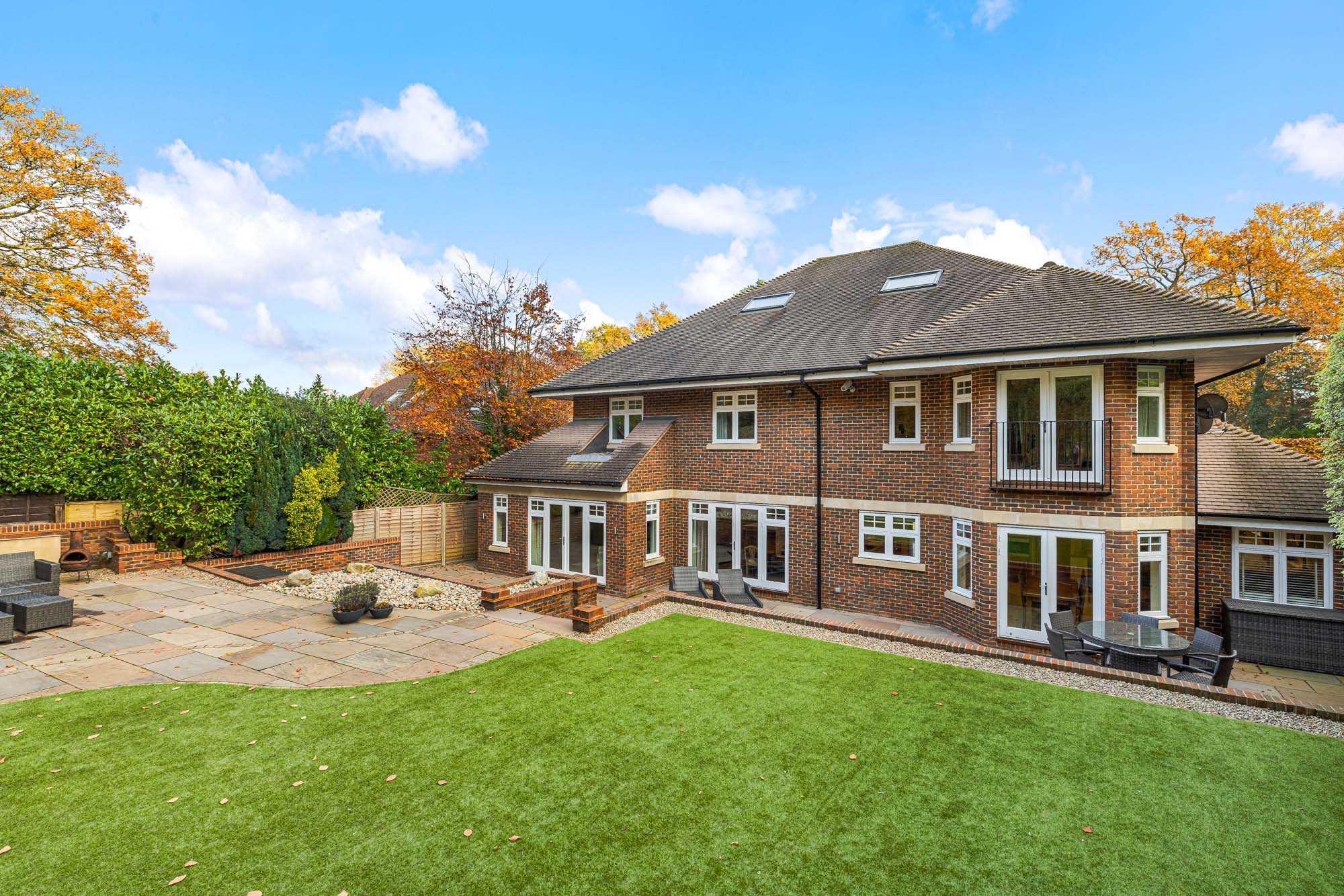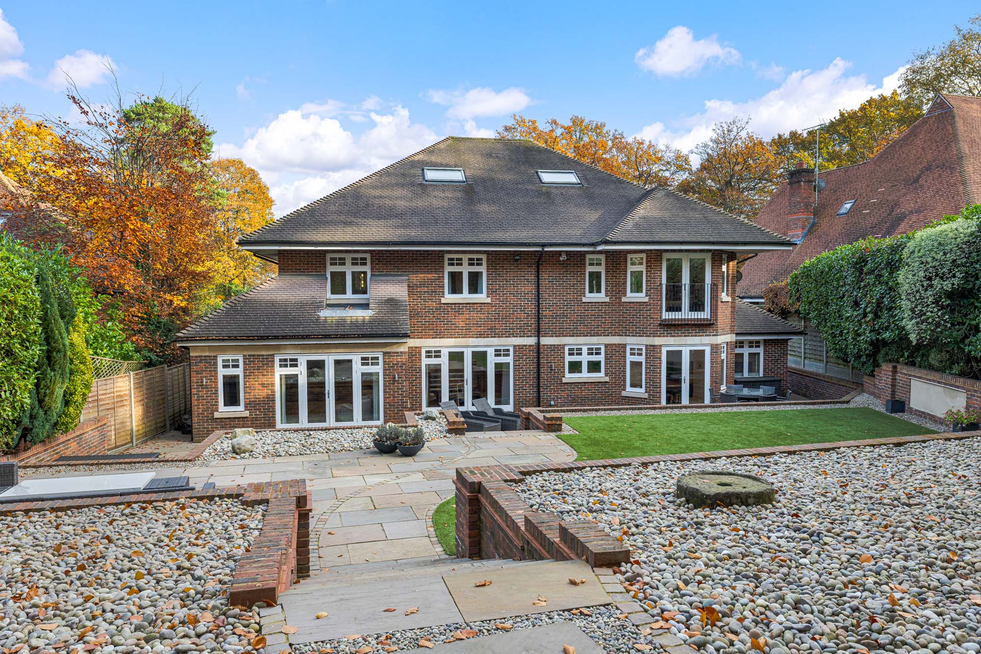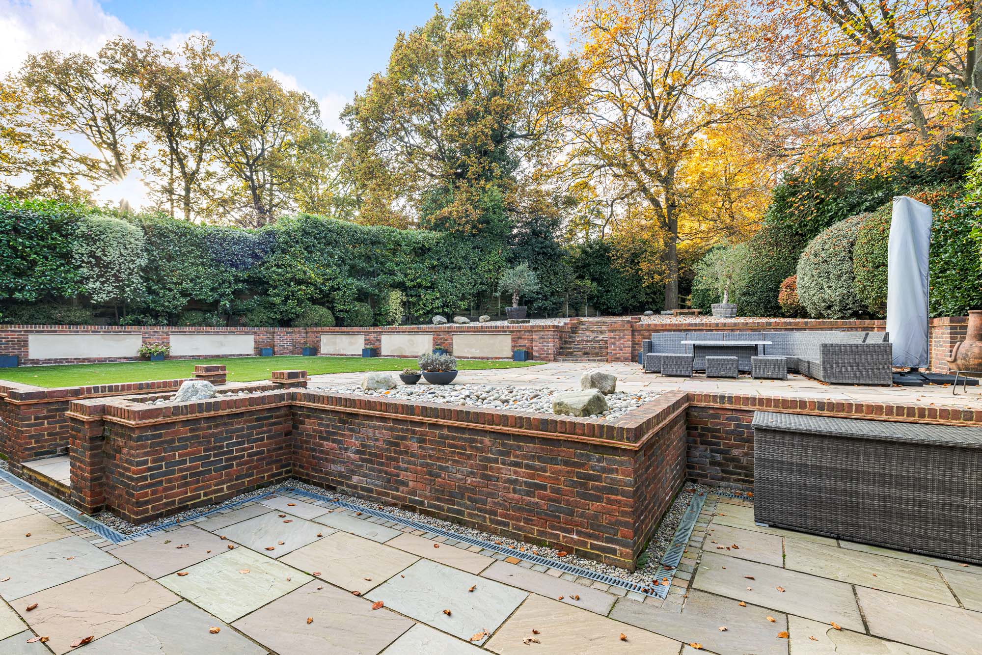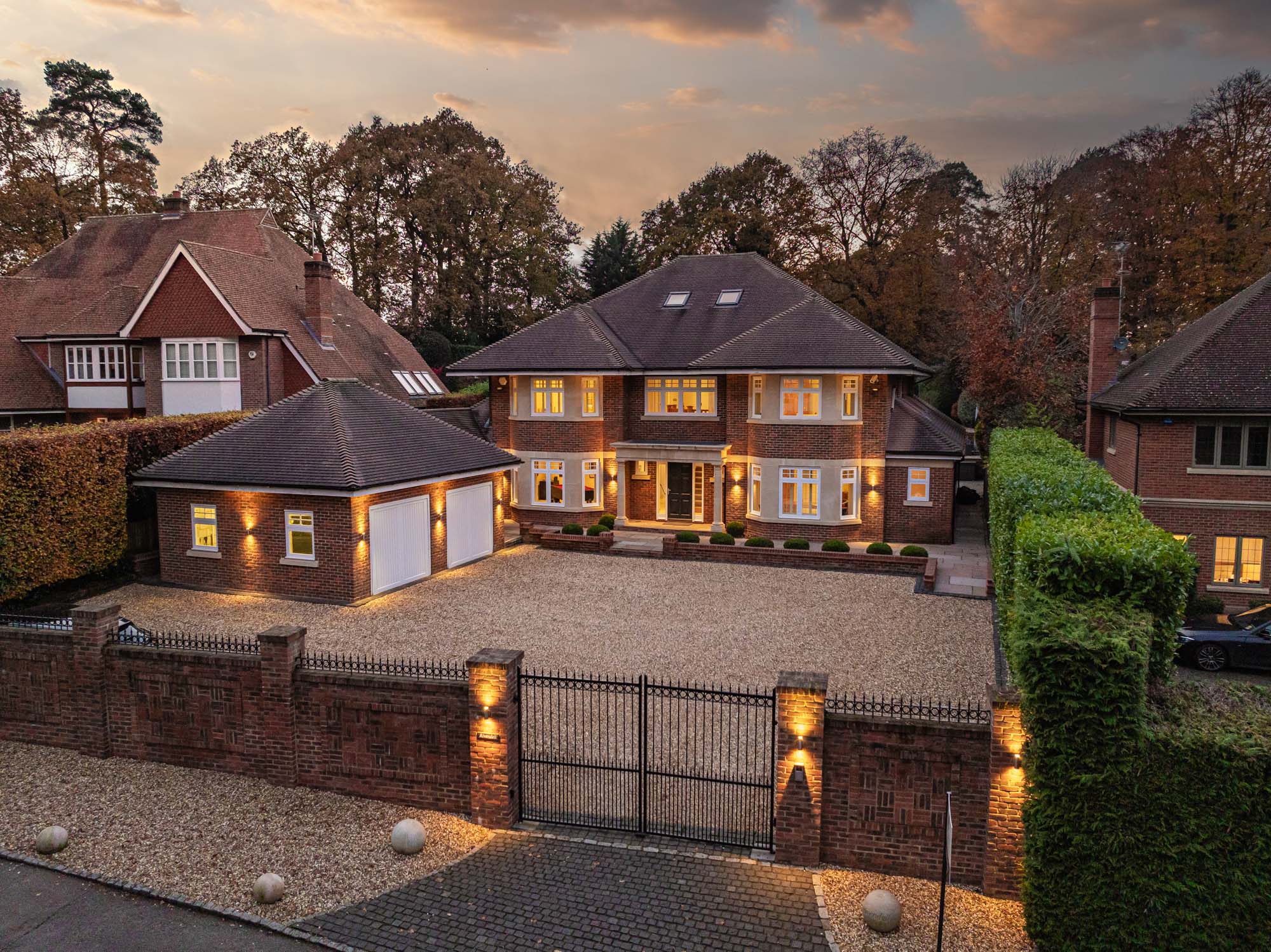 This home features an attractive design with security gates, extensive living space over 5000 sq. ft., multiple reception rooms, and four double bedrooms with en suites. The garden is landscaped with a large patio terrace and a wooded area.