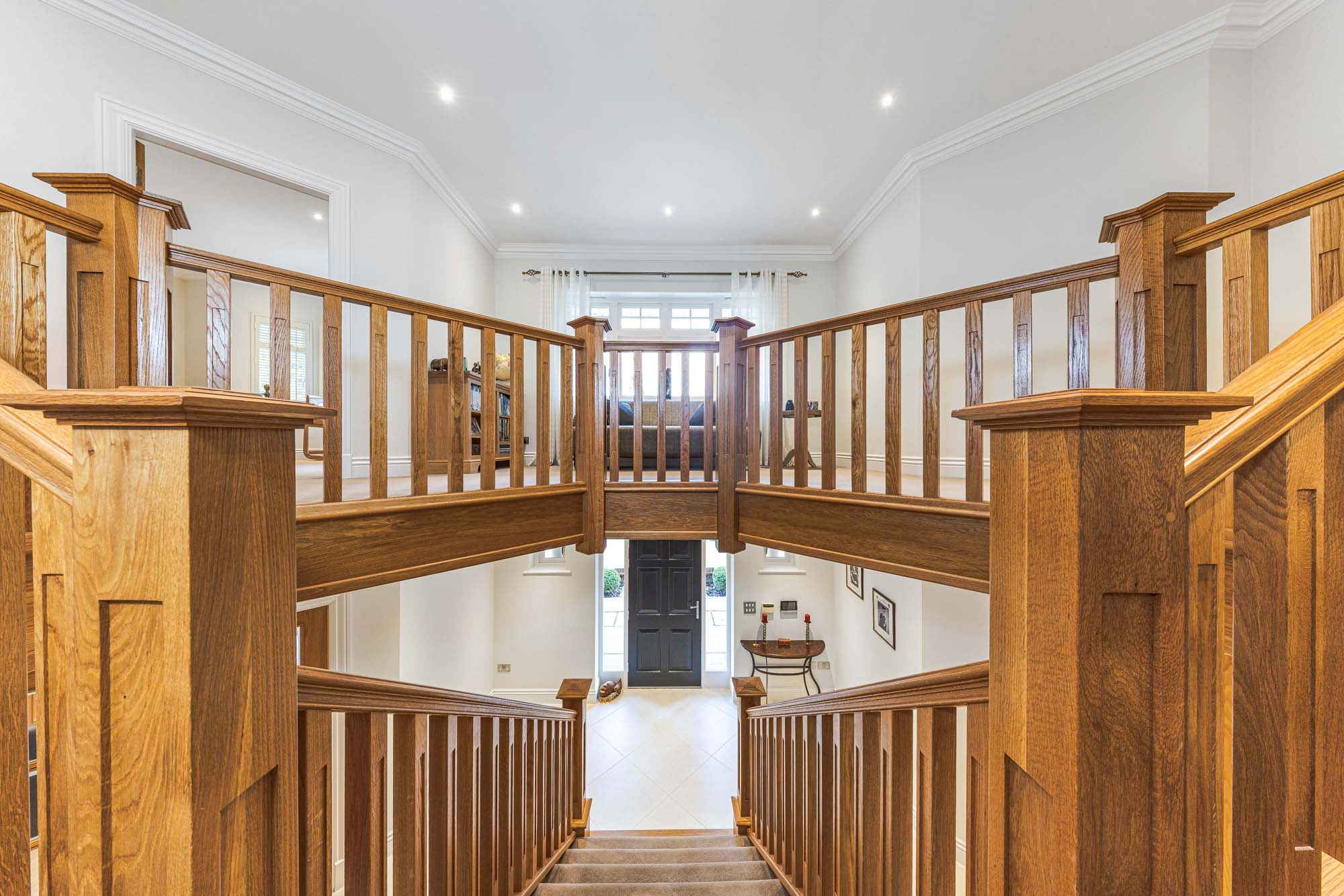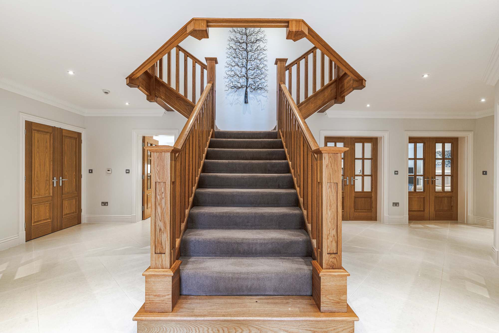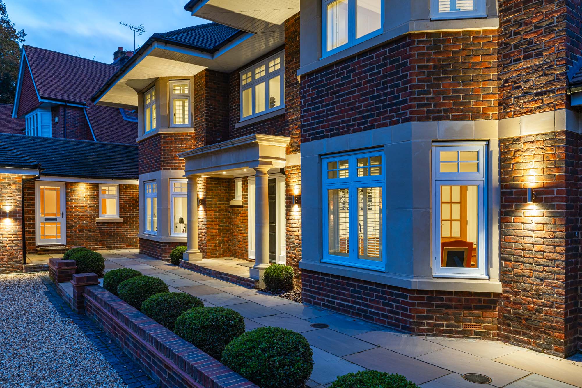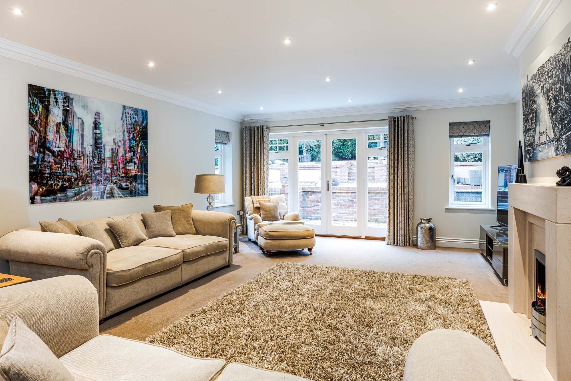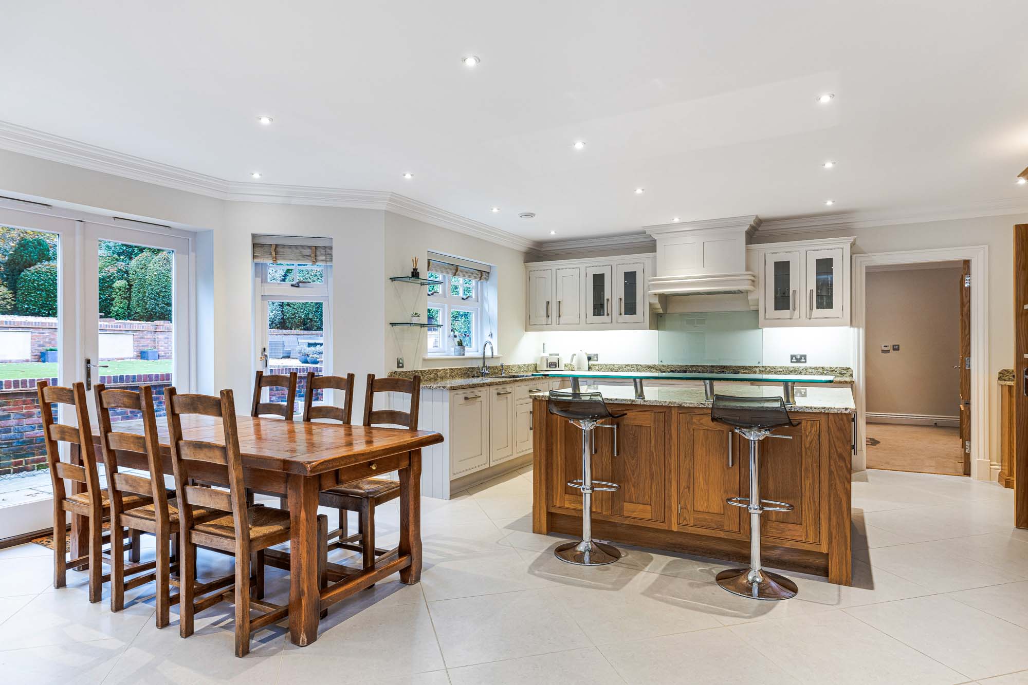 This home features an attractive design with security gates, extensive living space over 5000 sq. ft., multiple reception rooms, and four double bedrooms with en suites. The garden is landscaped with a large patio terrace and a wooded area.