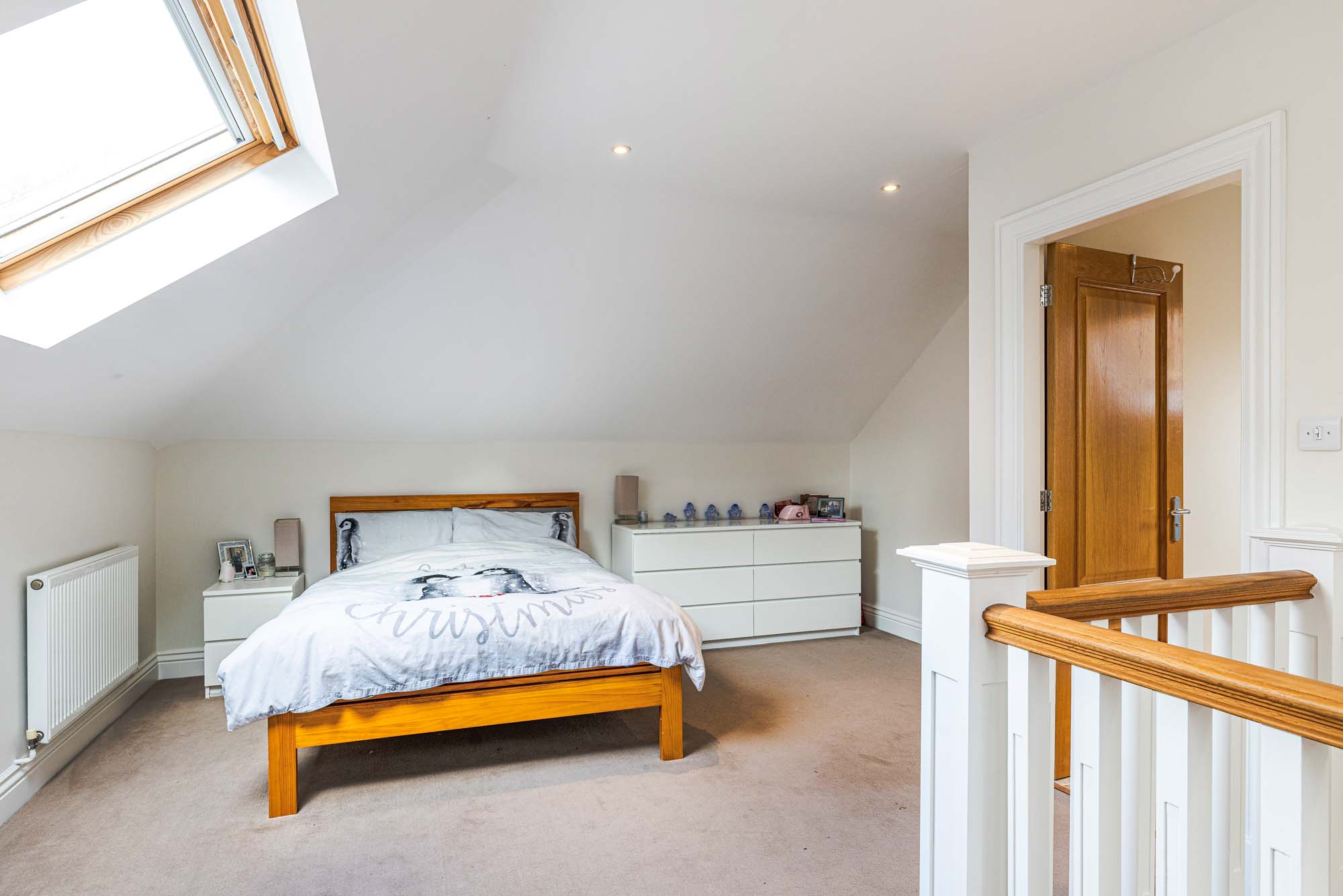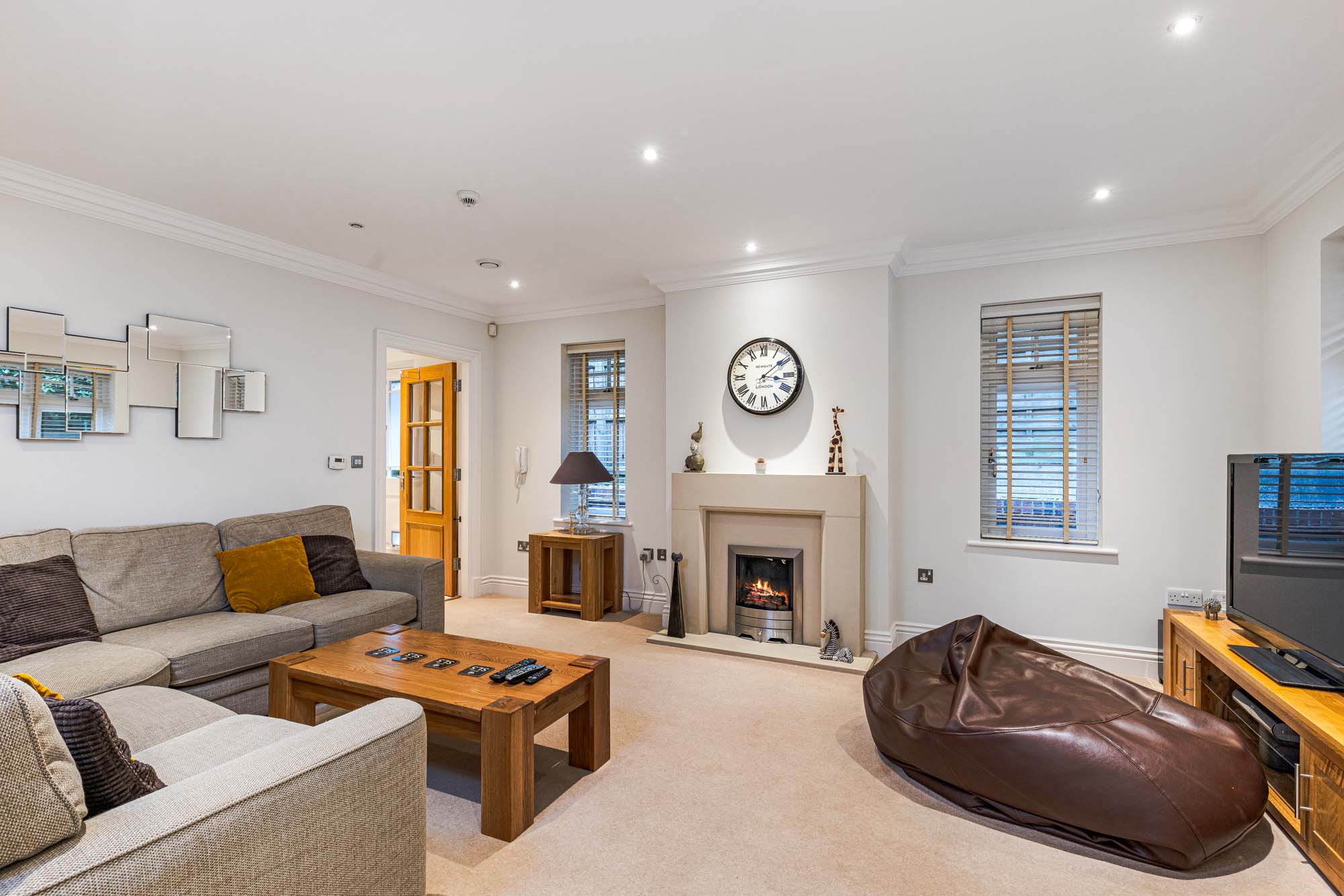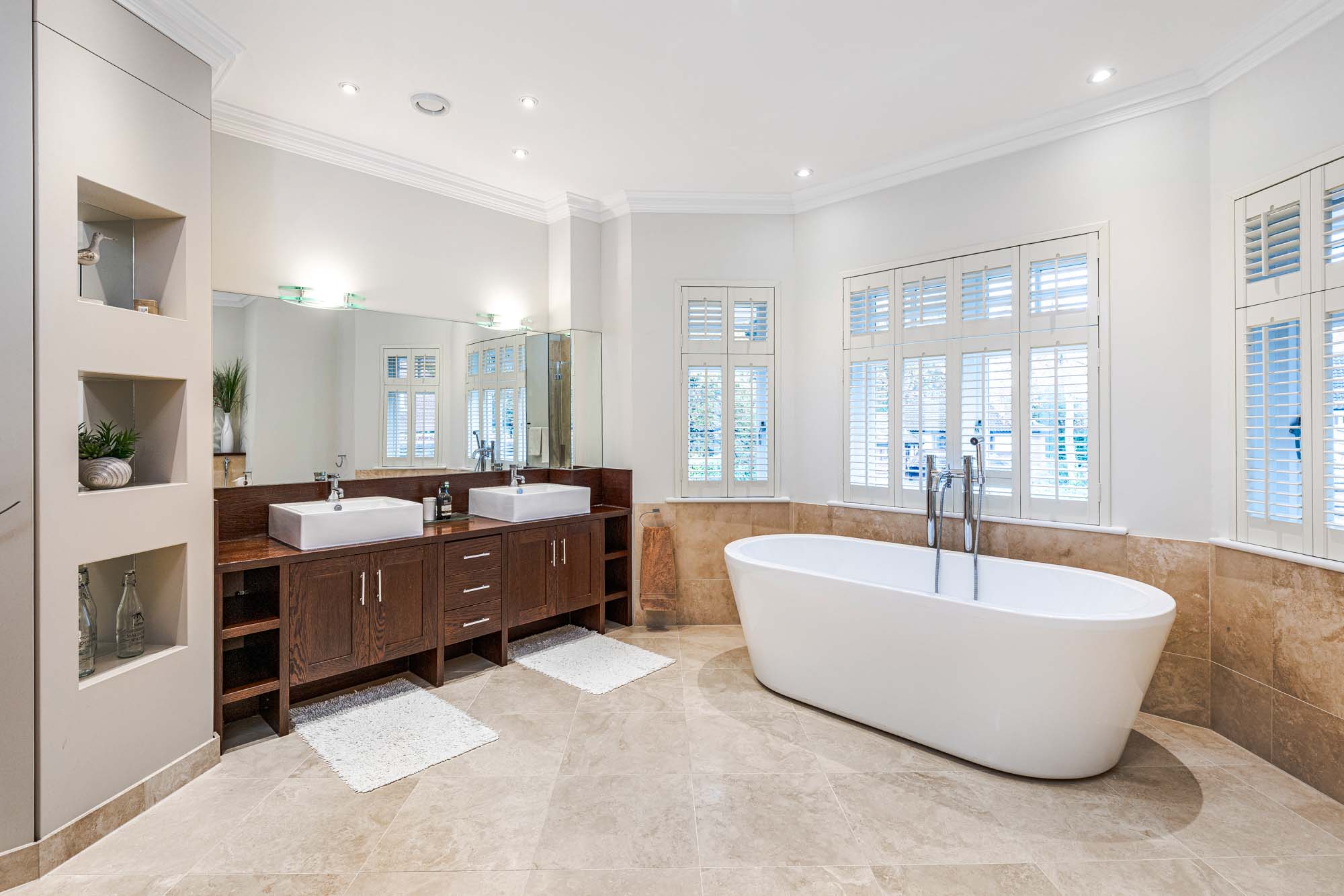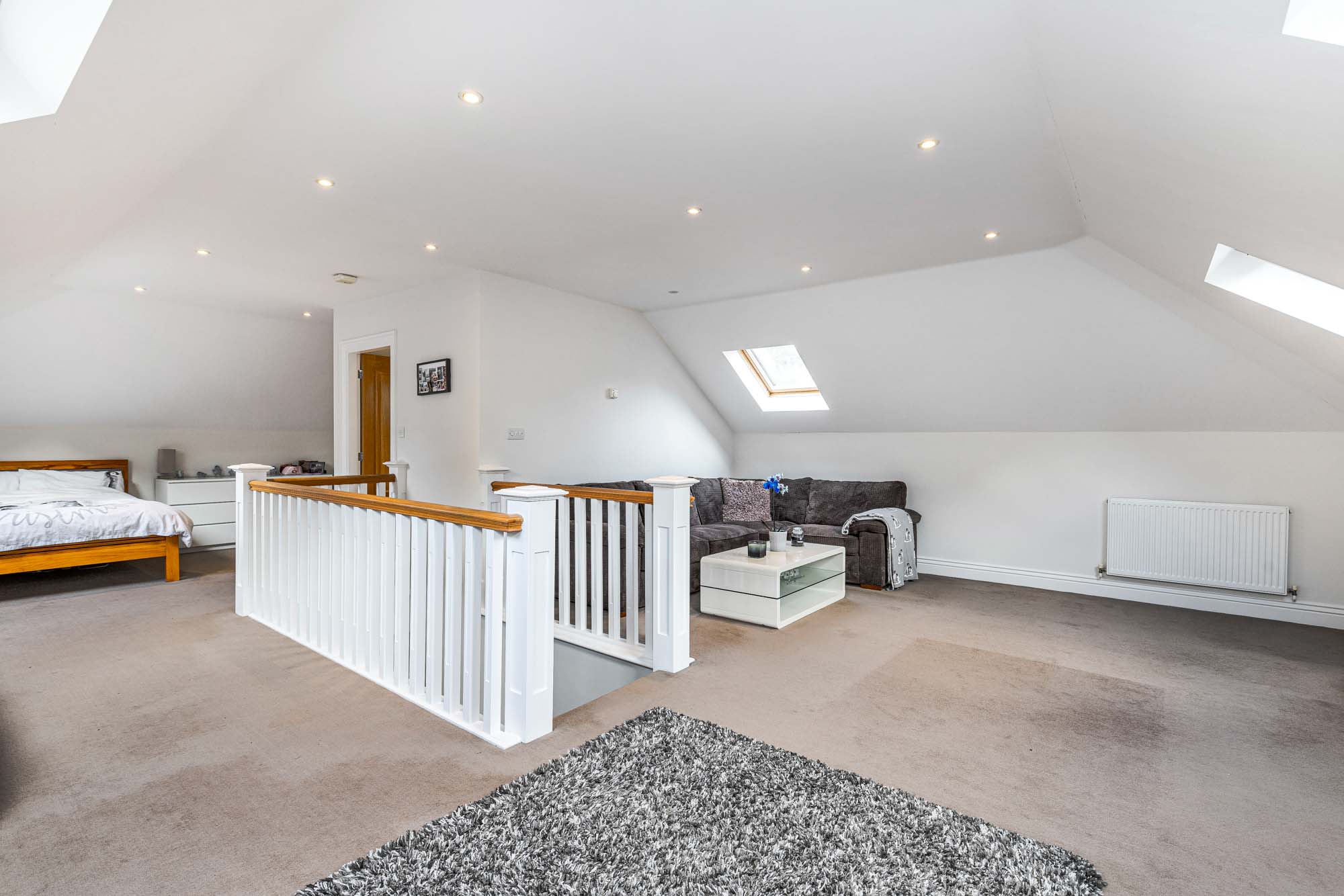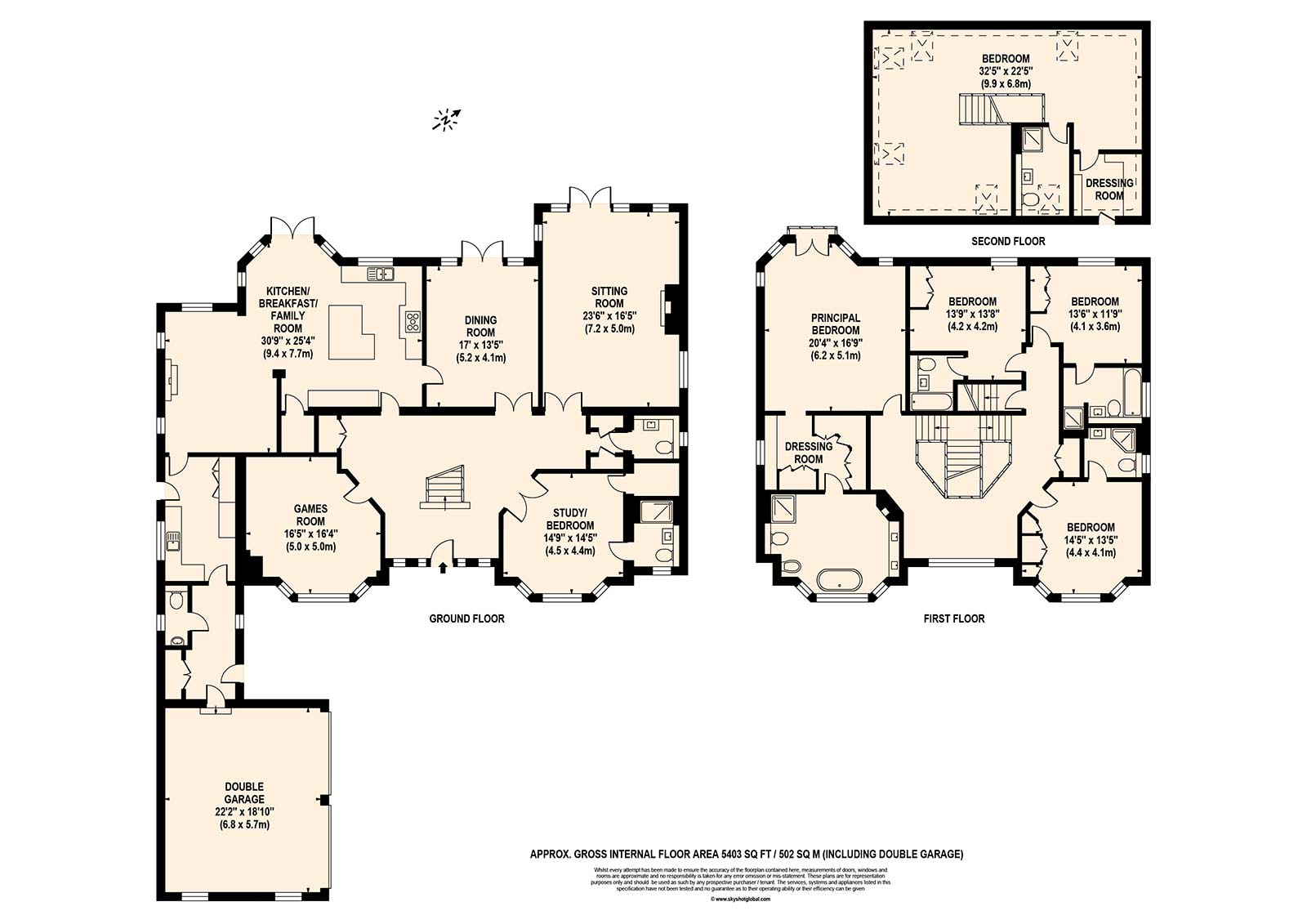 This home features an attractive design with security gates, extensive living space over 5000 sq. ft., multiple reception rooms, and four double bedrooms with en suites. The garden is landscaped with a large patio terrace and a wooded area.
