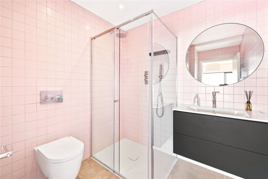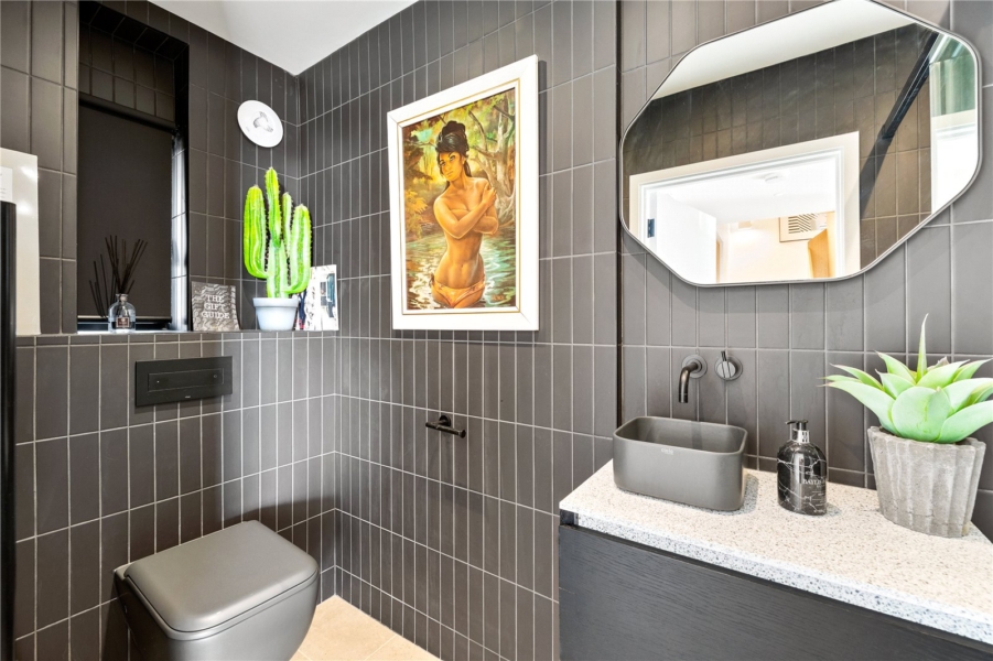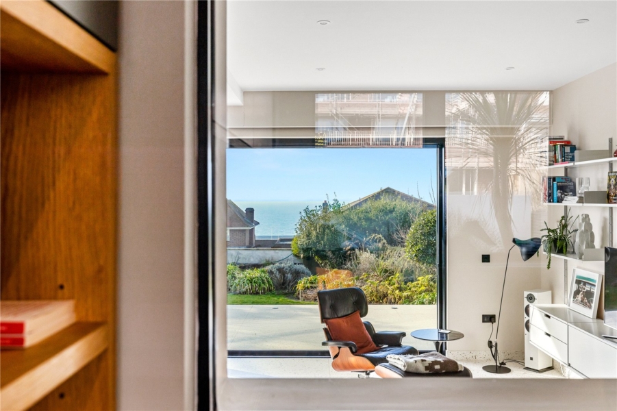 Tucked quietly to the side of the ground floor, a separate reception room also overlooks the sea – ideal as a study, playroom, or additional bedroom. A shower room featuring Corian surfaces, Vola fittings, and handsome dark tiles completes the floor.