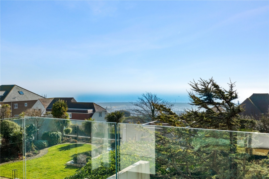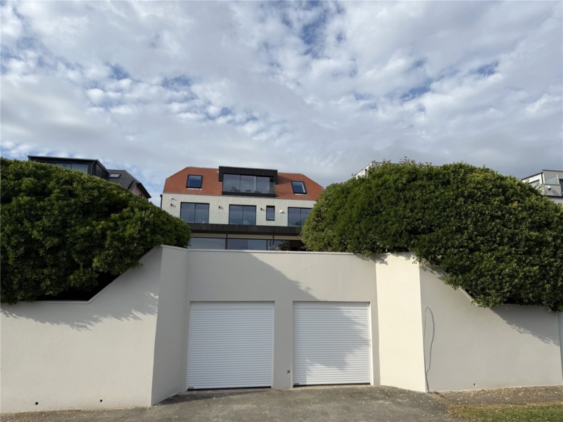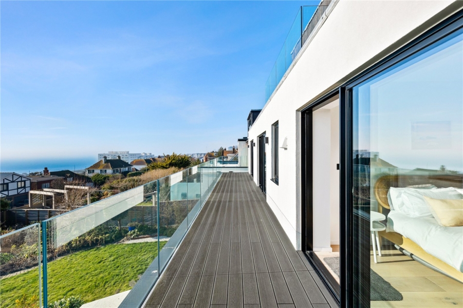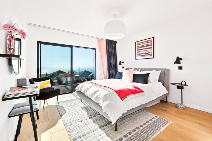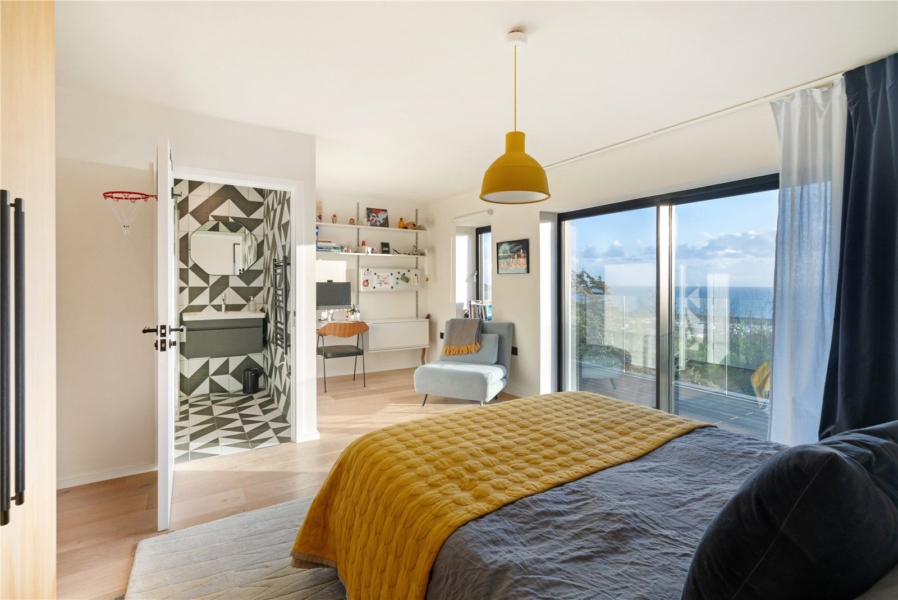 On the first floor, five serene bedrooms branch from a bright, wide landing. Three are positioned to the south, opening onto a full-width balcony with spectacular sea views. Two of the larger bedrooms have en-suite bathrooms, while the others share a sleek, monochrome family bathroom. Each room has been designed to feel restful, contemporary, and filled with light.