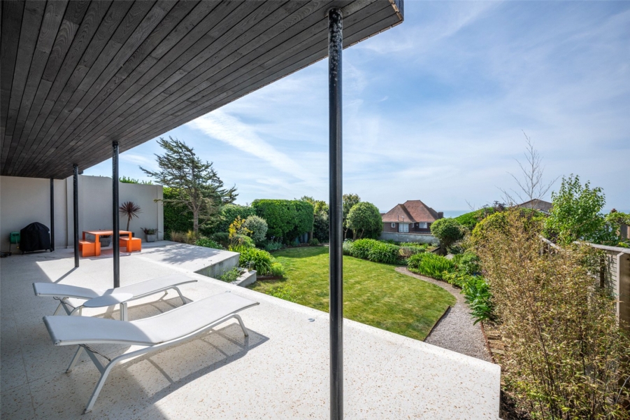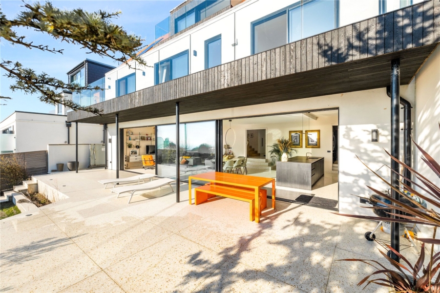 Outside, the peaceful south-facing garden is framed by mature hedging and trees for complete privacy. The elevated terrace invites alfresco dining and relaxed evenings, perfectly capturing the home’s effortless blend of architecture and landscape.