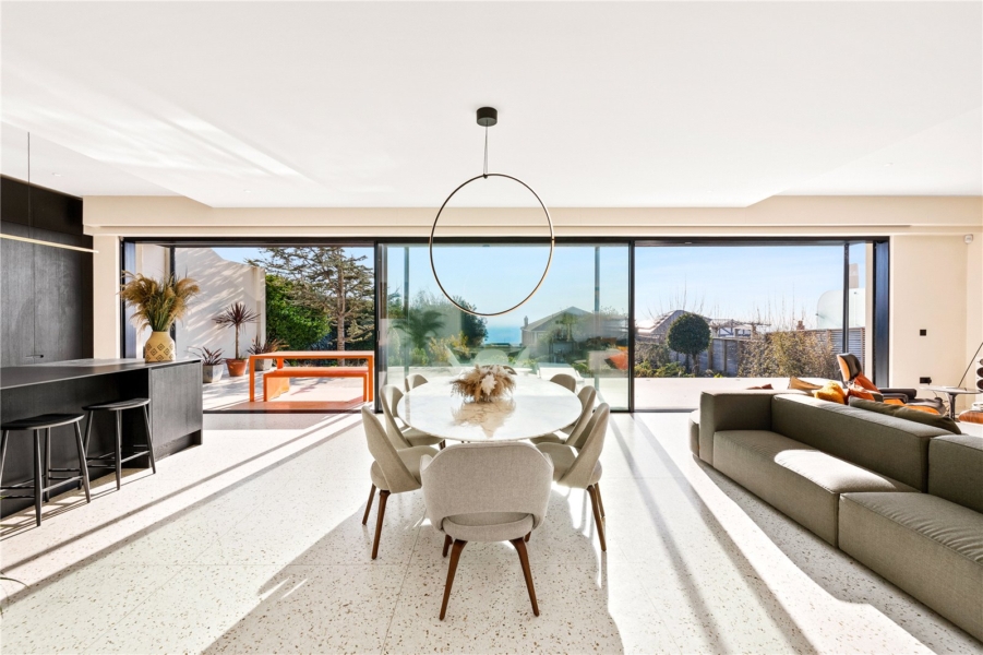 The principal living space is a revelation – a vast open-plan kitchen, dining, and lounge area where full-width and height sliding glass doors reveal a sea view, a sun-soaked, south-facing terrace and landscaped garden. Seamlessly integrating indoor and outdoor living with terrazzo flooring throughout, this space is an entertainer’s dream.