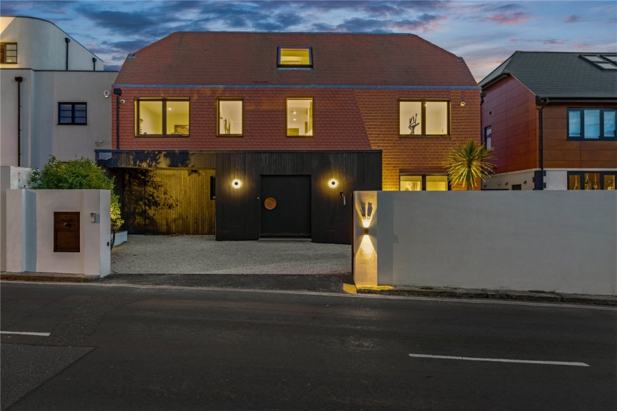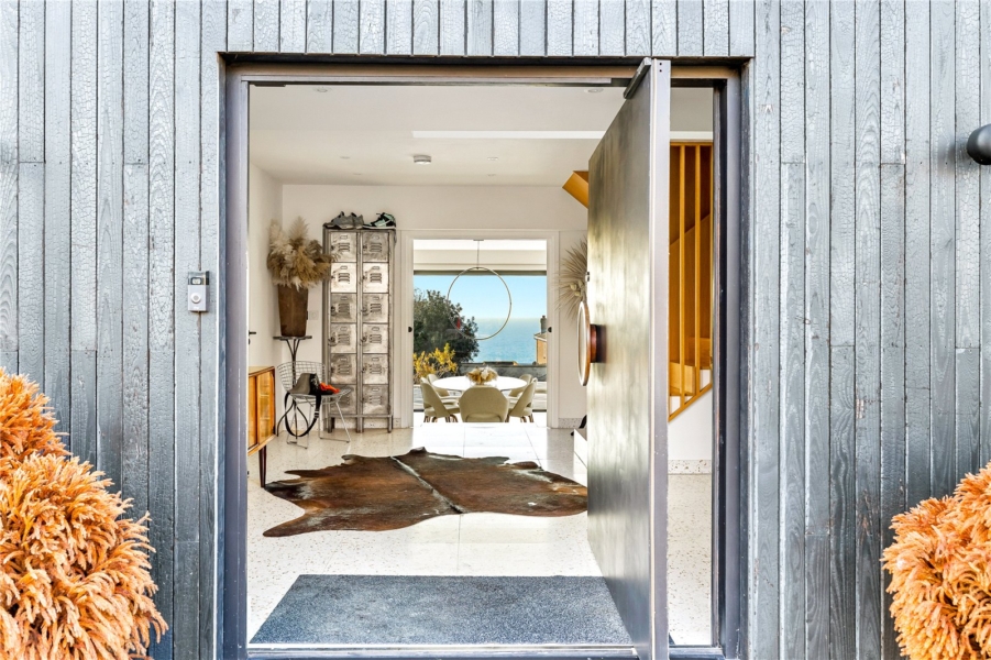 The striking exterior blends charred Shou Sugi Ban timber cladding and terracotta tilework, delivering texture and warmth. A dramatic oversized pivot door opening to a sea view sets the tone, while a secure gated driveway—with EV charging point—offers parking for three vehicles, plus additional space and double garage at the rear.