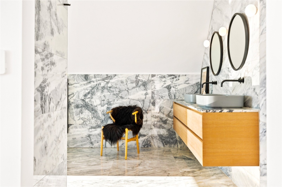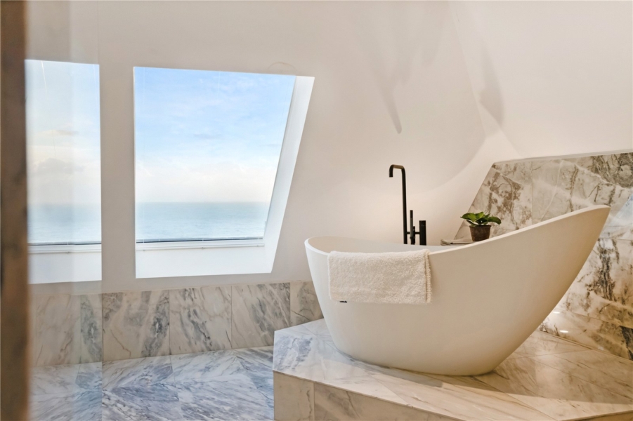 Crowning the home is the top-floor principal suite – an inspiring sanctuary. A flexible central space opens to a private balcony with sweeping ocean views and sunsets and can be configured as a sleeping area, lounge, or study depending on lifestyle needs. It’s complemented by a spacious dressing room with bespoke cabinetry and a large marble-clad bathroom featuring a spa-style bath and wet-room shower both with sea views and premium fittings.