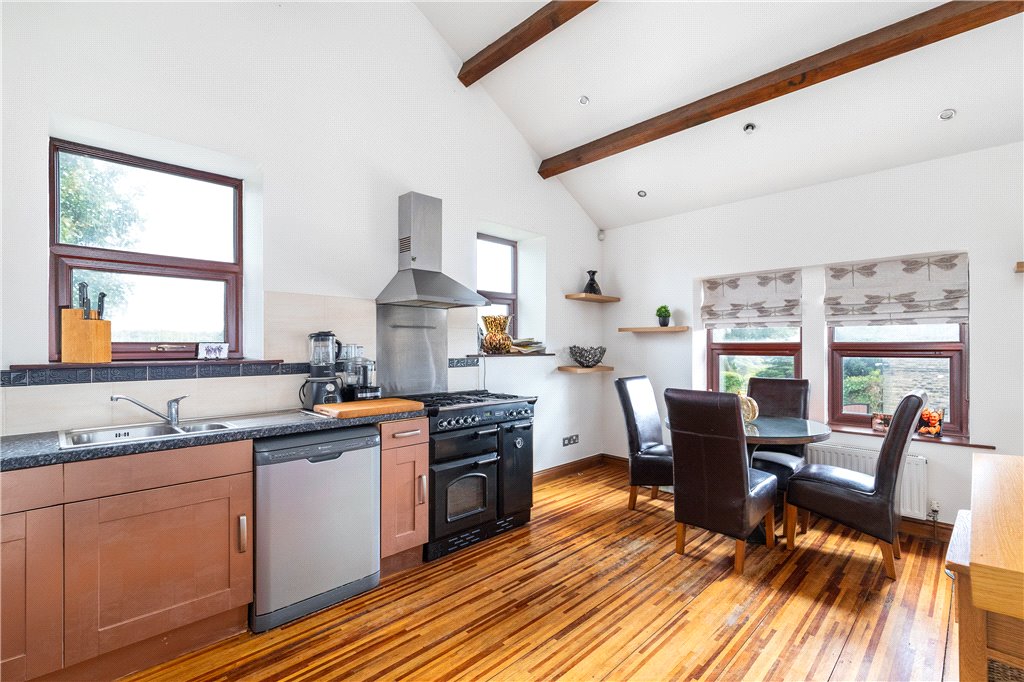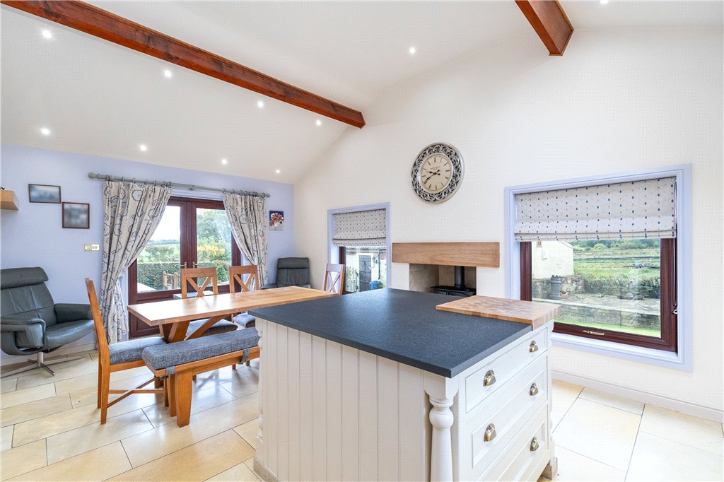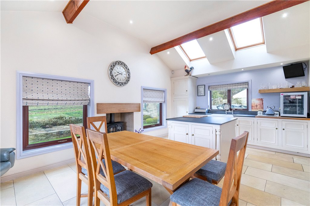 This attractive family home has been lovingly extended and upgraded by the current owners over the last 45 years to maximise the delightful views, setting and stunning, extensive gardens. The stone built property comprises, to the ground floor, a large entrance porch leading to the entrance hall with useful utility room and wc. A generous inner kitchen, with a range of base and wall units and large Rangemaster cooker, leads through to a stunning dining kitchen being the heart of the home with an island and ample worktop space, dining and sitting areas with stunning views and this space is being flooded with natural light having windows to three elevations, Velux roof lights and double doors to the garden. Also to the ground floor are three spacious reception rooms and, to the rear of the property, a spacious conservatory offering delightful views over the garden, paddock and countryside beyond. To the first floor are three double bedrooms, a small single bedroom and a large house bathroom. A large, detached barn has been cleverly converted to offer further living space with a spacious lounge and dining kitchen, two double bedrooms, snug and bathroom. This attractive property is ideal for extended family / guest accommodation or, with the appropriate licence and consents, would make a lovely AirBnB. The stunning gardens encompass sweeping lawns with mature planted beds and landscaping, beautiful pond with an outbuilding and patio area creating a tranquil setting. A hedge enclosed vegetable plot with ample beds to grow your own fruit and veg with glass greenhouse, and a large patio area directly to the rear of the house is ideal for outside entertaining and making the most of the fabulous views. For those who enjoy equestrian pursuits, the property comes with the rare benefit of a paddock and stable block with stabling for a number of horses. And a large Hen run also to house many hens. There is also a triple garage with electric doors and block paved, gated cobbled courtyard driveway with parking for a large number of cars. This is a rare opportunity to have two dwellings on the same plot and have the potential to run a business or have family live close by. Please call our office to discuss things further.
