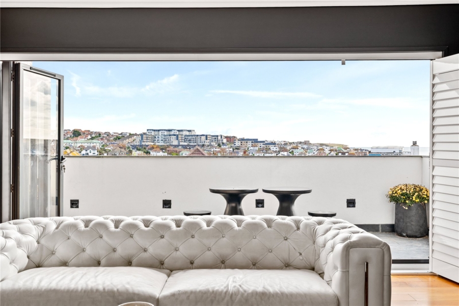 As you step into this remarkable property, you are immediately greeted by a spacious dining area adorned with bifold doors that effortlessly invite the outside in. The adjoining balcony presents an unrivaled vantage point, treating you to panoramic views of Saltdean and the serene, azure sea beyond.
