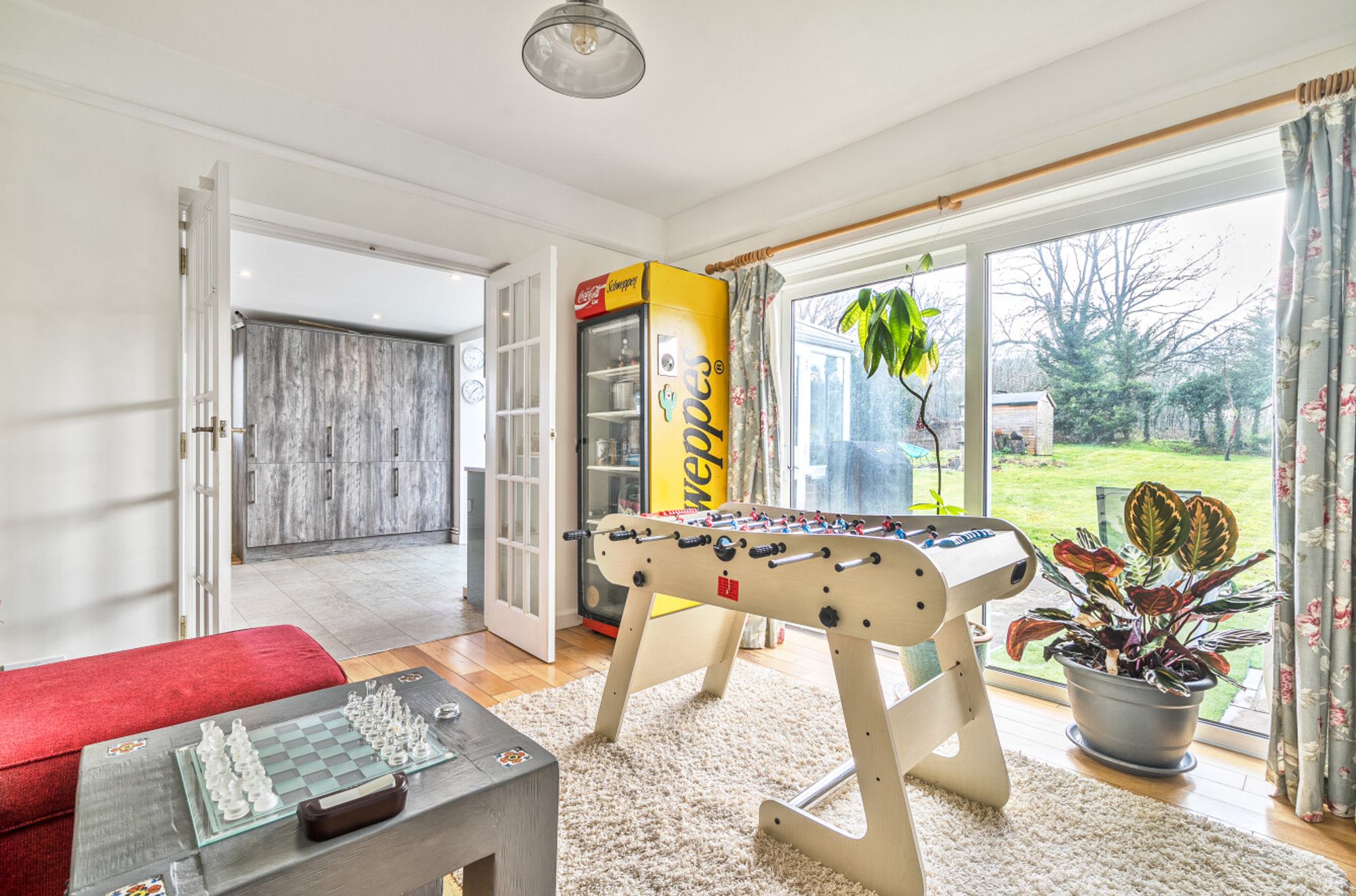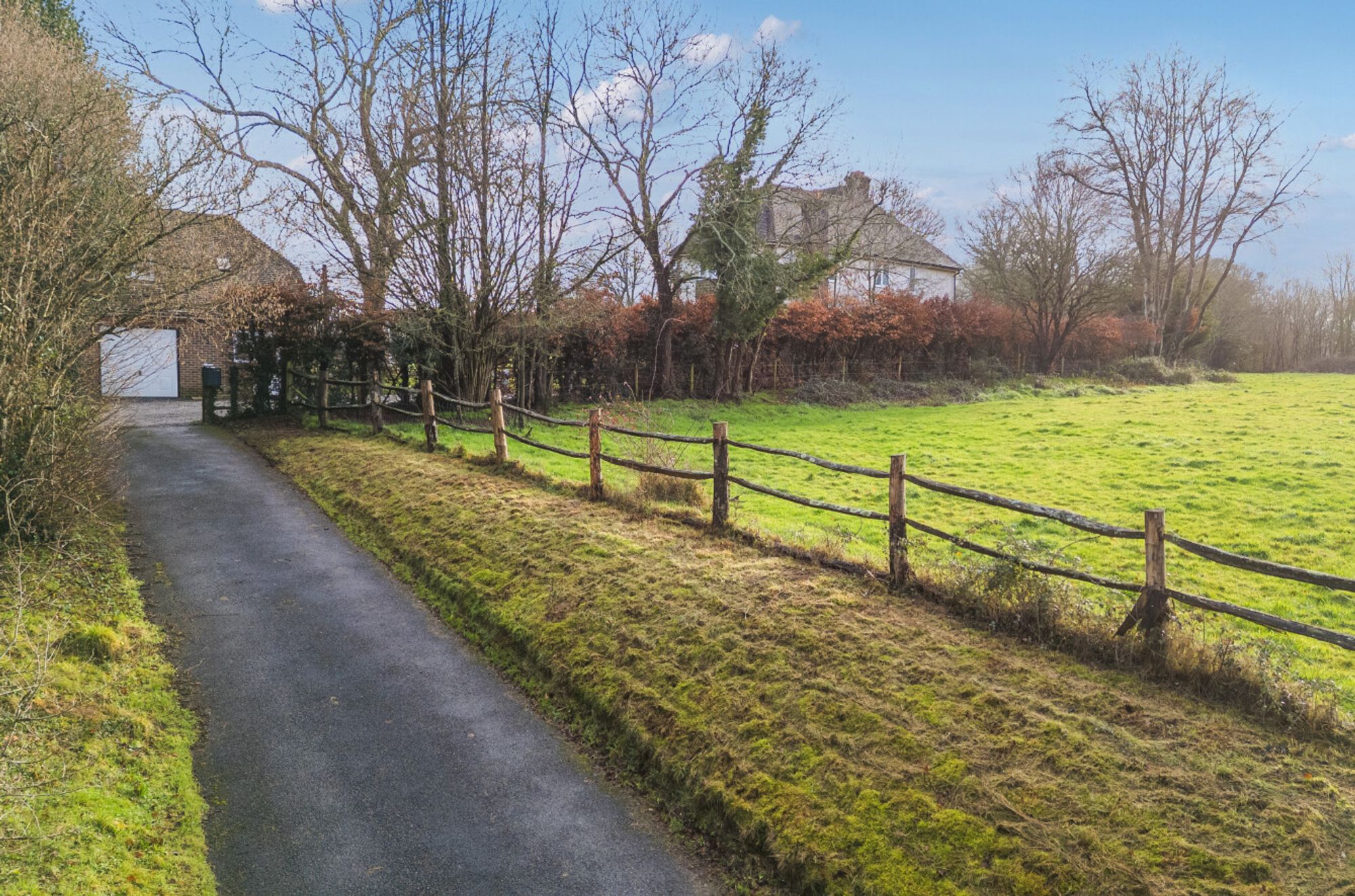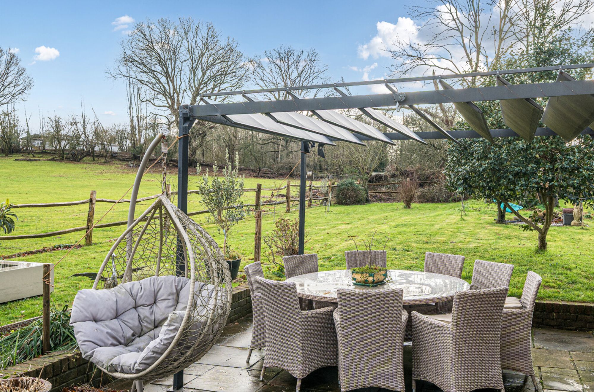 At the heart of the home lies a large kitchen/dining room overlooking the garden and paddocks, ideal for family gatherings and informal entertaining. There are three reception rooms offering flexibility for sitting, dining, home working or playroom use. The accommodation is bright and well balanced, with views and access onto the surrounding gardens that reinforce the strong connection to the outdoors.
