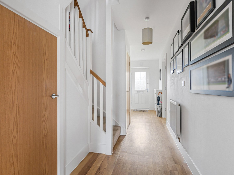 Upon entering the home, you are welcomed by a spacious entrance hallway with two large storage cupboards and a convenient downstairs WC. To the left is the well-appointed kitchen, which offers space for a dining table and includes a range of built-in appliances such as a double oven, washer/dryer, dishwasher, and fridge/freezer.