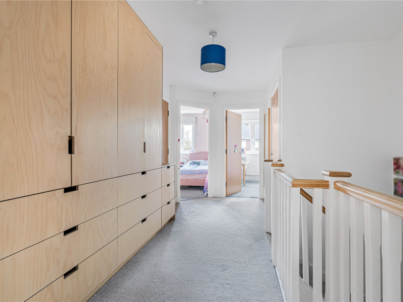 The first floor comprises four well-proportioned bedrooms, three doubles and a good-sized single, all offering space for free-standing furniture. The principal bedroom overlooks the front and benefits from a large built-in mirrored sliding wardrobe and a modern en-suite shower room with a walk-in shower, WC, and wash basin. The family bathroom is fitted with a bath, shower, WC, and wash basin. Additional storage is available from the hallway, including a large airing cupboard.
