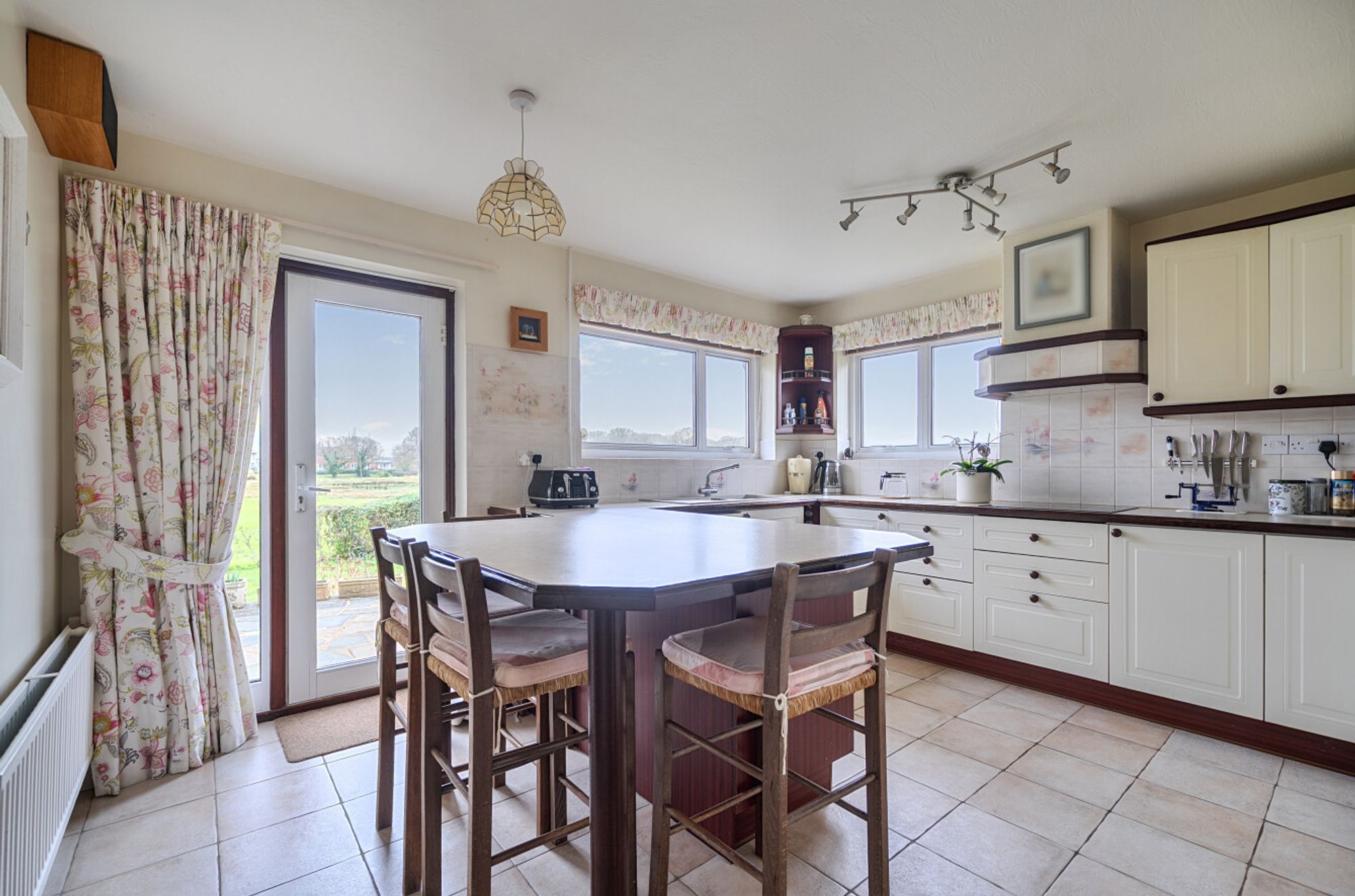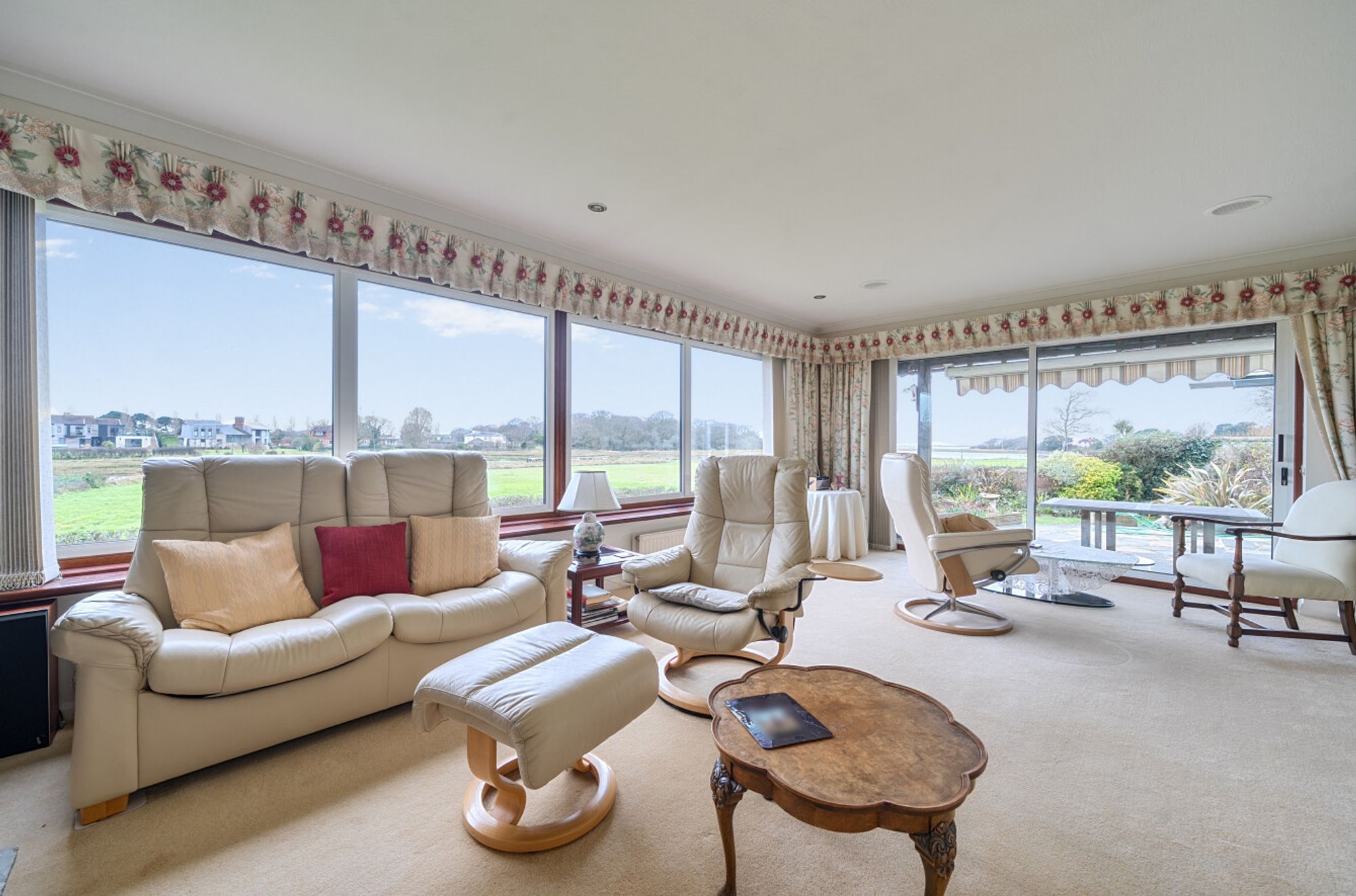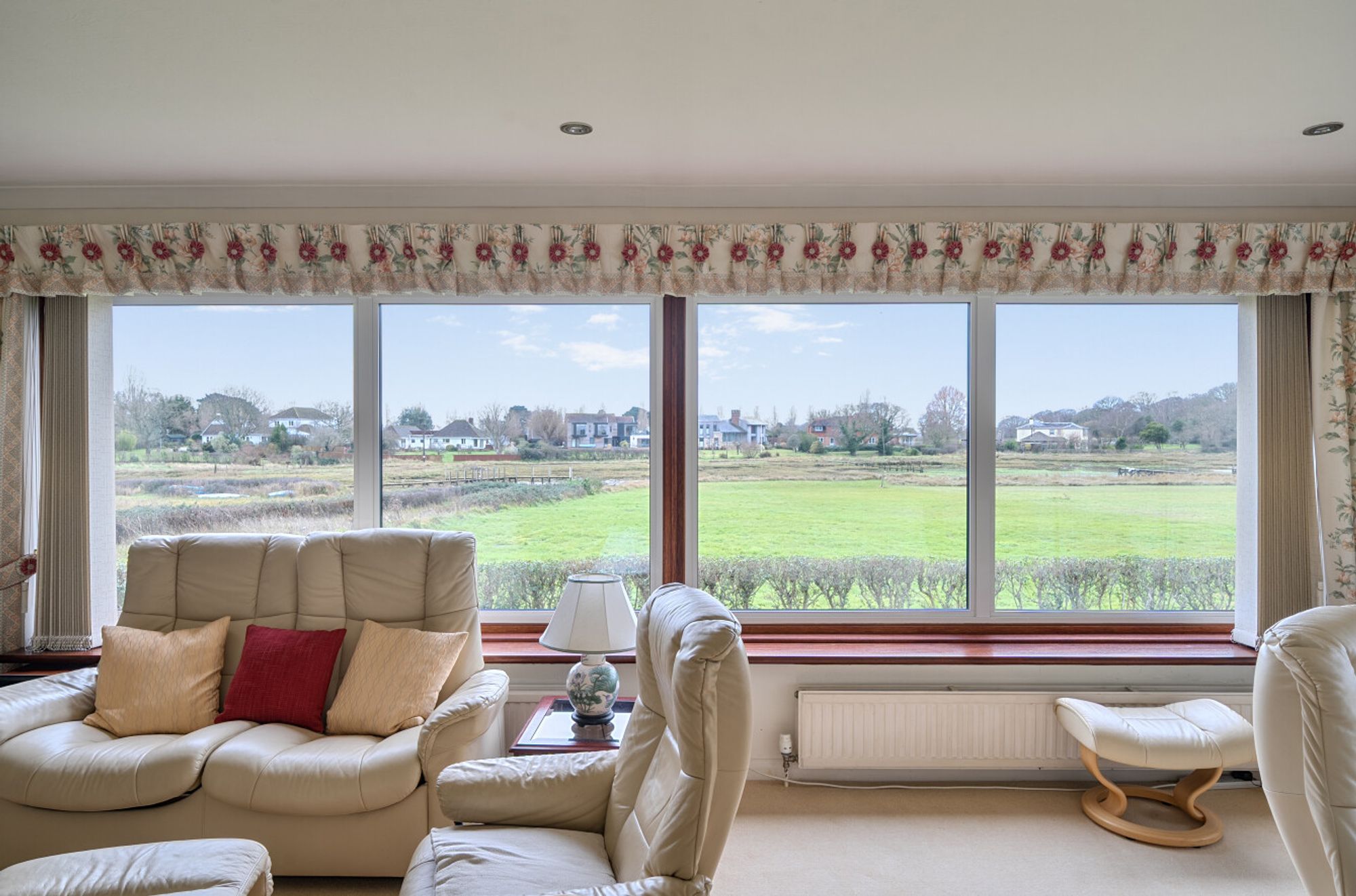 Arranged over two floors, the accommodation currently provides four/five bedrooms together with a well-balanced range of reception space. At ground-floor level, a kitchen/breakfast room, dining room and a particularly large living room enjoy a natural flow, with the principal reception room positioned to take full advantage of the Southerly and Westerly outlook across the garden, meadow and the harbour beyond.