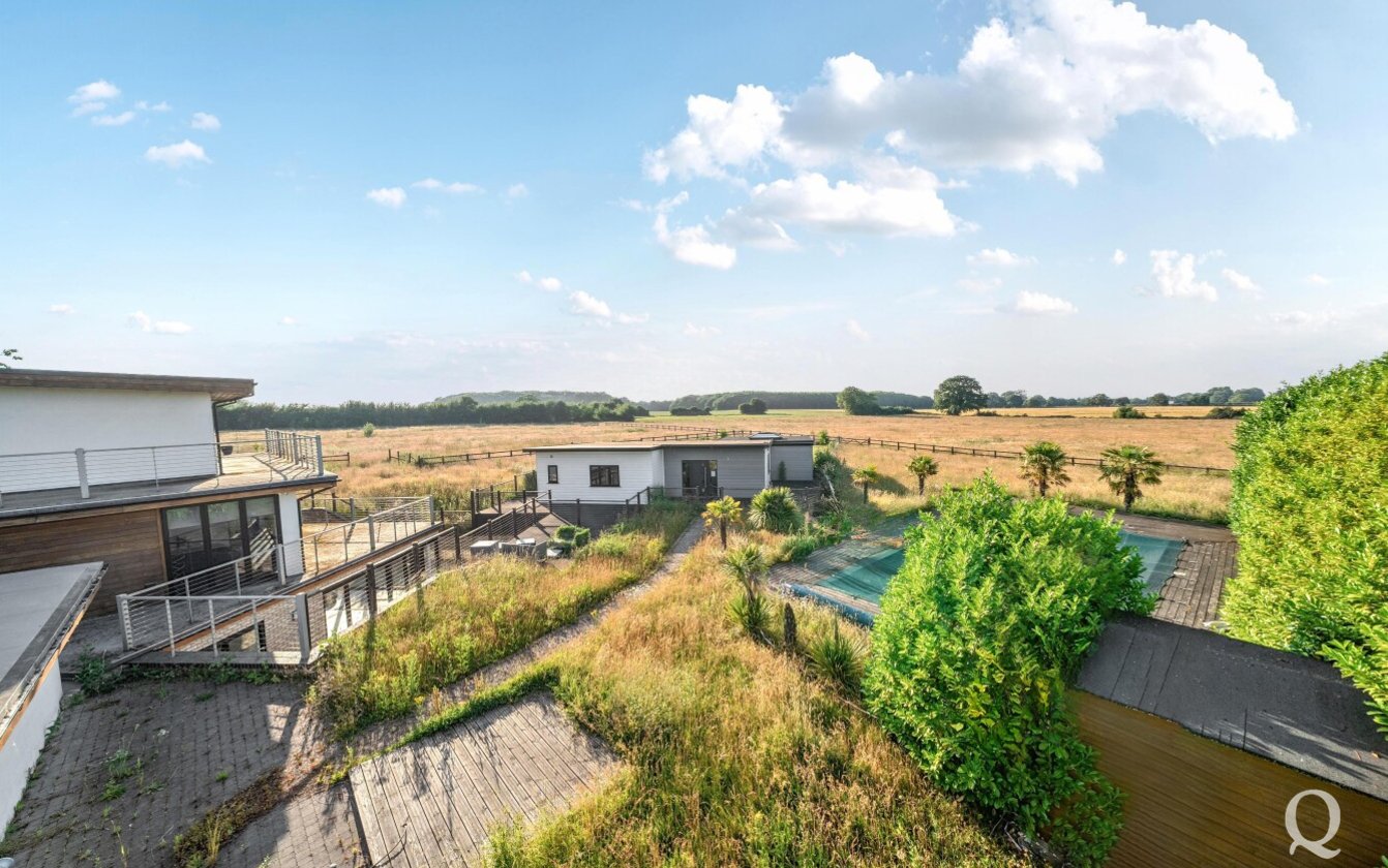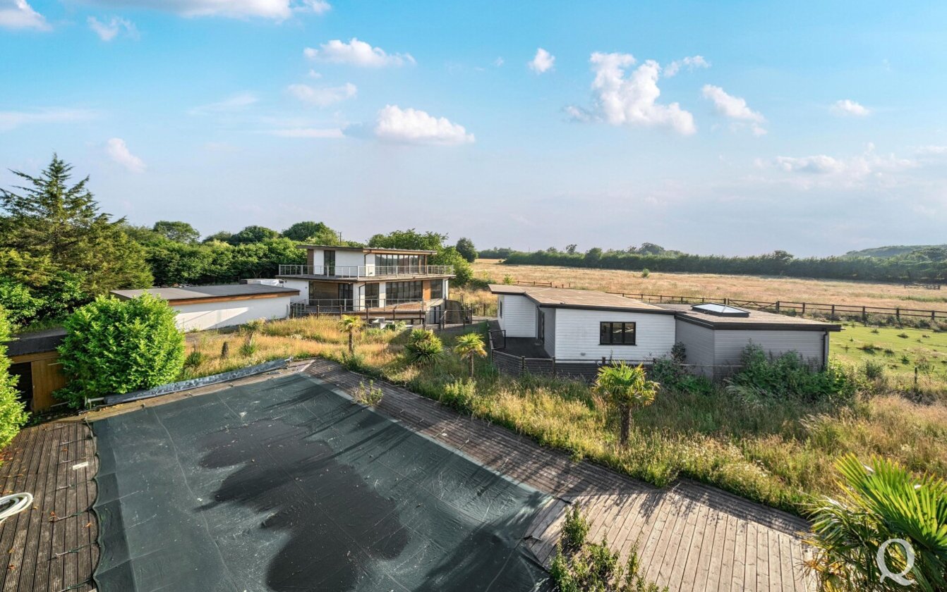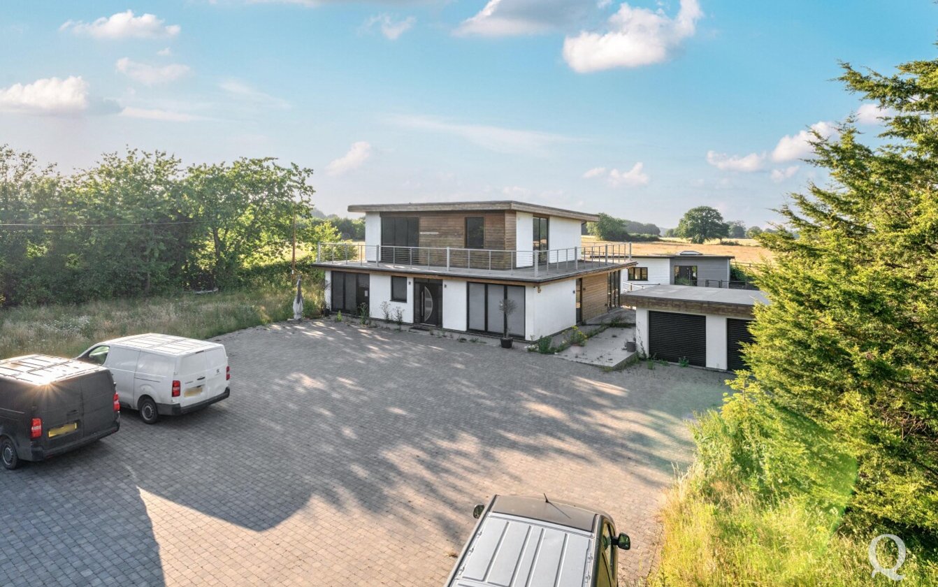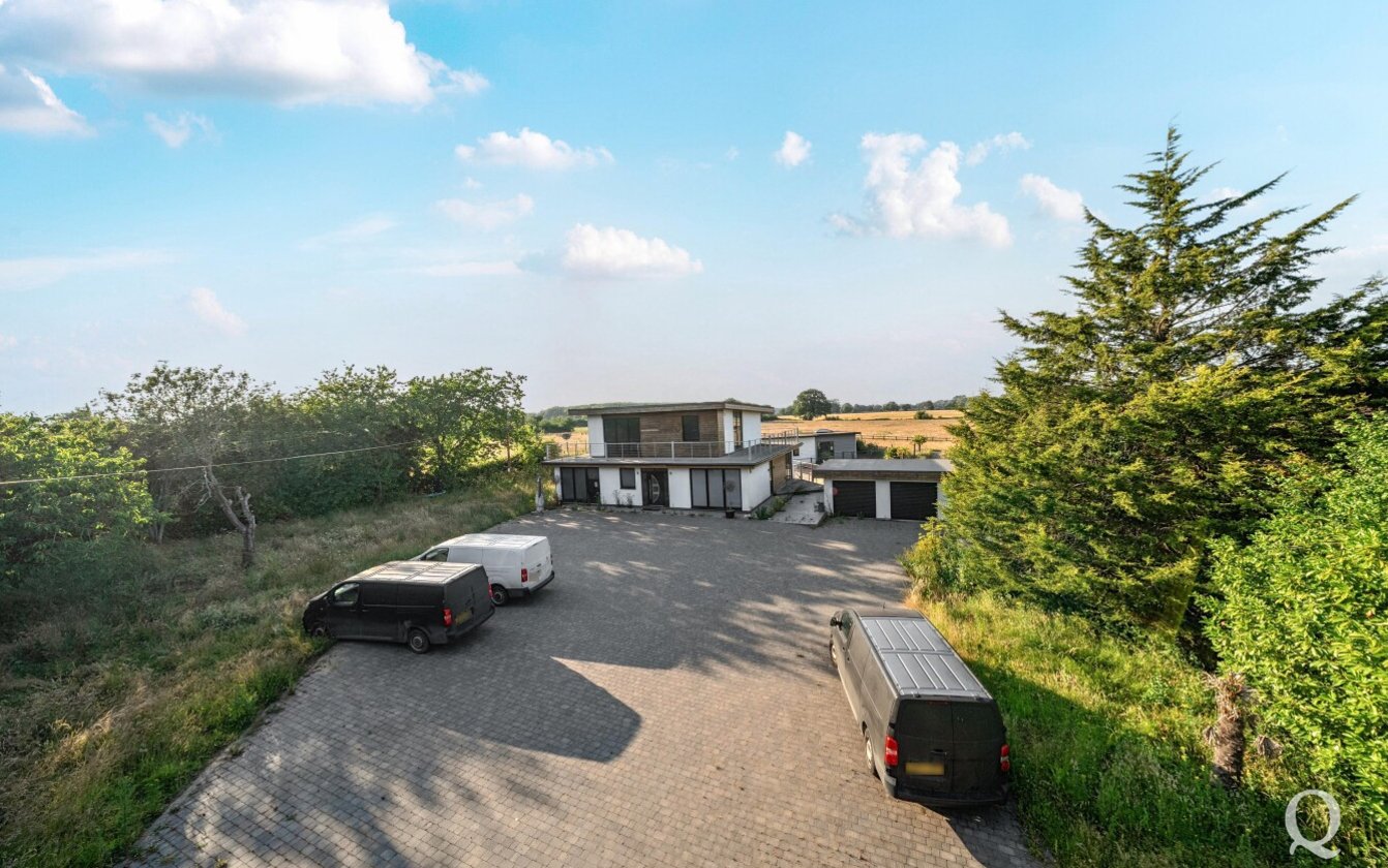 Offered for sale with no onward chain, this striking property presents a rare opportunity to acquire a fine example of modern architecture set within approximately 10 acres of land. Arranged over three expansive floors, the home offers an impressive blend of contemporary design and generous proportions. While certain repairs are required to the kitchen and most of the bathrooms, the property holds immense potential for enhancement and restoration. The lower ground floor opens out to a sunken courtyard, while the second floor benefits from a spectacular 360-degree walk-around terrace, offering panoramic views of the surrounding landscape. The spacious kitchen and dining area is ideal for entertaining, featuring two sets of bi-fold doors that lead onto a balcony. The master bedroom includes a private dressing room and ensuite, with five additional bedrooms—three of which also boast ensuite facilities. Externally, the grounds include a large garden with a swimming pool, a triple garage, paddocks, and a self-contained two-bedroom annexe/pool house, offering versatile accommodation for guests or extended family. The property is located just under a mile from the village of Stockbury, within easy reach of the A249, M2 and M20 giving access to the county town of Maidstone and nearby Sittingbourne with mainline railway station for services to London. Viewing is strongly recommended and appointments can be made via our office.