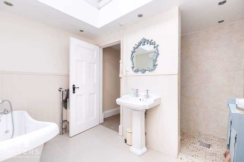 Bedroom two also benefits from fitted wardrobes and a private ensuite shower room, while bedroom three is serviced by a beautifully finished four-piece family bathroom that offers a modern twist on the Victorian style with stunning sky lantern and walk-in shower alongside a roll top bath, WC and wash basin combining traditional elegance with modern comfort.