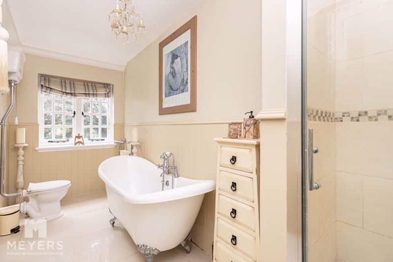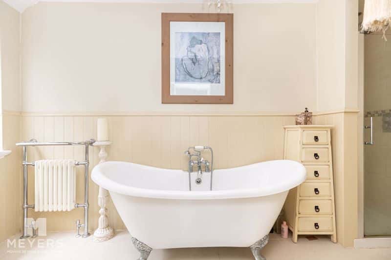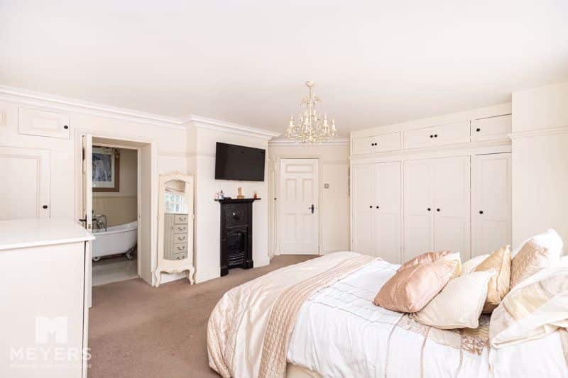 The first floor comprises three double bedrooms, including a double aspect master bedroom with fitted wardrobes, a decorative original fireplace, and a stunning Victorian-style ensuite featuring a roll-top bath, separate shower, WC, and basin.