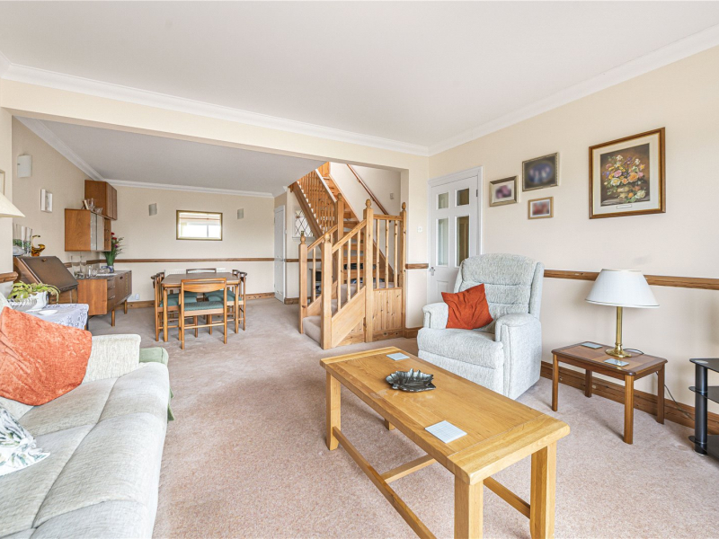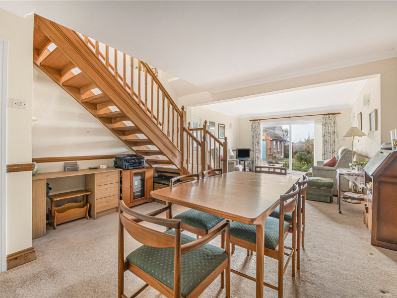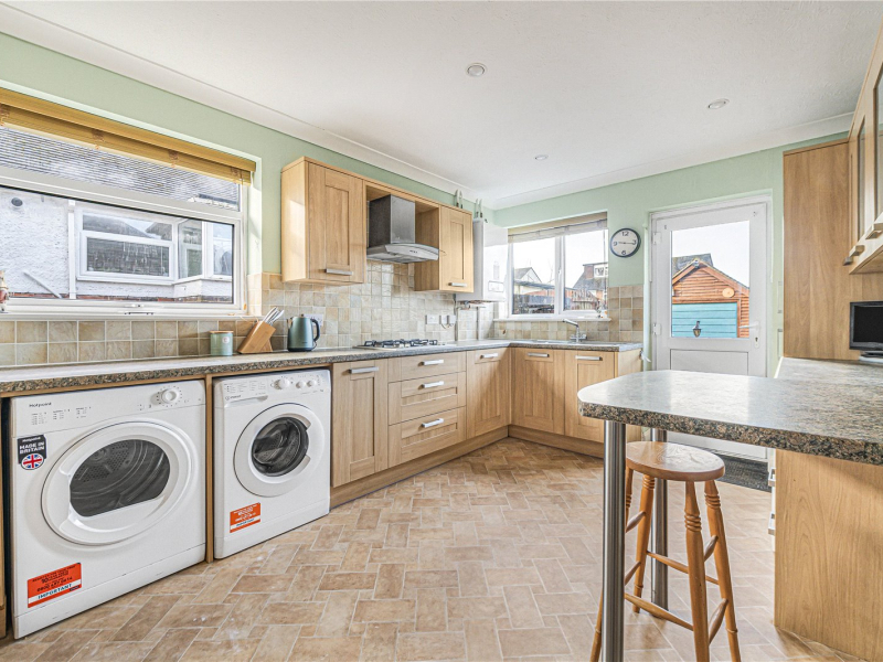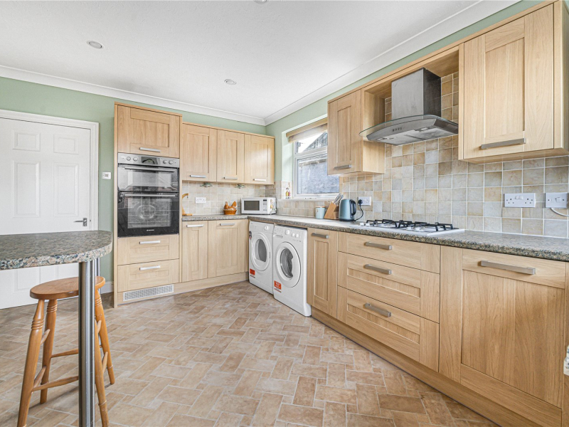 To the rear of the property is an impressive 26ft living/dining room with sliding glass doors opening onto the garden, creating an ideal space for entertaining and family living. The kitchen is accessible from both the hallway and the living area and offers a range of fitted units, an integrated fridge/freezer and space for a washing machine, dishwasher and dryer, along with a built-in oven and gas hob.