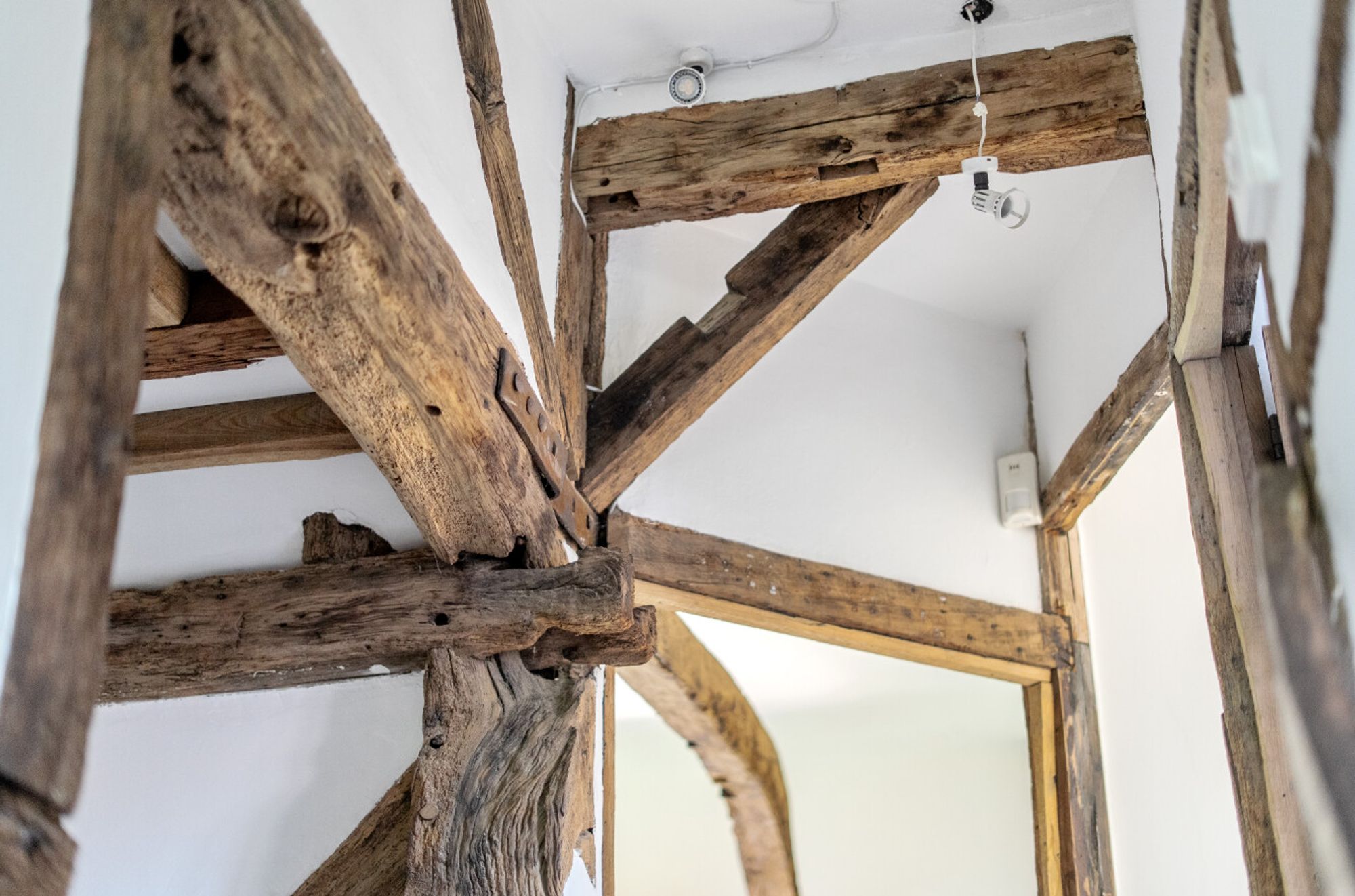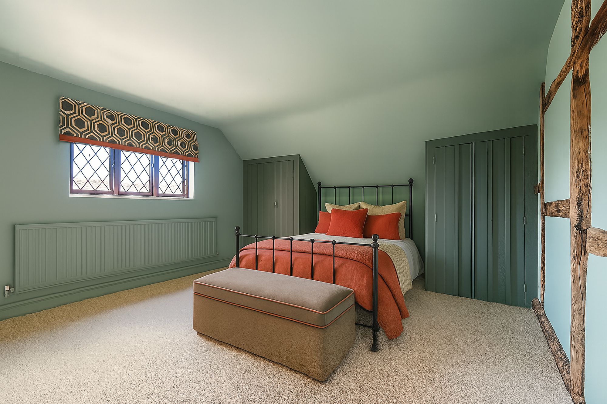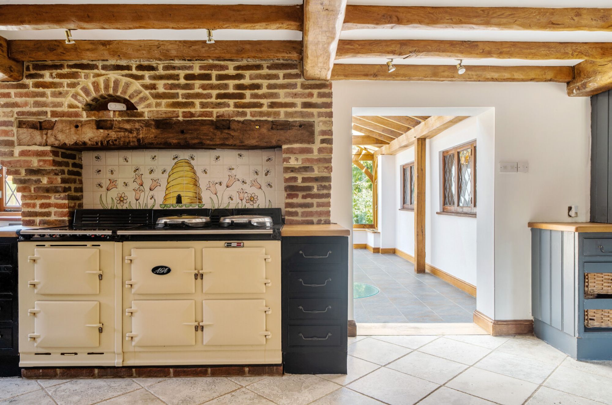 Inside, the flagstone entrance hall leads to a cosy family room with wood burner, a generous sitting room with inglenook fireplace, and a bespoke kitchen with a dual-fuel AGA, handcrafted cabinetry and adjoining orangery with circular viewing platform over a working well. Bi-fold doors open directly onto the courtyard and gardens, creating a seamless flow between the main house and one of the home’s most exciting features — the detached pool house.