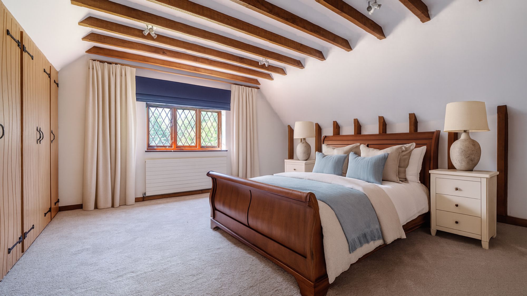 Upstairs in the main house, the principal suite enjoys garden views, bespoke wardrobes and an en suite with underfloor heating. Four further bedrooms (all with fitted storage) share a stylish family bathroom with sunken tub and lovely outlooks.