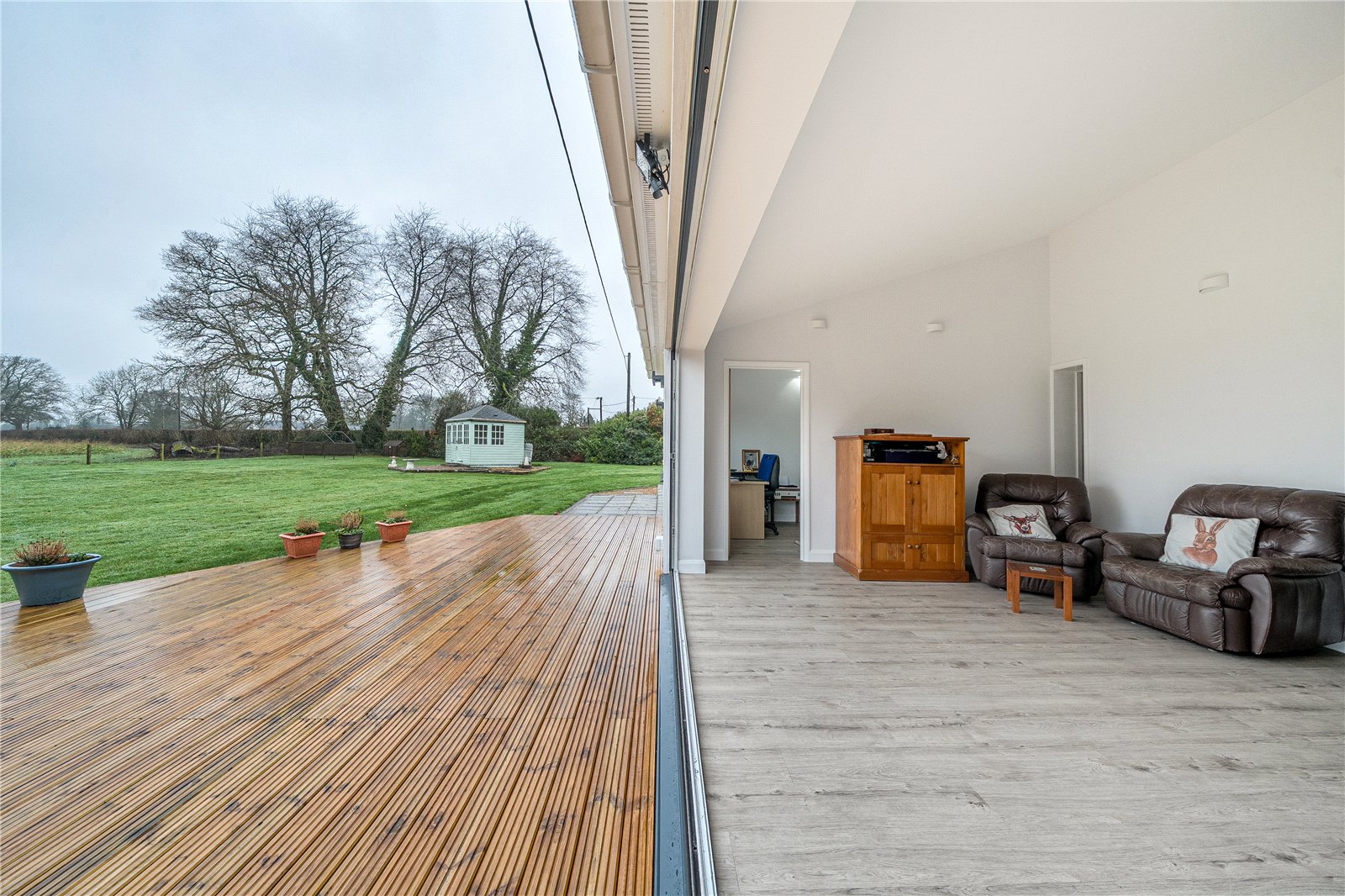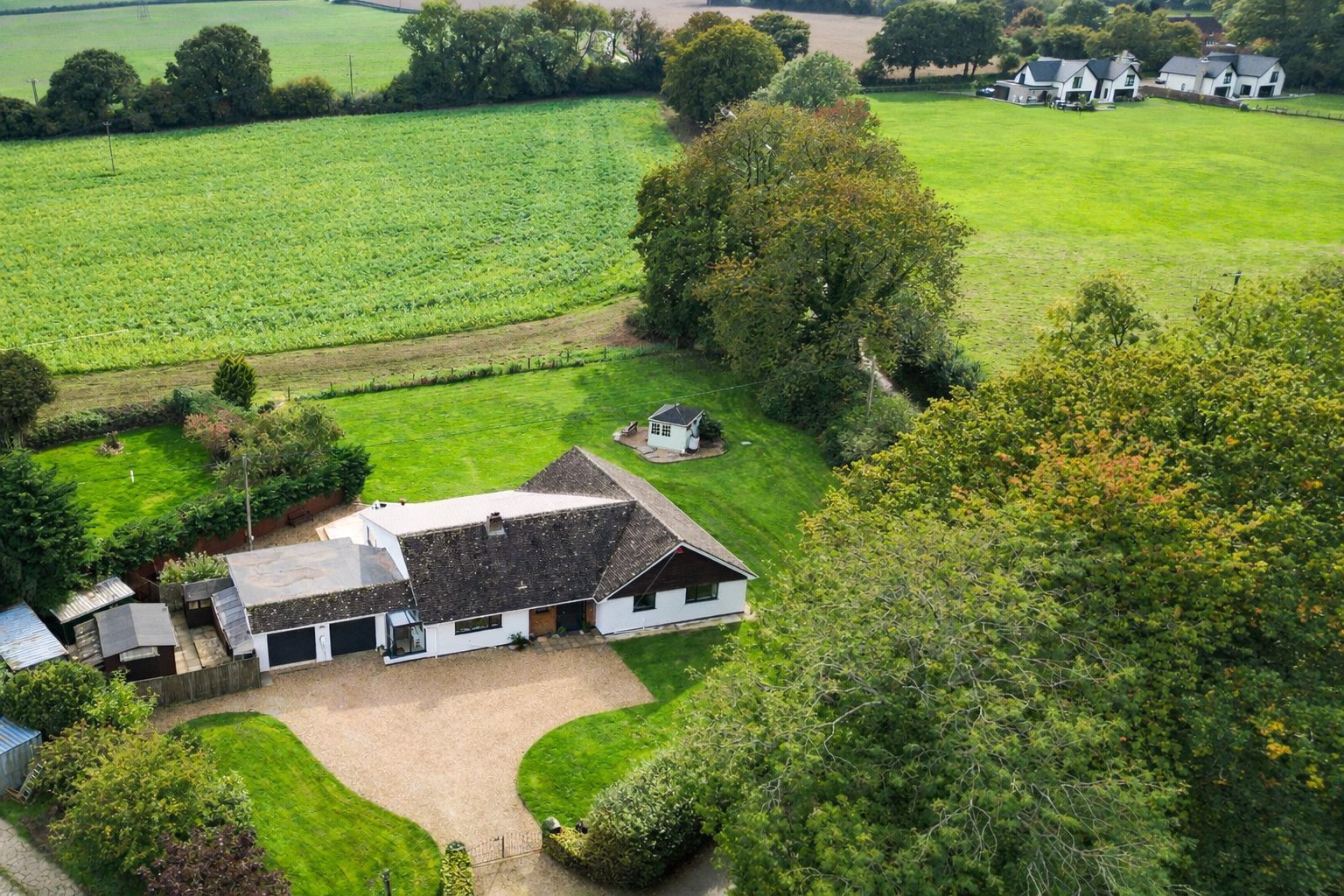 Externally, the property is centrally positioned on the plot, with the garden wrapping around to the rear. A large lawn and decked area to the rear of the property provide ideal space for relaxation or entertaining, while a selection of storage sheds and a charming summer house add further functionality and enjoyment. The garden is post-and-wire to the rear providing uninterrupted views of the surrounding fields, enhancing the sense of tranquility, space, and seclusion, making this a truly private retreat.