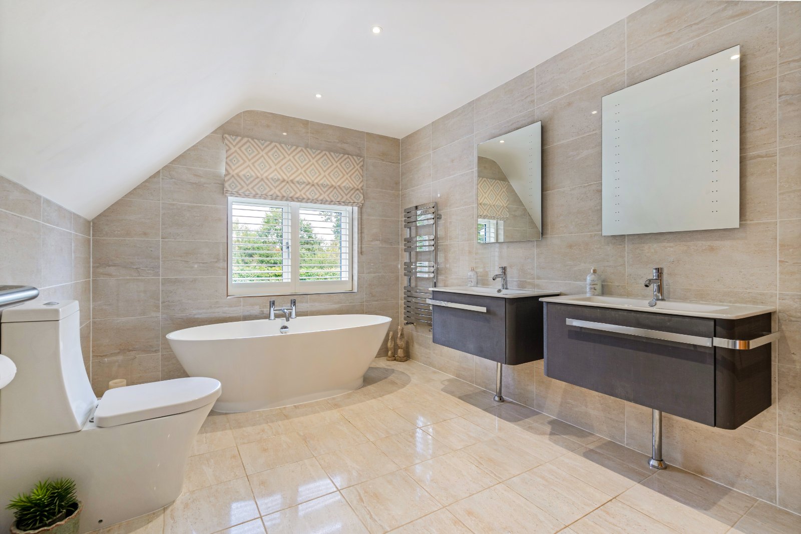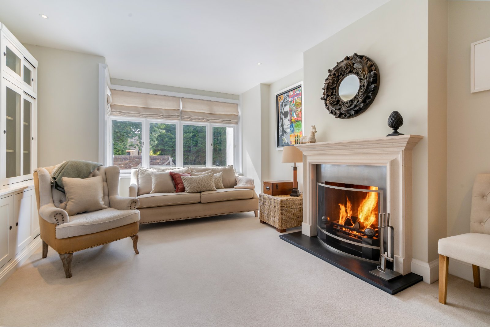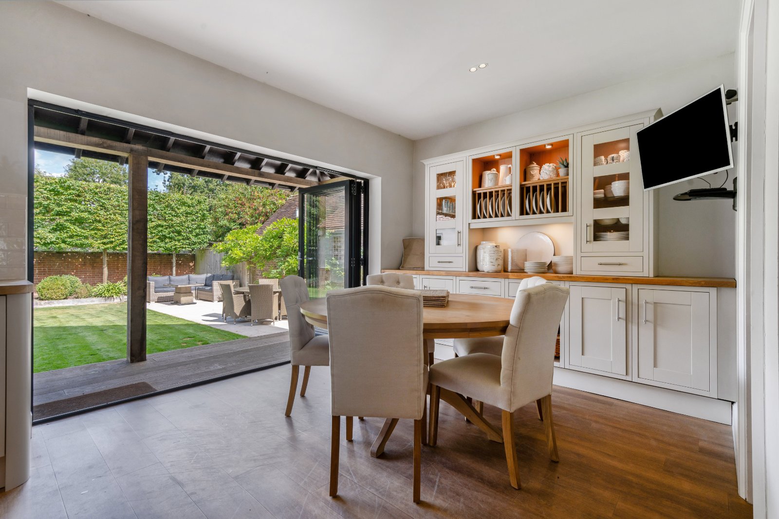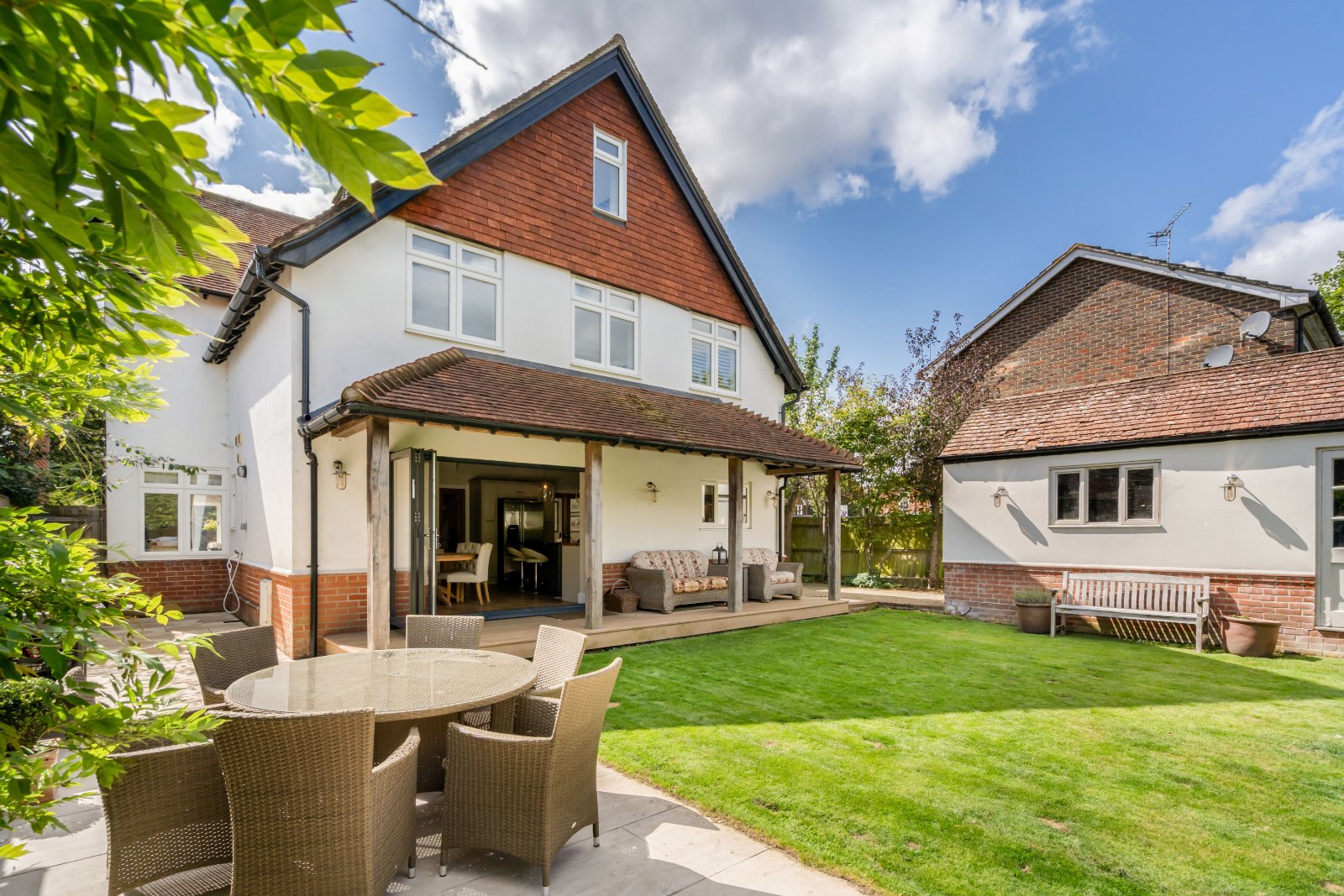 Believed to date back to the 1930s, the house has been sympathetically modernised to create a bright, welcoming and versatile interior. The ground floor includes two elegant reception rooms, both featuring open fireplaces and large windows that draw in natural light. At the heart of the home lies a spacious kitchen/dining room, beautifully fitted and offering plenty of space for entertaining, with retractable doors that seamlessly open onto a covered veranda and the garden beyond. Upstairs, the accommodation continues to impress with five bedrooms arranged over two floors, one of which offers ideal potential as a home office or study, and two stylishly appointed bathrooms that serve the household with ease.