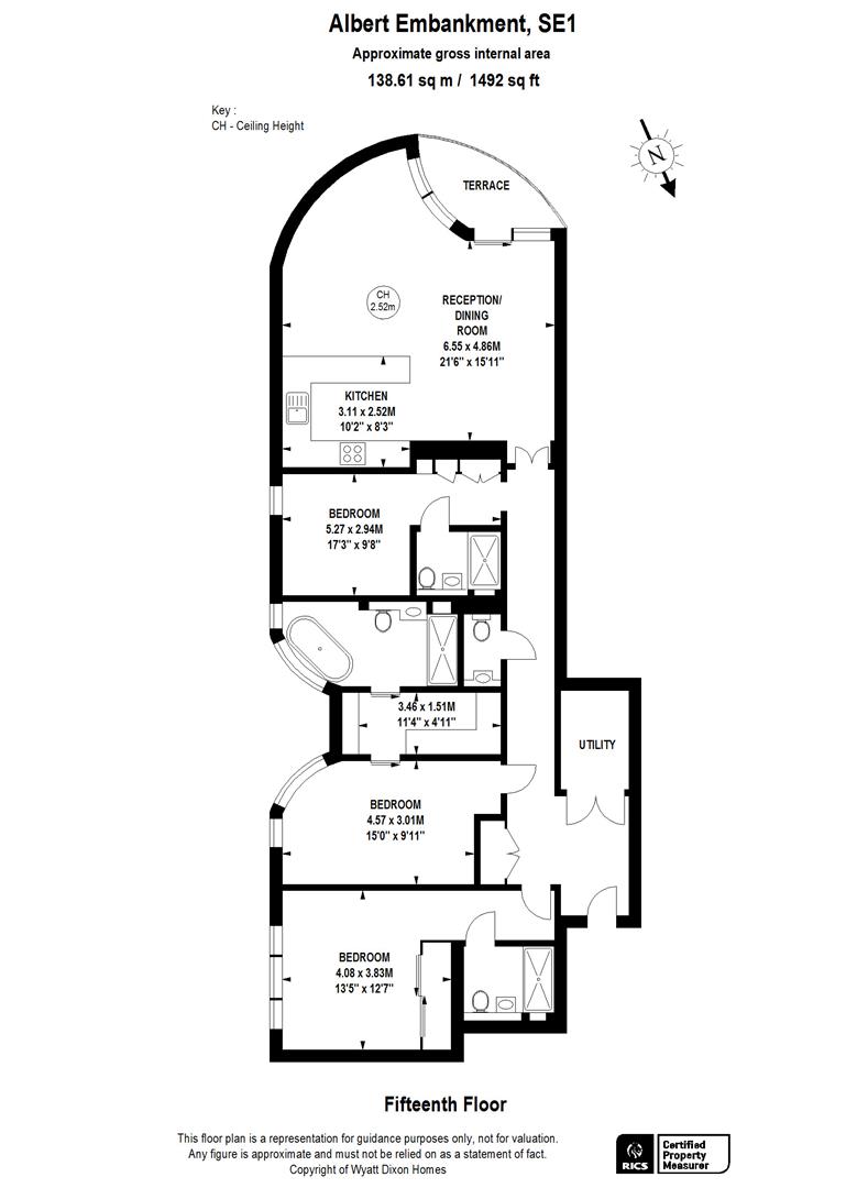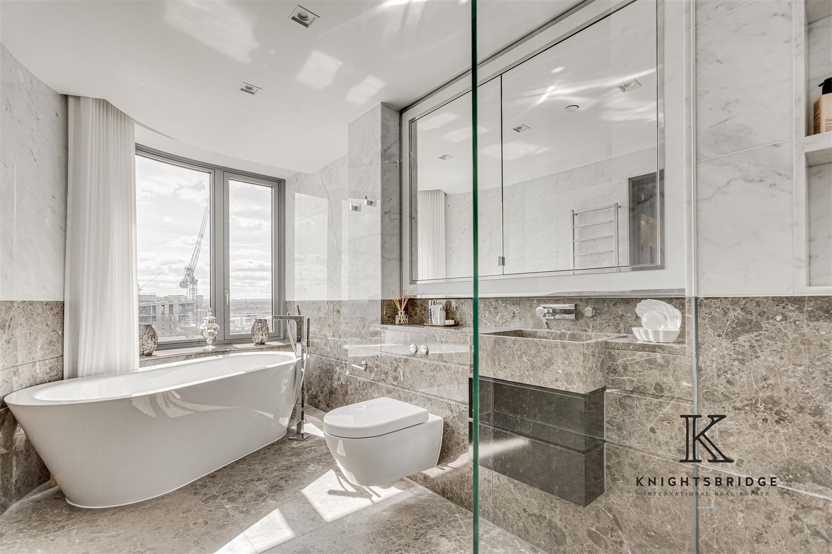 Step inside to discover an impeccably designed interior, where a contemporary open plan kitchen seamlessly transitions into the spacious living and dining areas with access to the balcony providing views of London and the river Thames. The property offers three generously sized double bedrooms, each boasting contemporary and sleek en-suite bathrooms and built-in wardrobes. The primary bedroom further impresses with a walk-in wardrobe and an en-suite featuring a luxurious walk-in shower and freestanding bathtub. Furthermore, the property offers a guest w/c and utility room.