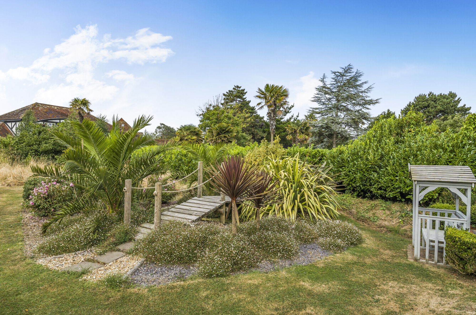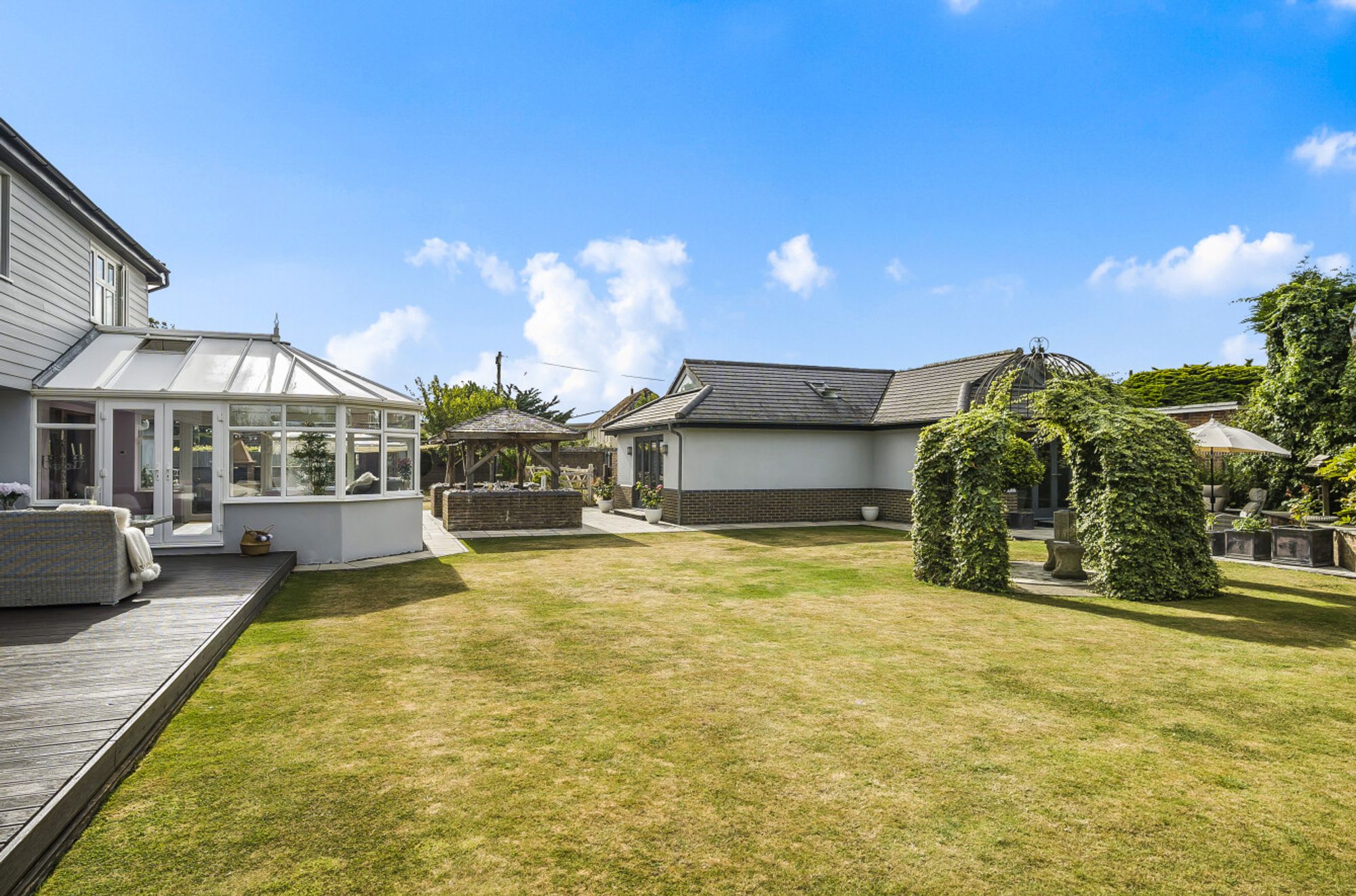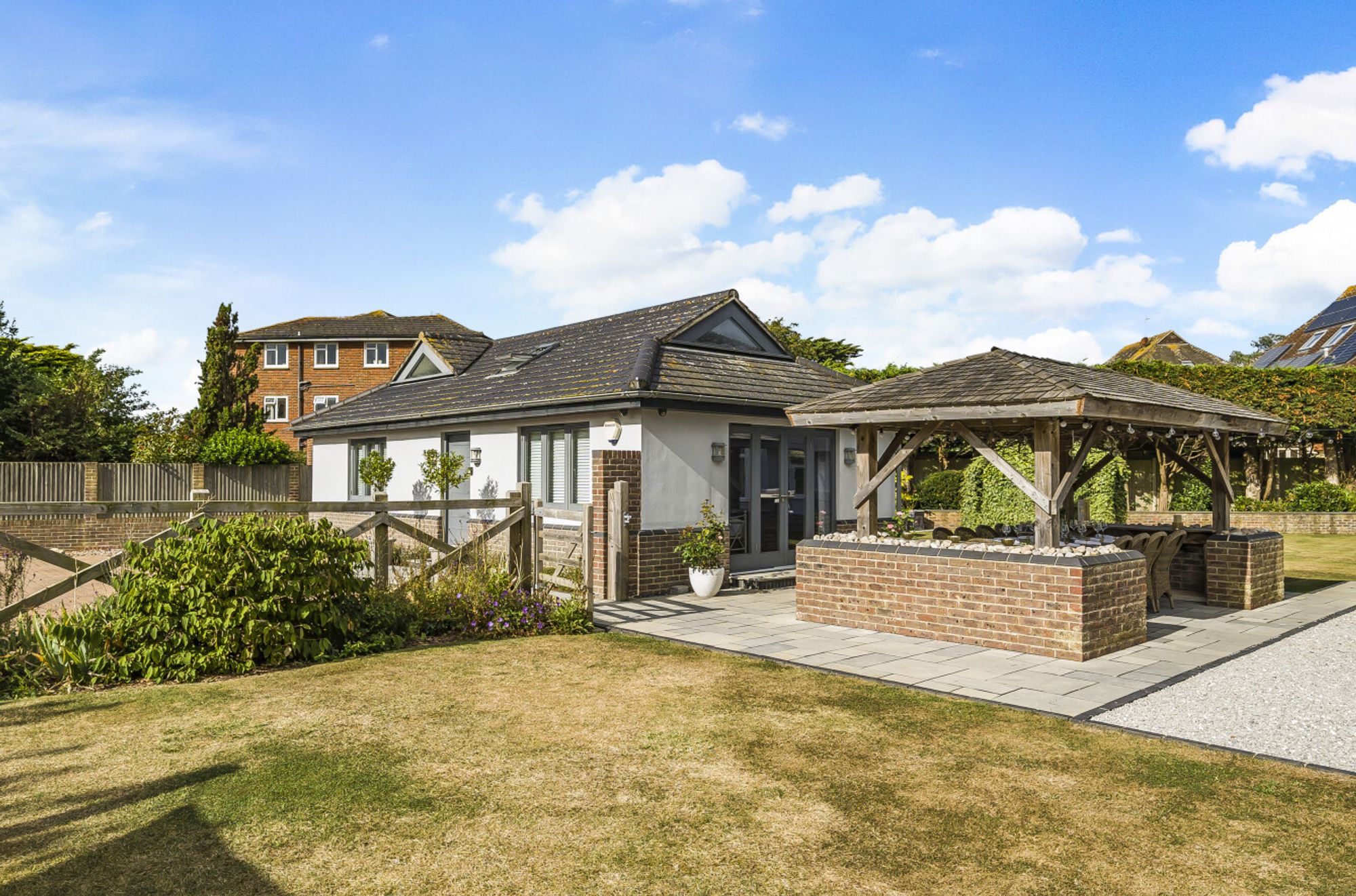 The beautifully landscaped gardens enveloping the property serve as a picturesque backdrop to the house, with a wild flower meadow with feature pond adding a touch of natural beauty. Discover an oasis of relaxation in the summer house, perfect for enjoying lazy afternoons or hosting delightful gatherings. Adjoining the summer house, a gazebo and a brick-built barbeque allow for culinary adventures, adding a delightful touch for al fresco dining. Sea glimpses can be enjoyed providing a sense of serenity and a reminder of the sublime coastal location.