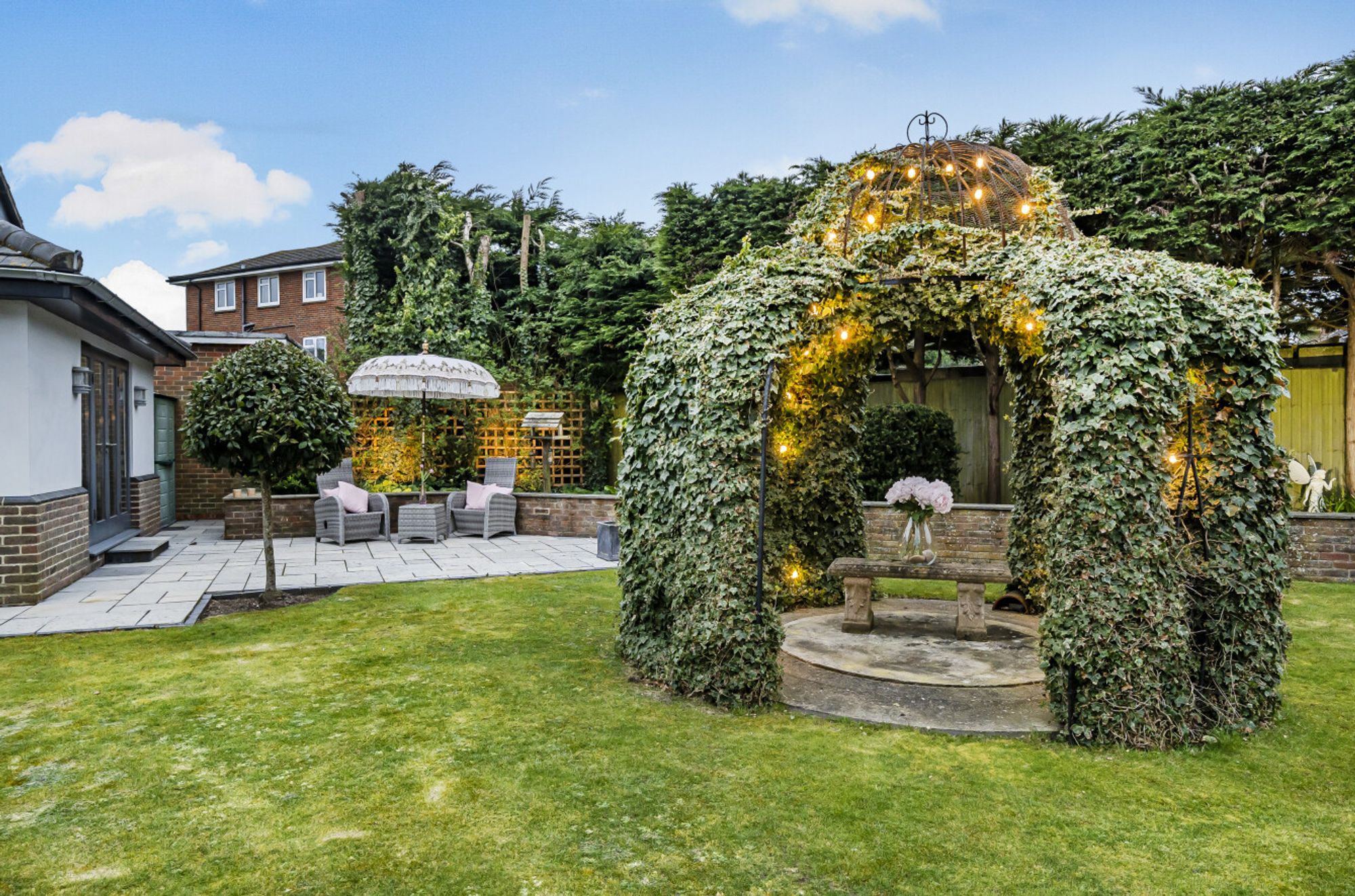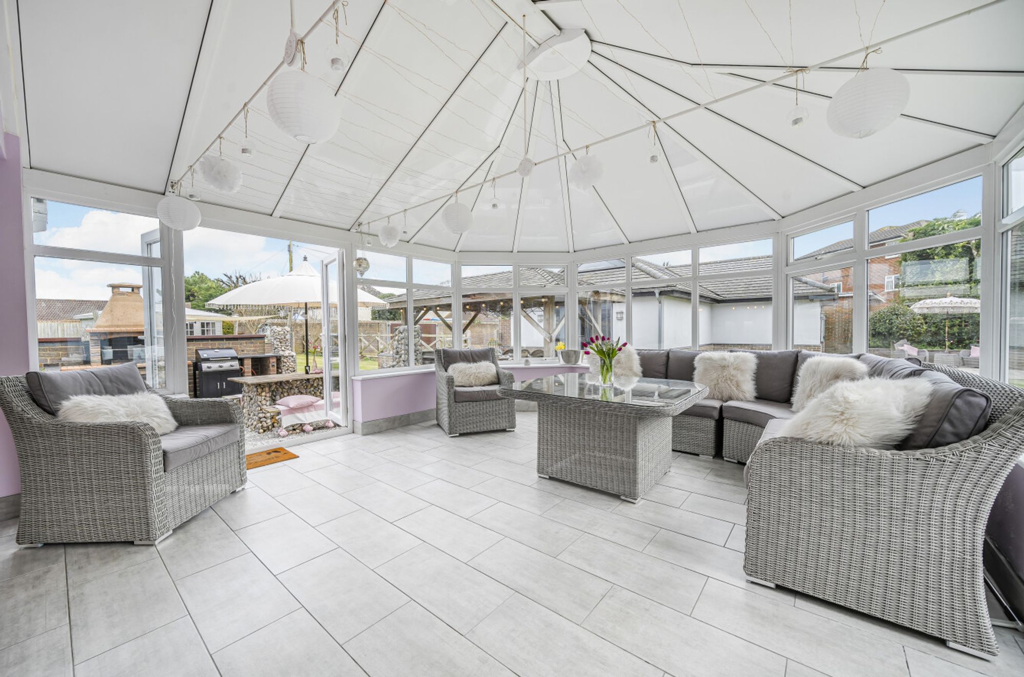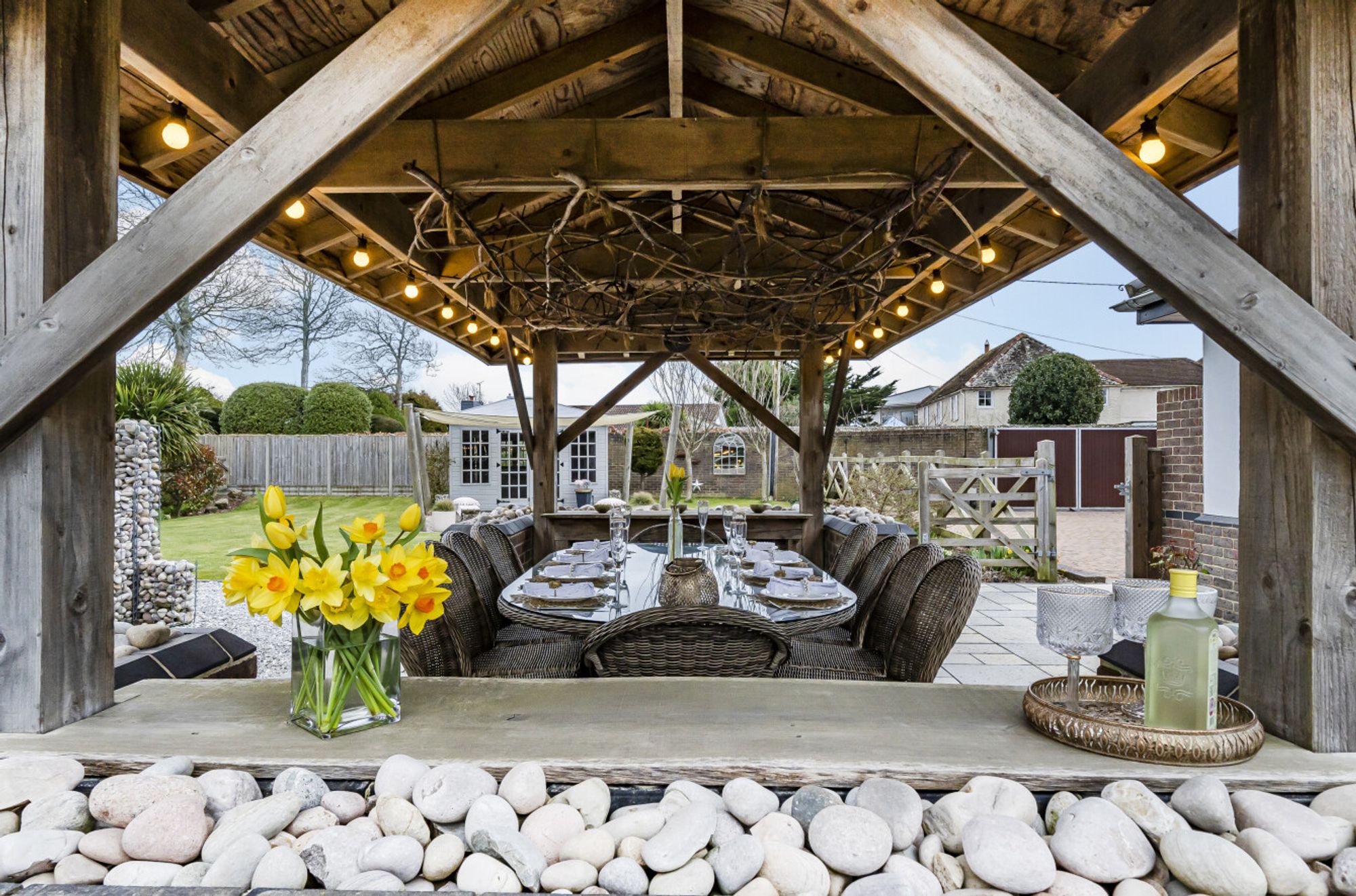 The beautifully landscaped gardens enveloping the property serve as a picturesque backdrop to the house, with a wild flower meadow with feature pond adding a touch of natural beauty. Discover an oasis of relaxation in the summer house, perfect for enjoying lazy afternoons or hosting delightful gatherings. Adjoining the summer house, a gazebo and a brick-built barbeque allow for culinary adventures, adding a delightful touch for al fresco dining. Sea glimpses can be enjoyed providing a sense of serenity and a reminder of the sublime coastal location.