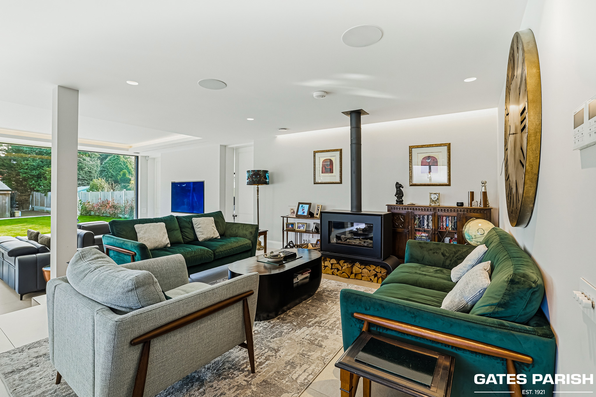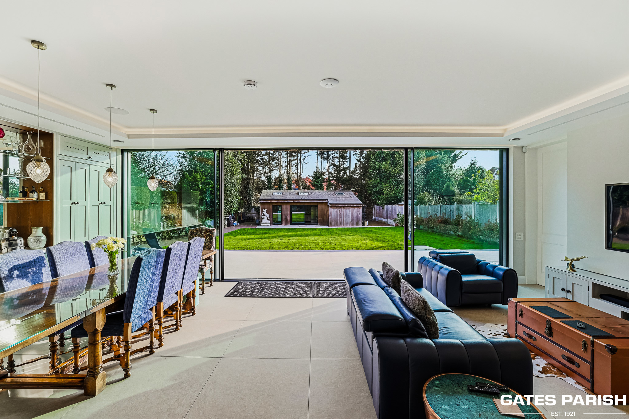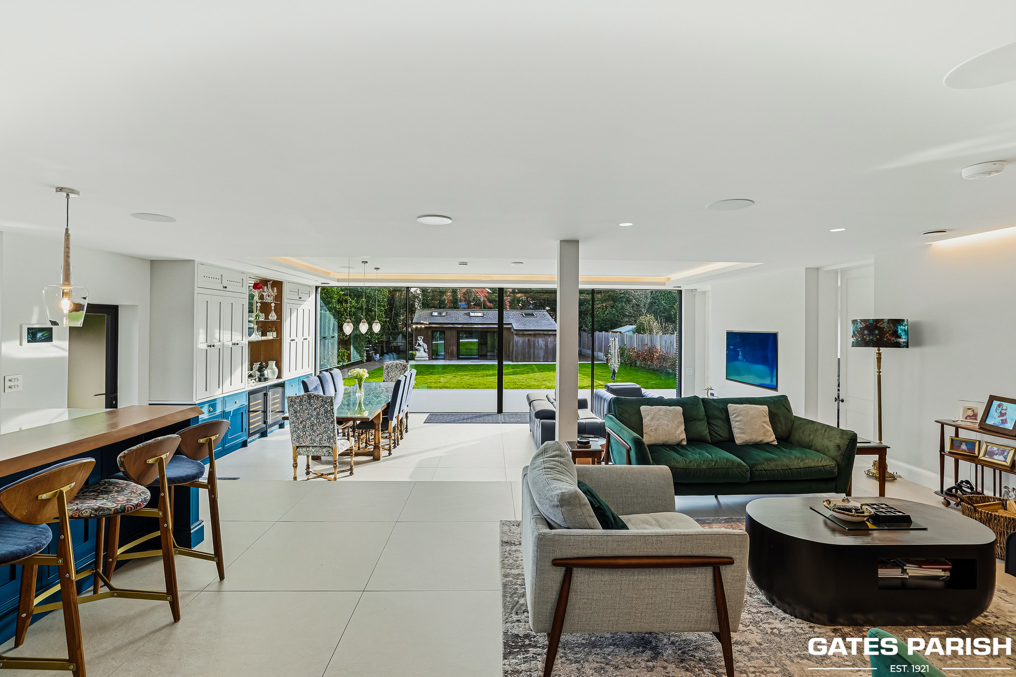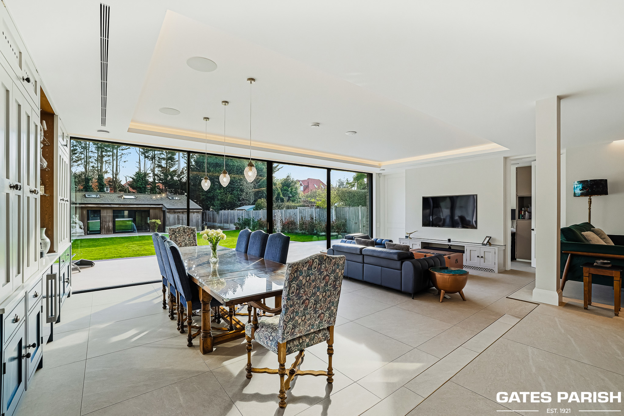 The heart of the home is a stunning open-plan living space with expansive frameless glazing overlooking the south-facing rear garden, flooding the space with natural light. A bespoke Drew Forsyth kitchen features Silestone worktops and premium appliances including Neff ovens, Bora hob with extraction, Quooker tap, and integrated refrigeration. The space flows seamlessly into dining and multiple reception areas, including a snug with Gazco fireplace and a separate TV room.