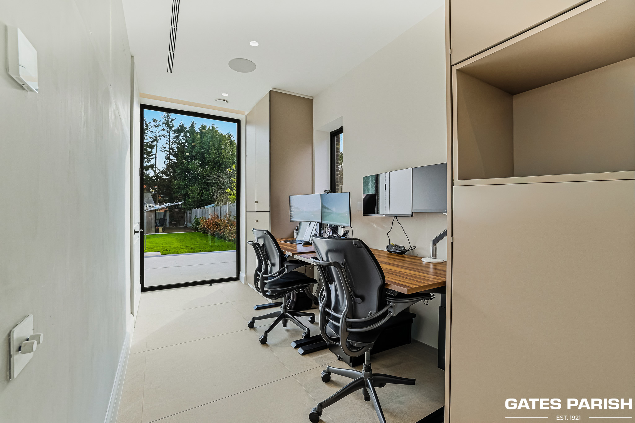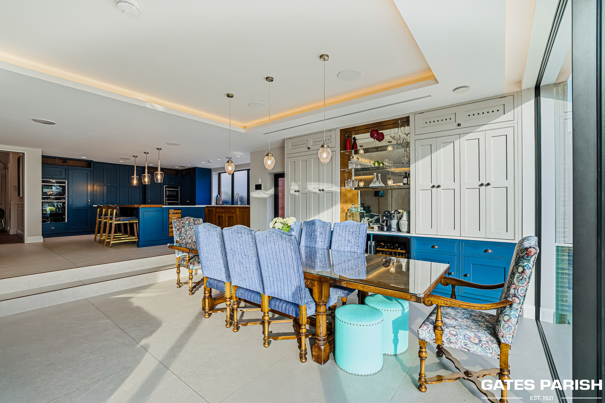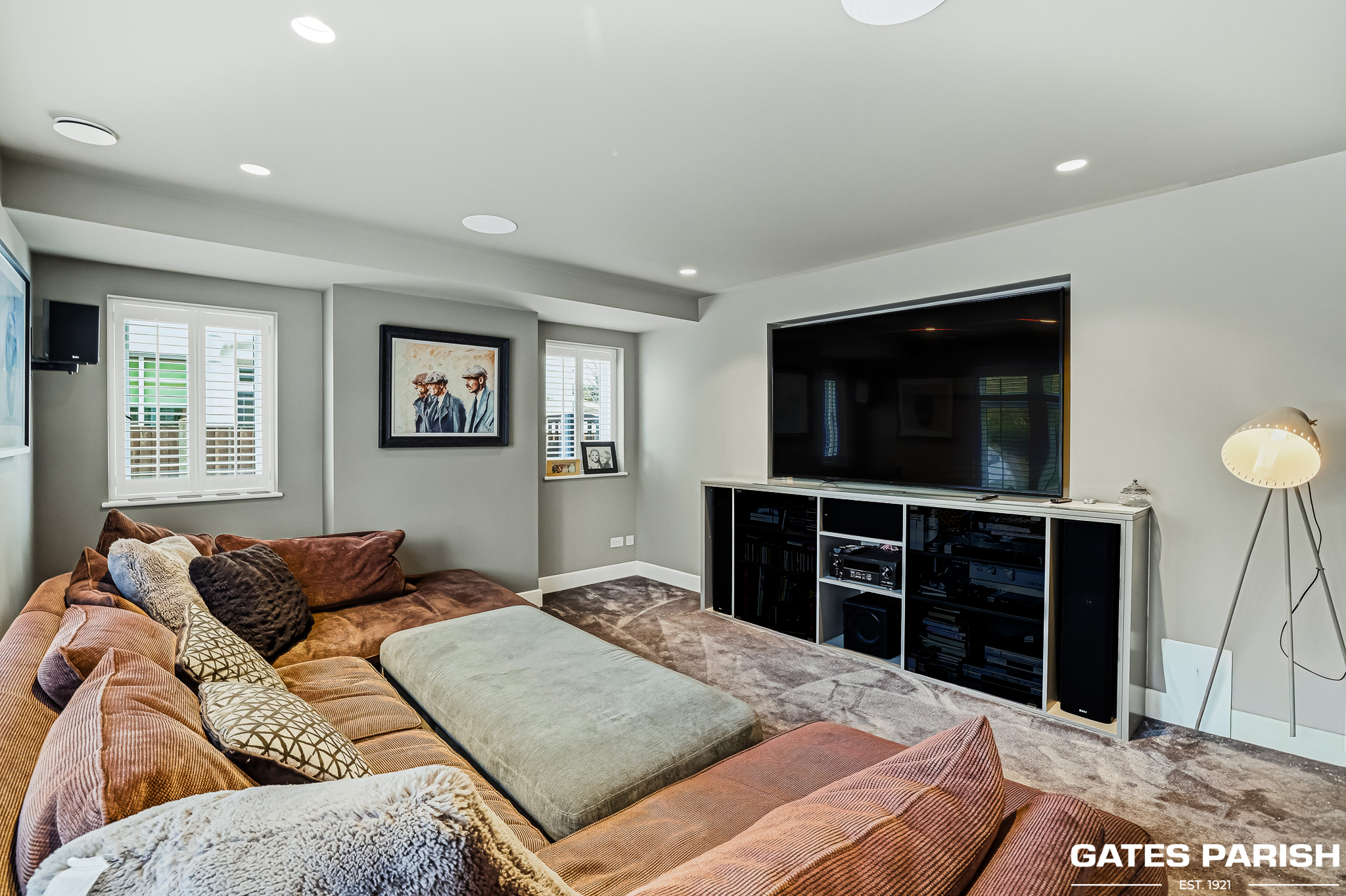 The heart of the home is a stunning open-plan living space with expansive frameless glazing overlooking the south-facing rear garden, flooding the space with natural light. A bespoke Drew Forsyth kitchen features Silestone worktops and premium appliances including Neff ovens, Bora hob with extraction, Quooker tap, and integrated refrigeration. The space flows seamlessly into dining and multiple reception areas, including a snug with Gazco fireplace and a separate TV room.
