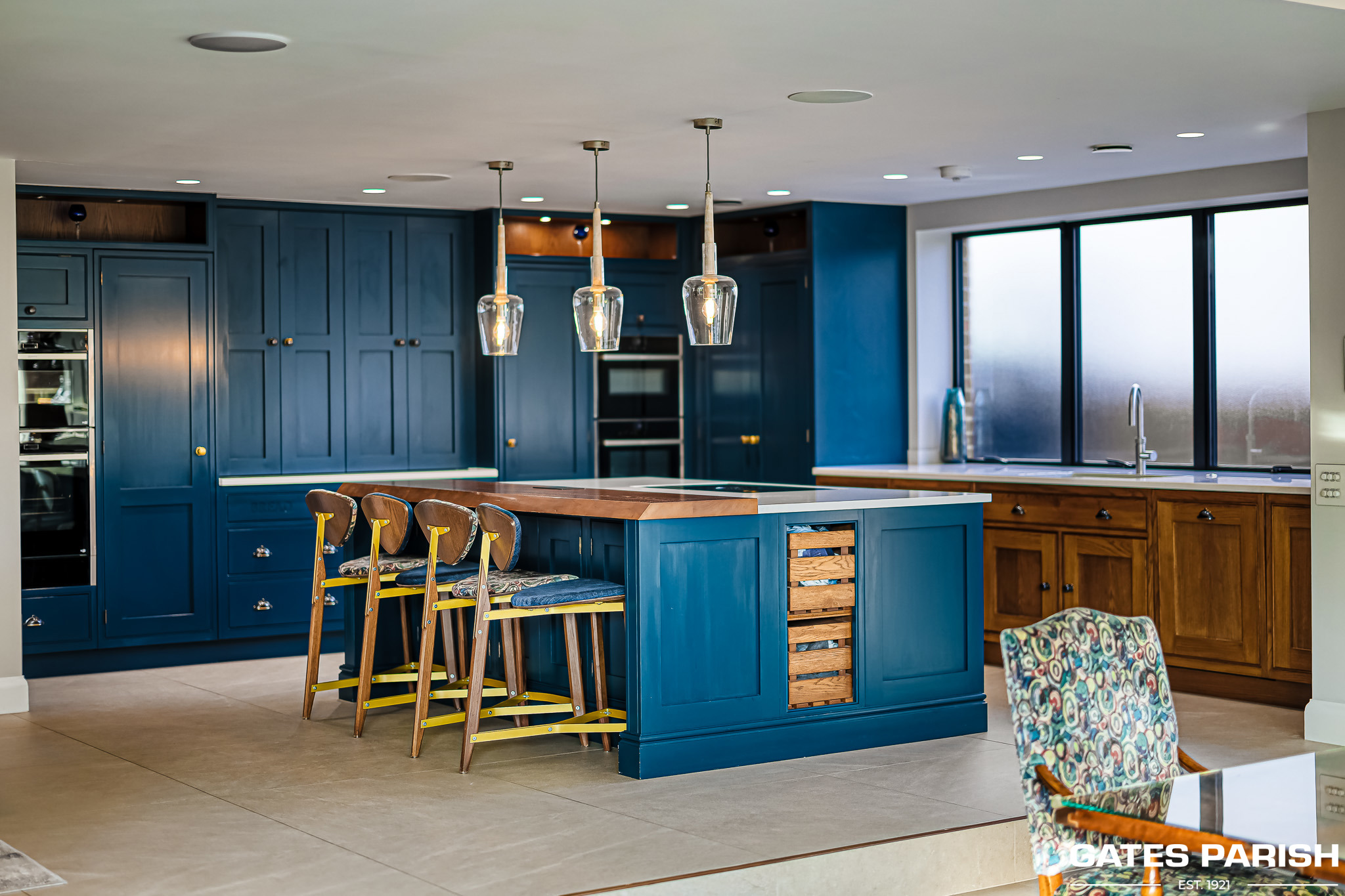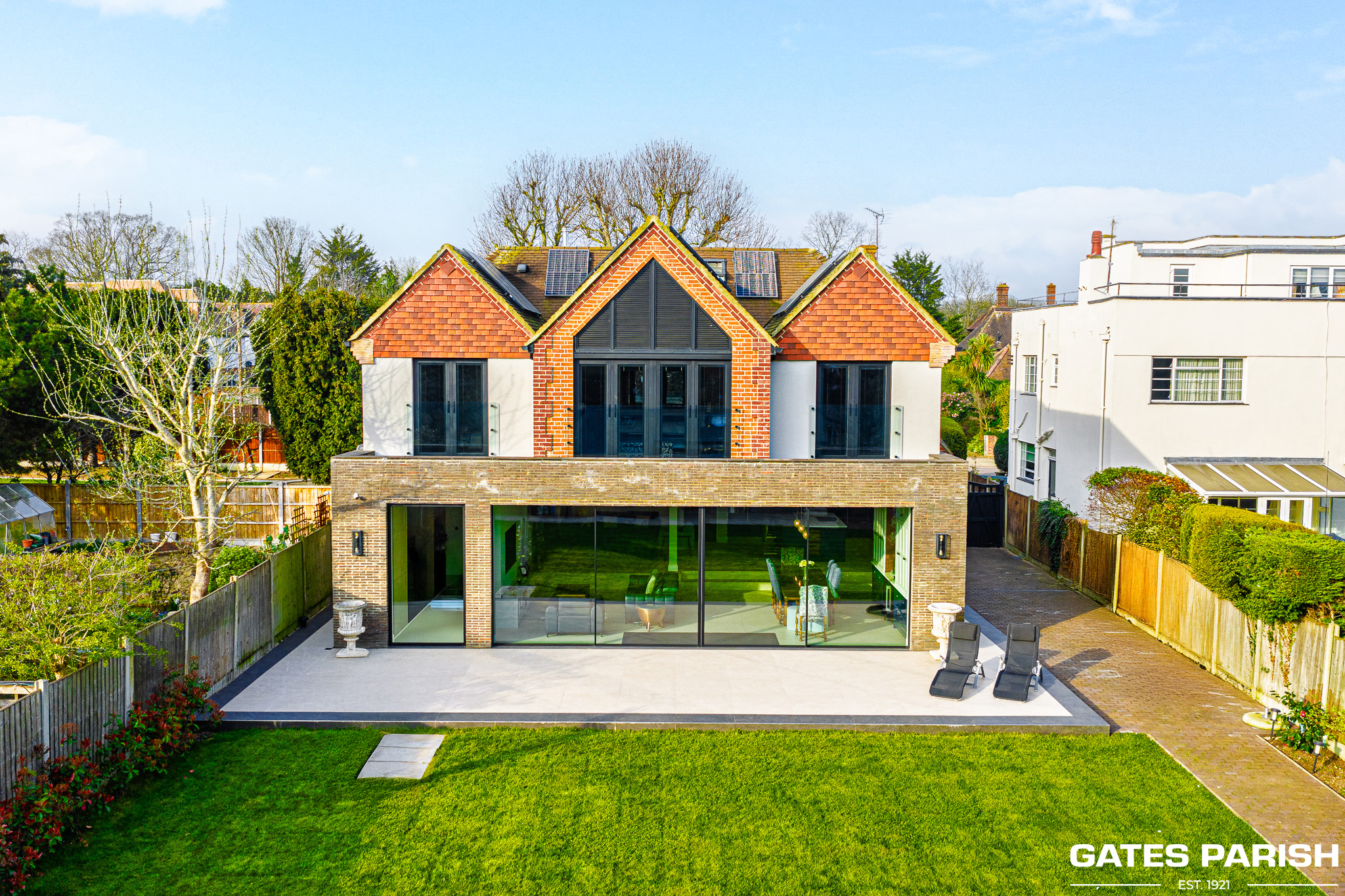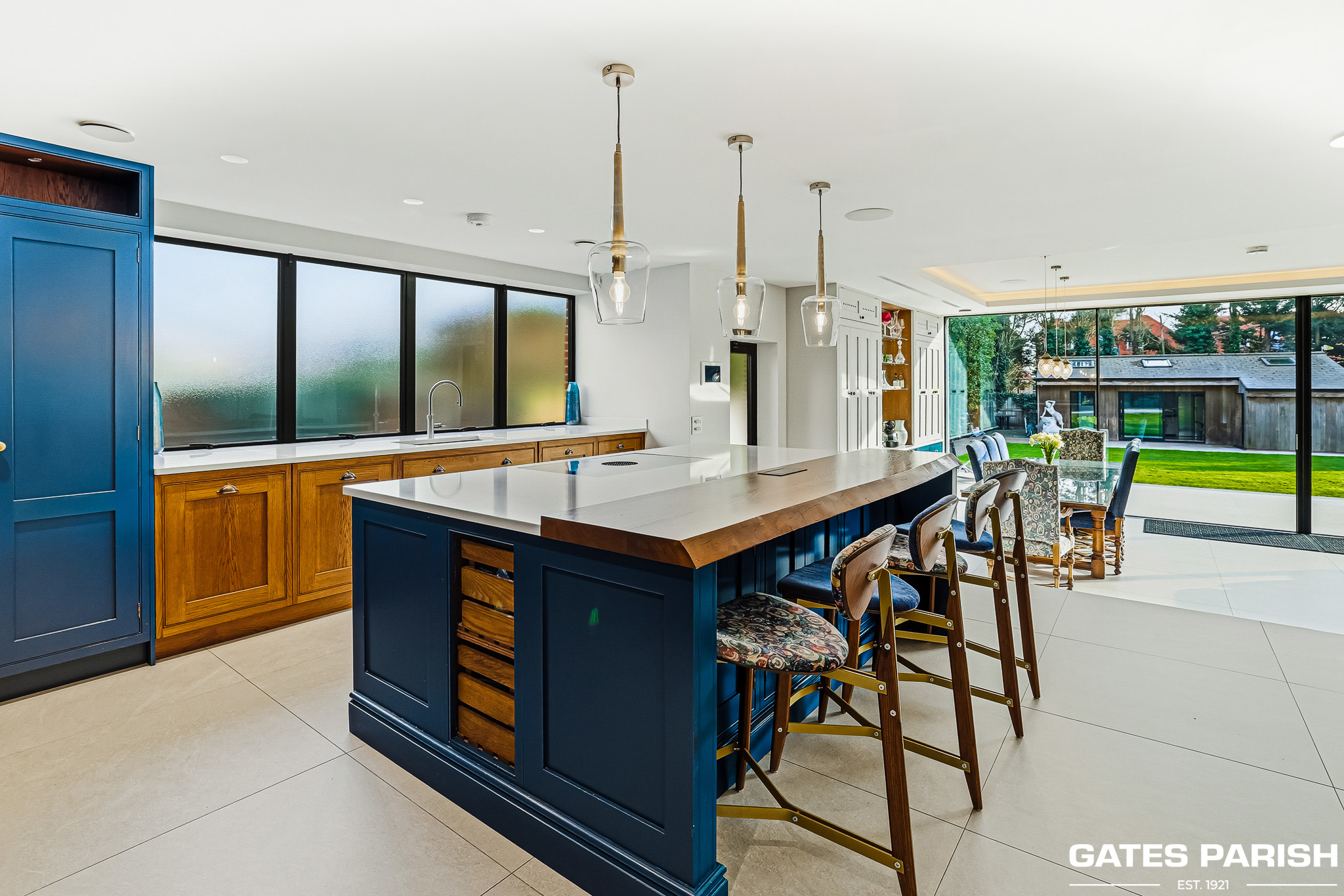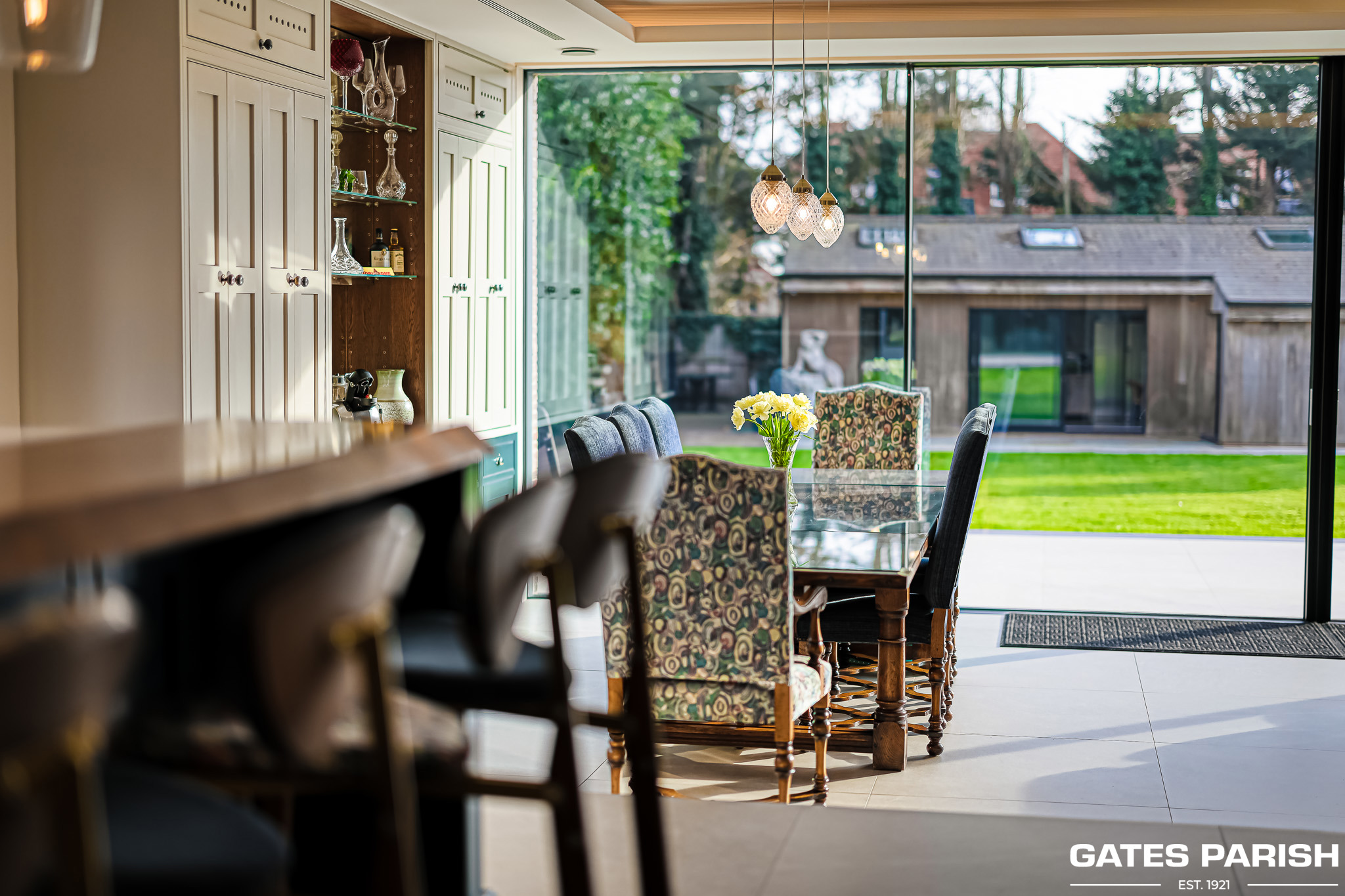 The heart of the home is a stunning open-plan living space with expansive frameless glazing overlooking the south-facing rear garden, flooding the space with natural light. A bespoke Drew Forsyth kitchen features Silestone worktops and premium appliances including Neff ovens, Bora hob with extraction, Quooker tap, and integrated refrigeration. The space flows seamlessly into dining and multiple reception areas, including a snug with Gazco fireplace and a separate TV room.