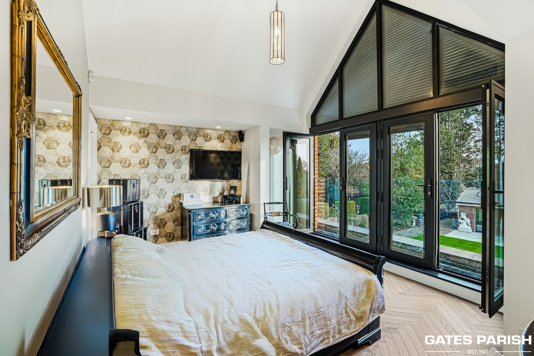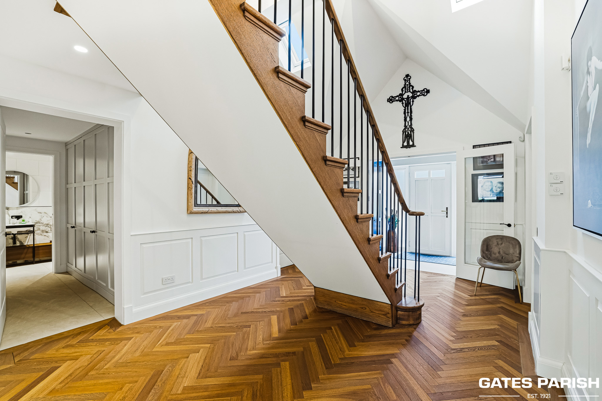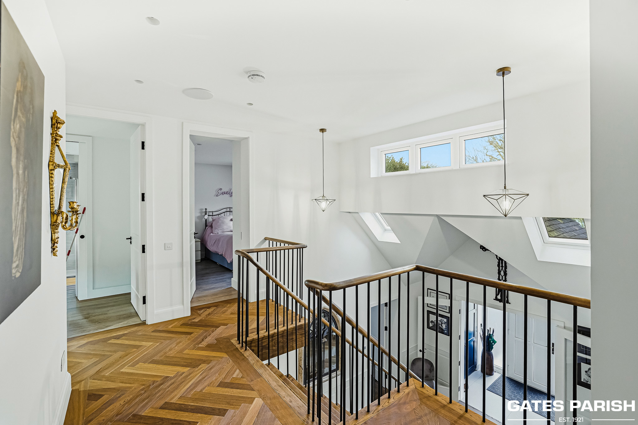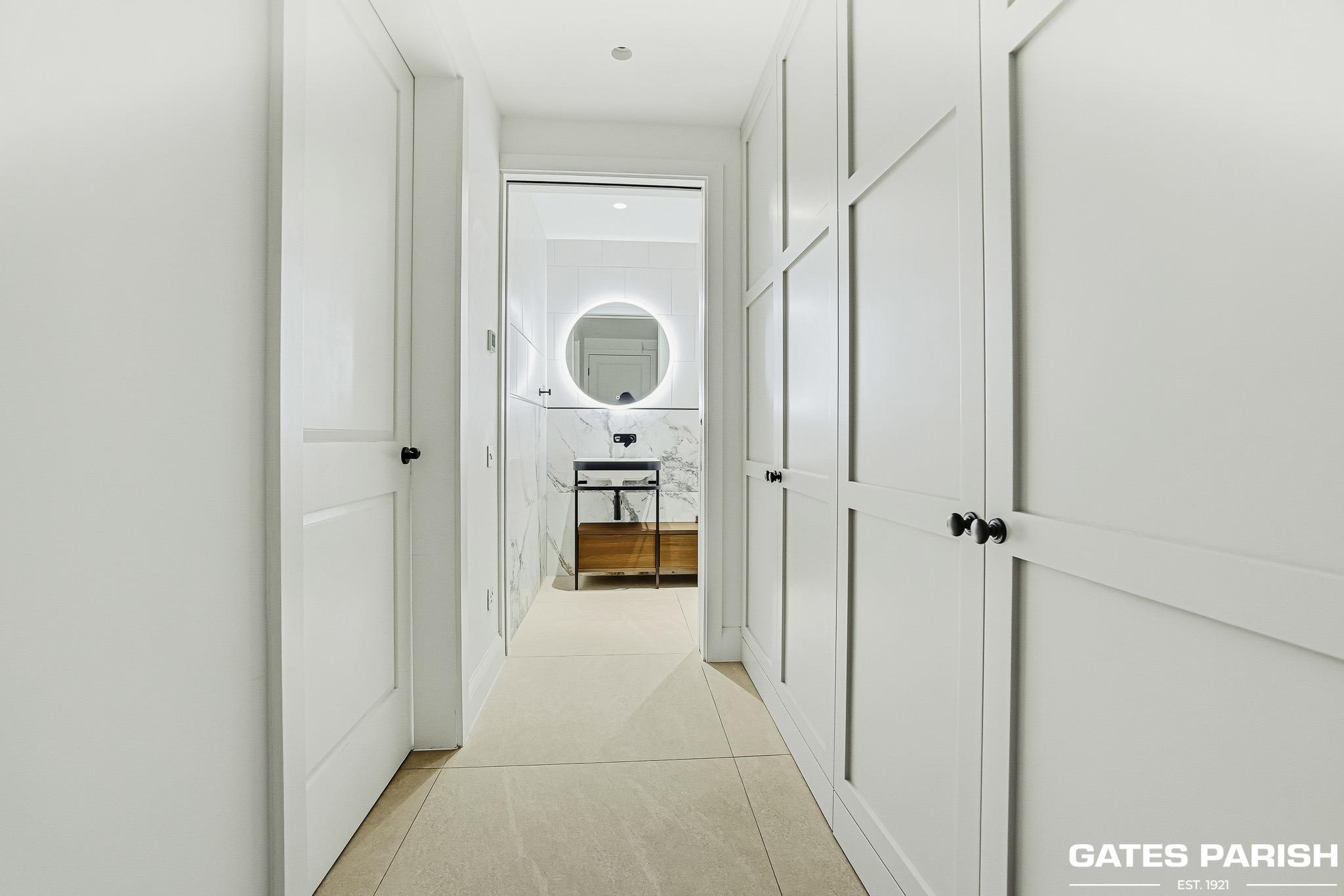 Upstairs, well-proportioned bedrooms feature bespoke fitted wardrobes, while the bathrooms are finished with Duravit sanitaryware, Hansgrohe fittings, and Geberit systems.
