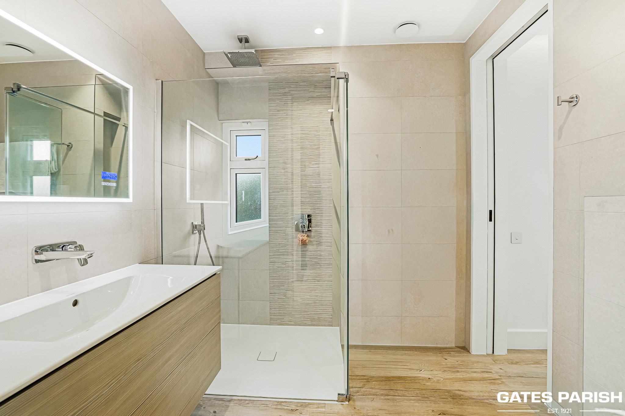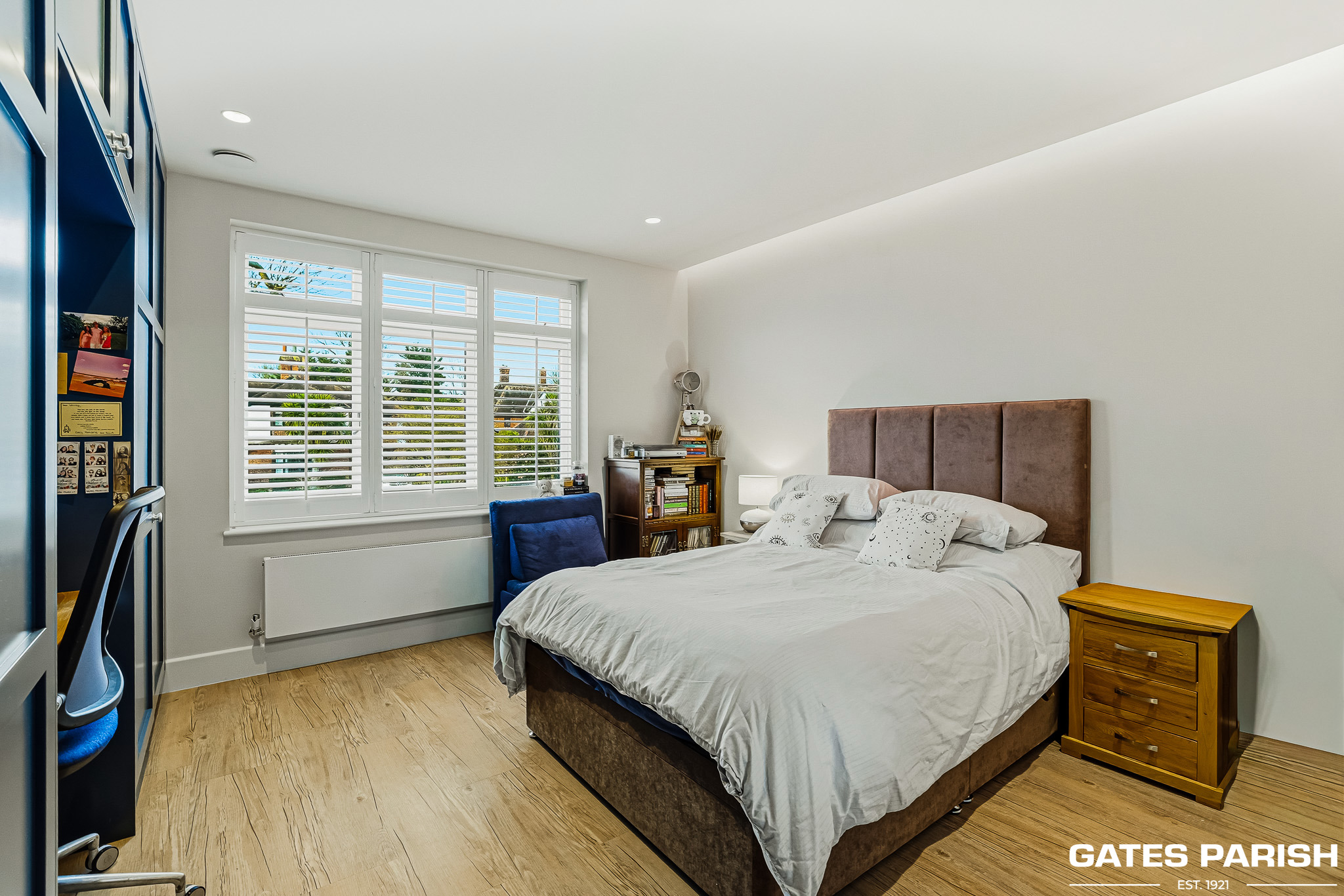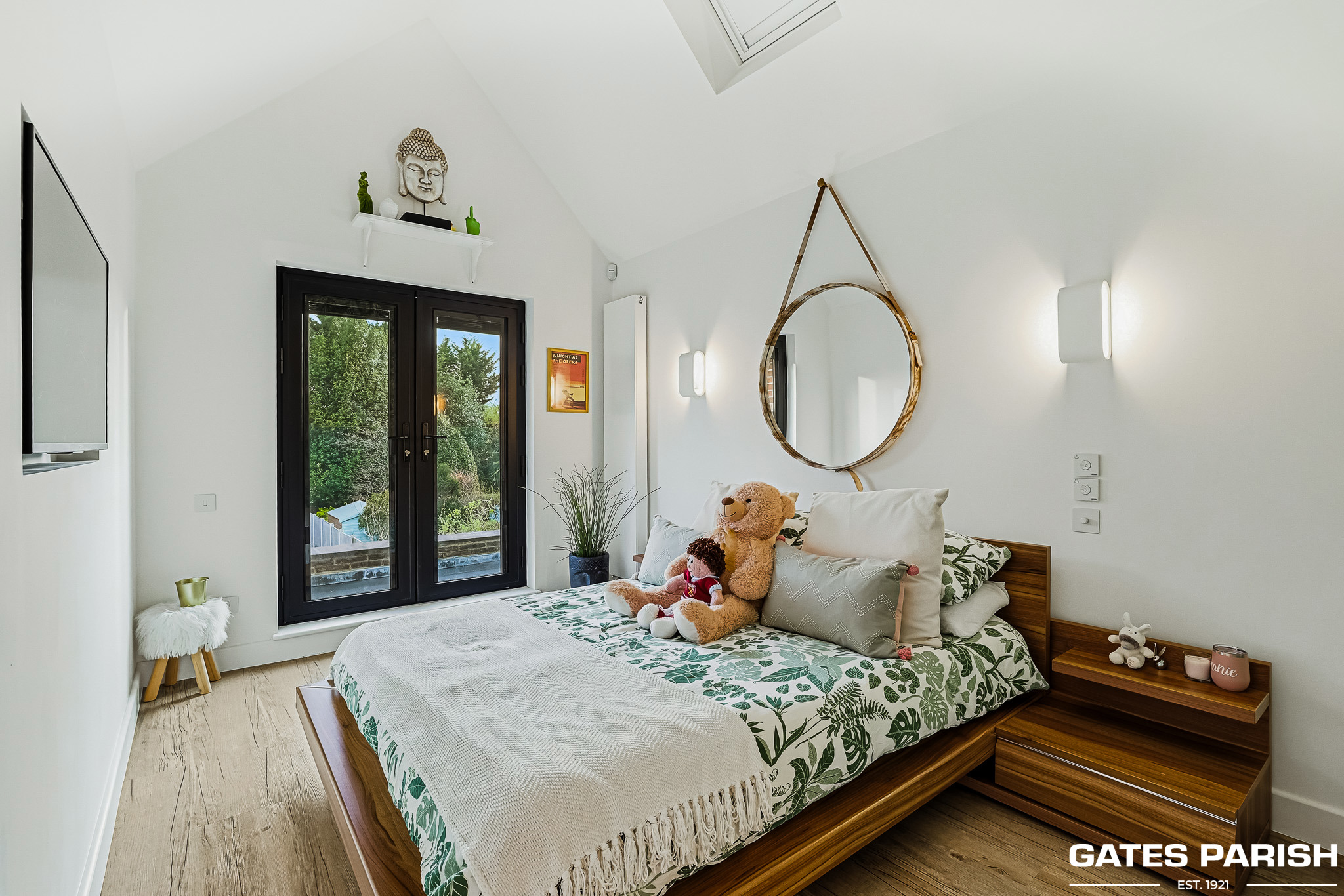 Upstairs, well-proportioned bedrooms feature bespoke fitted wardrobes, while the bathrooms are finished with Duravit sanitaryware, Hansgrohe fittings, and Geberit systems.