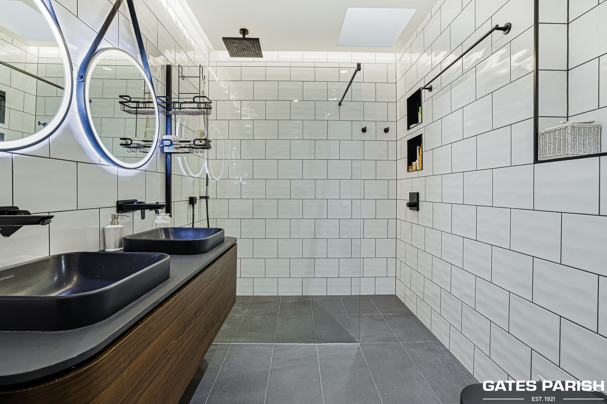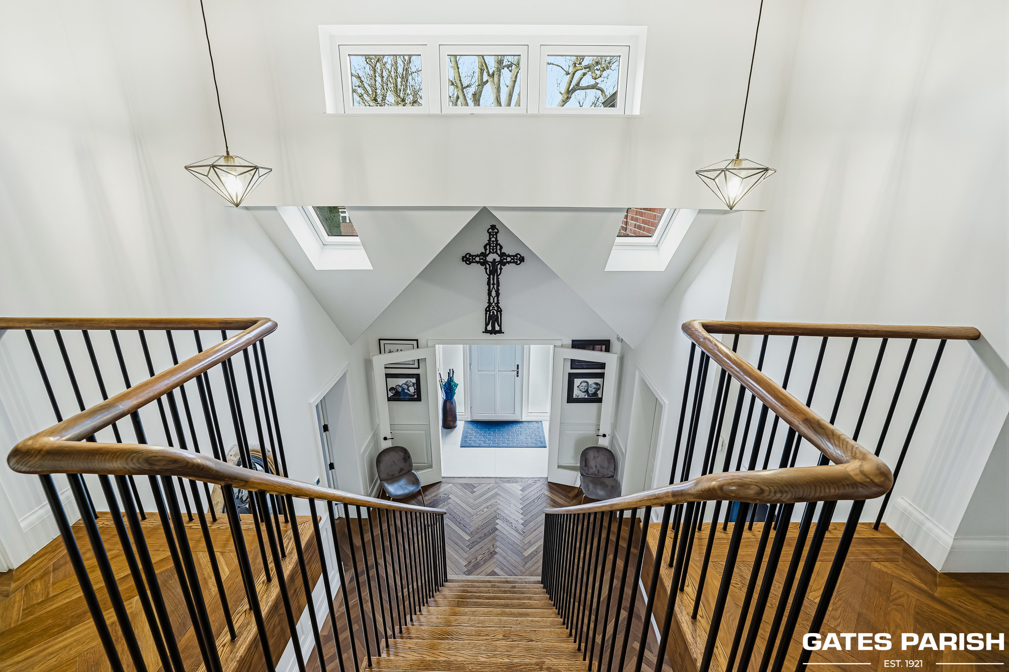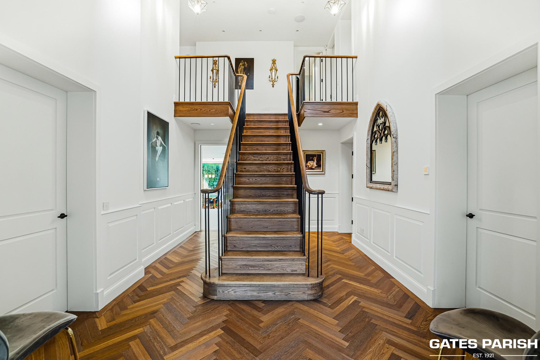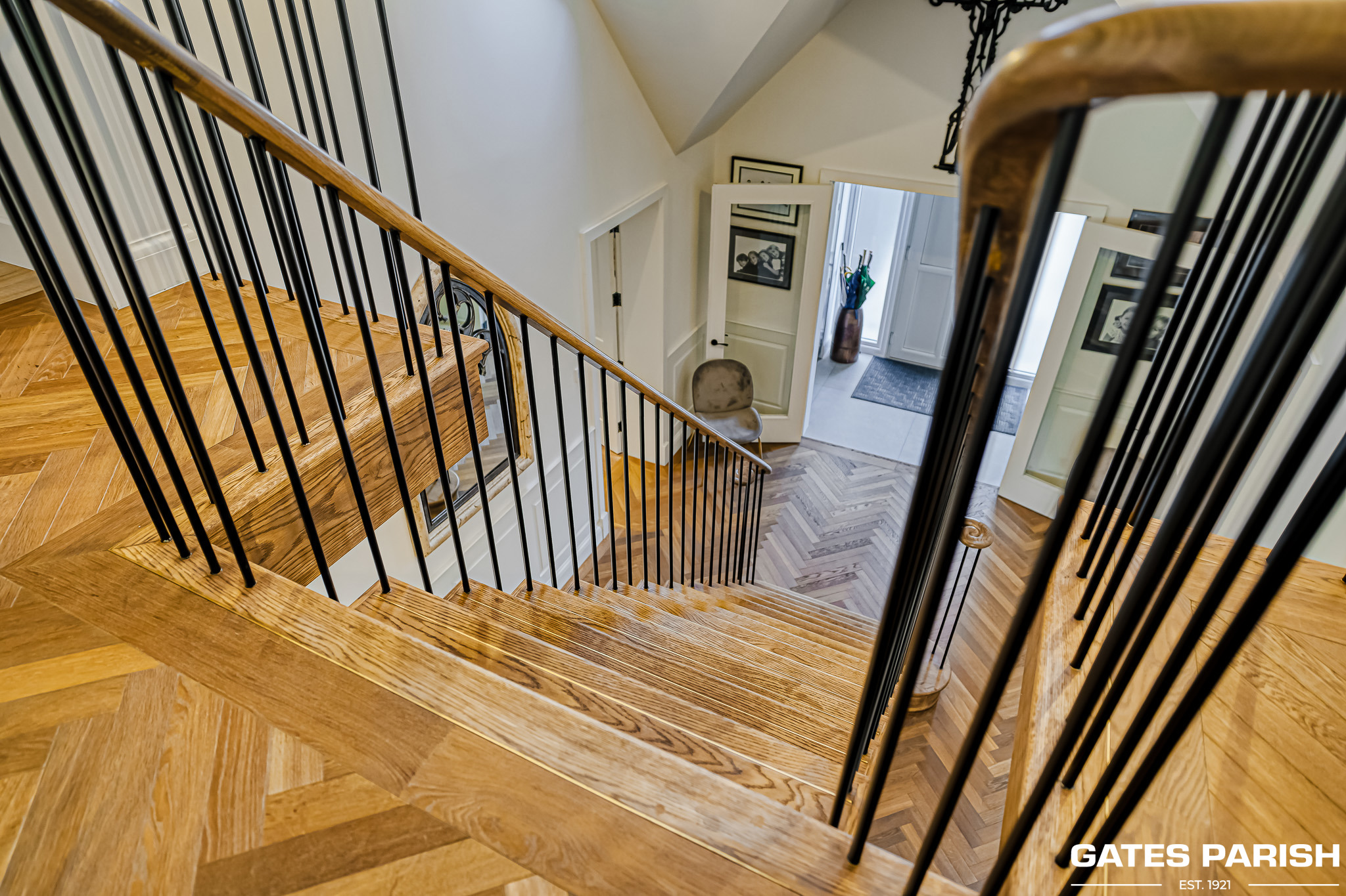 Upstairs, well-proportioned bedrooms feature bespoke fitted wardrobes, while the bathrooms are finished with Duravit sanitaryware, Hansgrohe fittings, and Geberit systems.