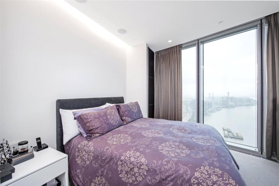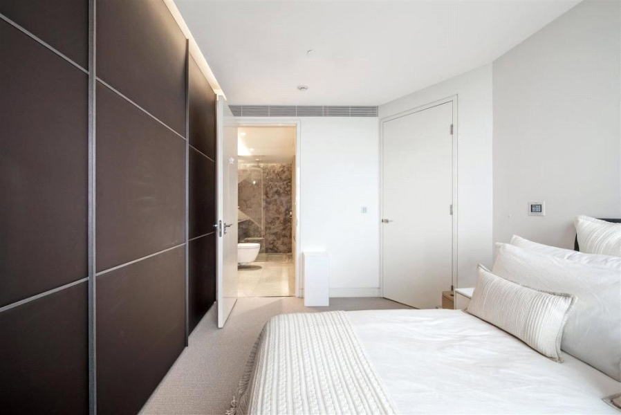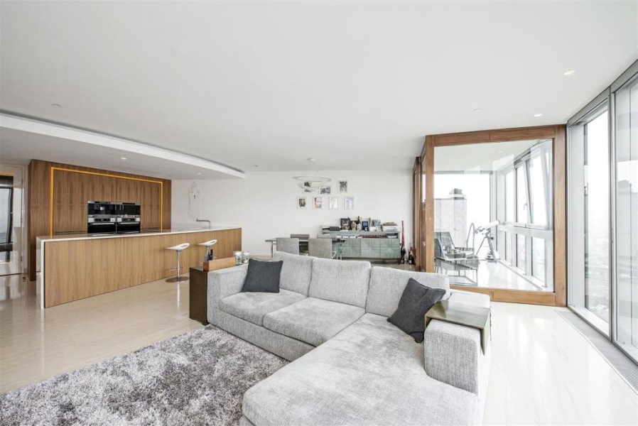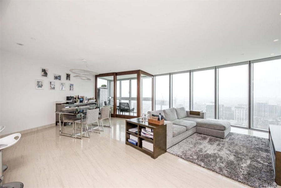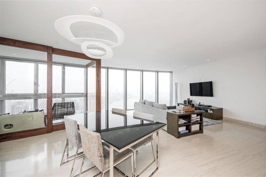 A luxury, 1198sqft two-bedroom apartment presented to the highest specification with views of the river from the 28th floor of one of the tallest residential towers in Europe and the final phase of the award-winning riverside development St George Wharf.