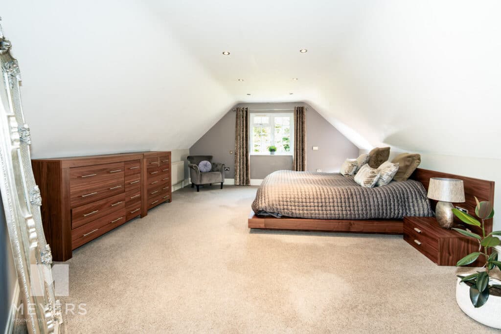 The largest bedroom and could be used as the primary. This bedroom has a dual aspect to the front and side elevation and benefits from a walk-in wardrobe with built-in shelving and rails.