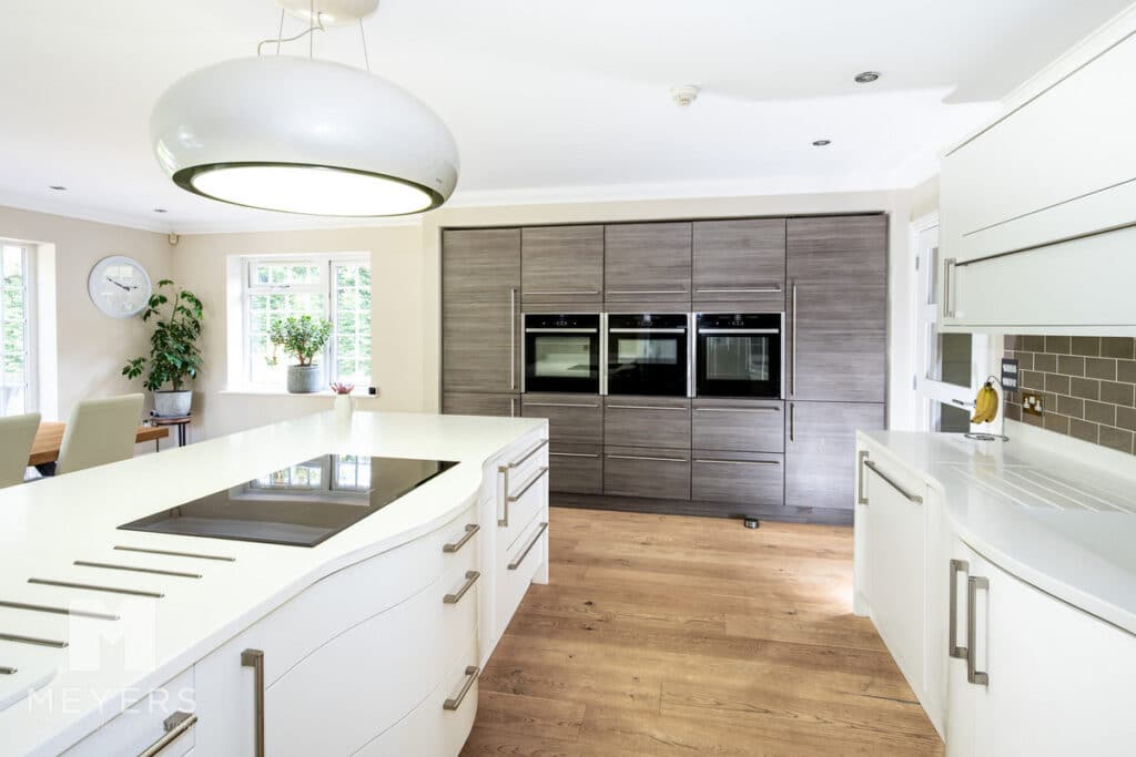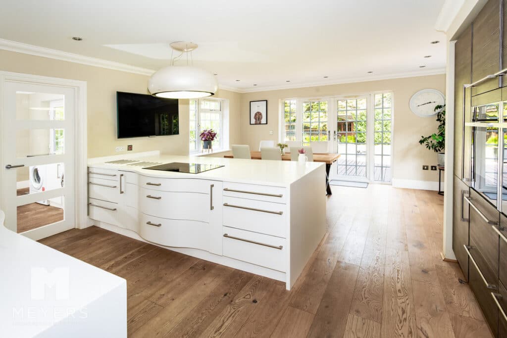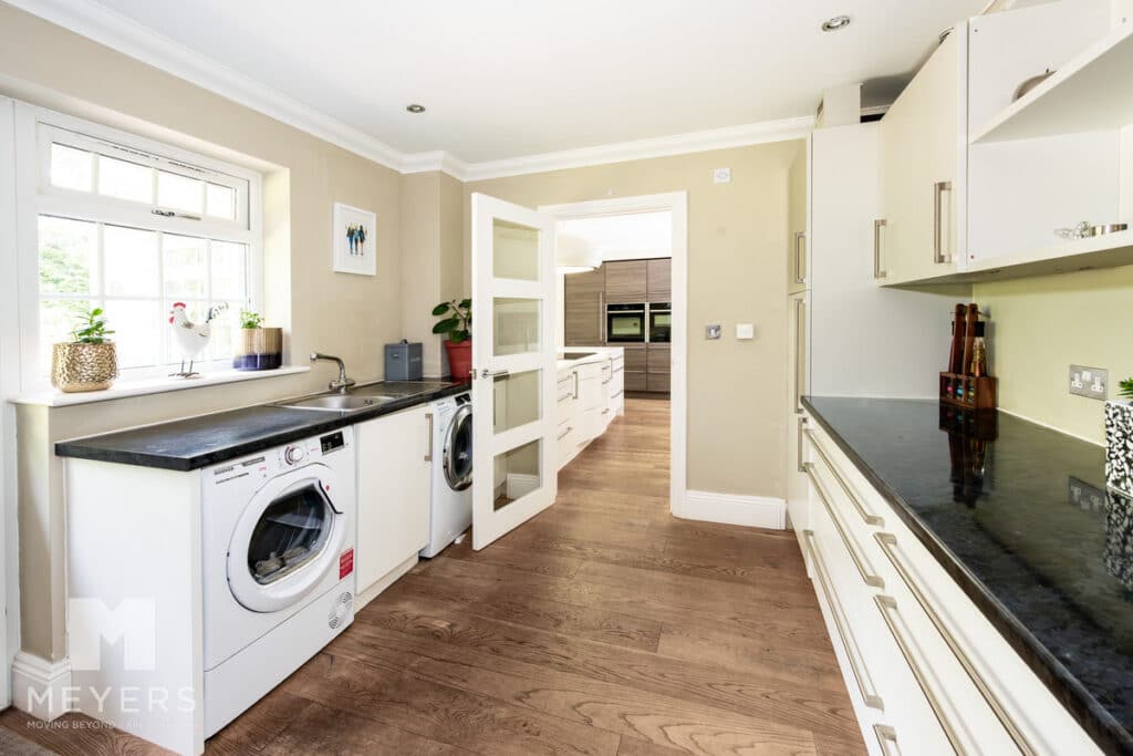 A part glazed internal door from the hallway leads into the kitchen/breakfast/dining room which has been fitted with a modern and high specification kitchen with a central island and breakfast bar which accommodates four/five stools. The comprehensive kitchen offers a range of matt white floor units with a Corian worksurface over with an inset sink and drainer, tiled splash back and hinged wall cupboards over and features a hot water Quooker tap and integral dishwasher. The island has been fitted with a five ring Bosch induction hob and motorised Elica extractor over. A further bank of wall mounted units are finished in a contrasting wood grain ash grey colour, and fitted with a full length fridge and freezer, pull out pan drawers and mid height Neff appliances include a single oven, combination microwave oven, warming drawer and steamer oven.