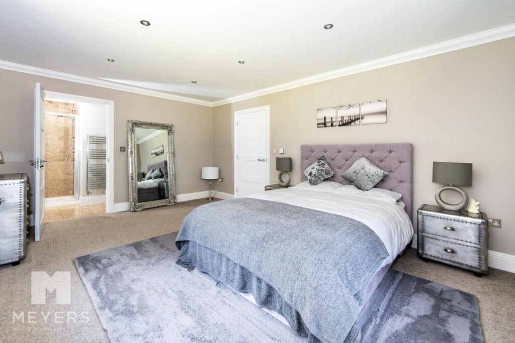 A double aspect bedroom which provides a wonderful room for guest or if ground floor living is required. There is ample room for a king or super king bed with freestanding furniture. The en suite shower room comprises a low-level W.C with enclosed cistern and flush, wall mounted towel rail, corner wash handbasin with tiled splashback and mixer tap with vanity storage unit below and a walk-in shower cubicle with a sliding glass door and wall mounted Grohe shower with shower attachment over and wall mounted jets. Enclosed with tiled walls and flooring.