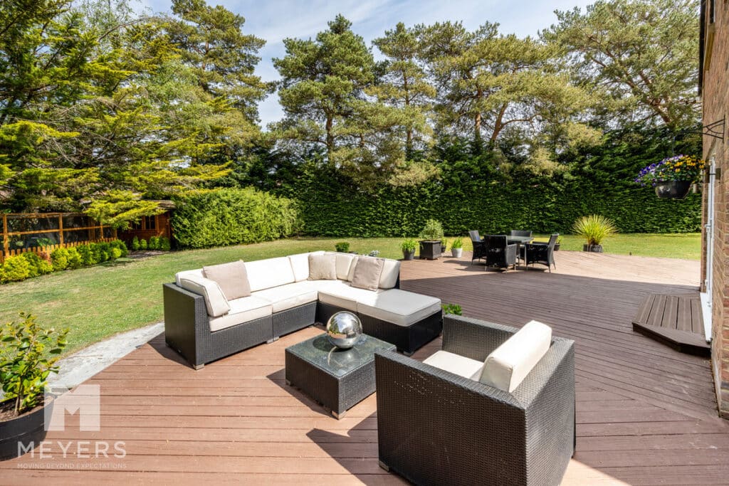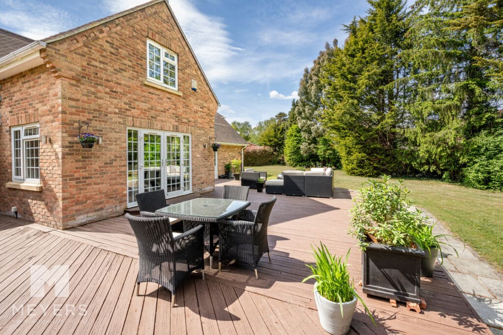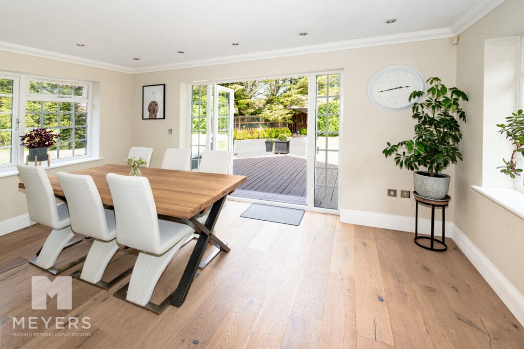 The dining area has room for an 8-10 seater table and chairs and has direct access to the rear garden and raised decked area via the UPVC French doors.