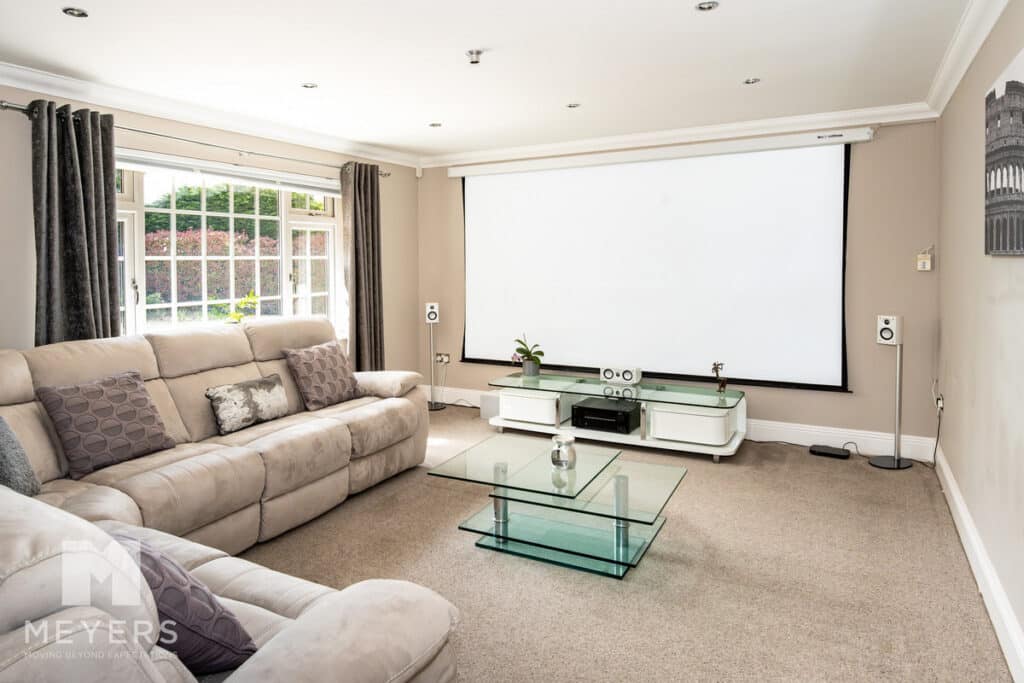 Located next to the kitchen and accessed from the hallway. The current owners have utilised this room as a home cinema room but could become a formal dining room if required. The room has an aspect over the front and is generous in size. The cinema equipment includes a JVC projector, pull down screen and speakers - all available subject to negotiation.