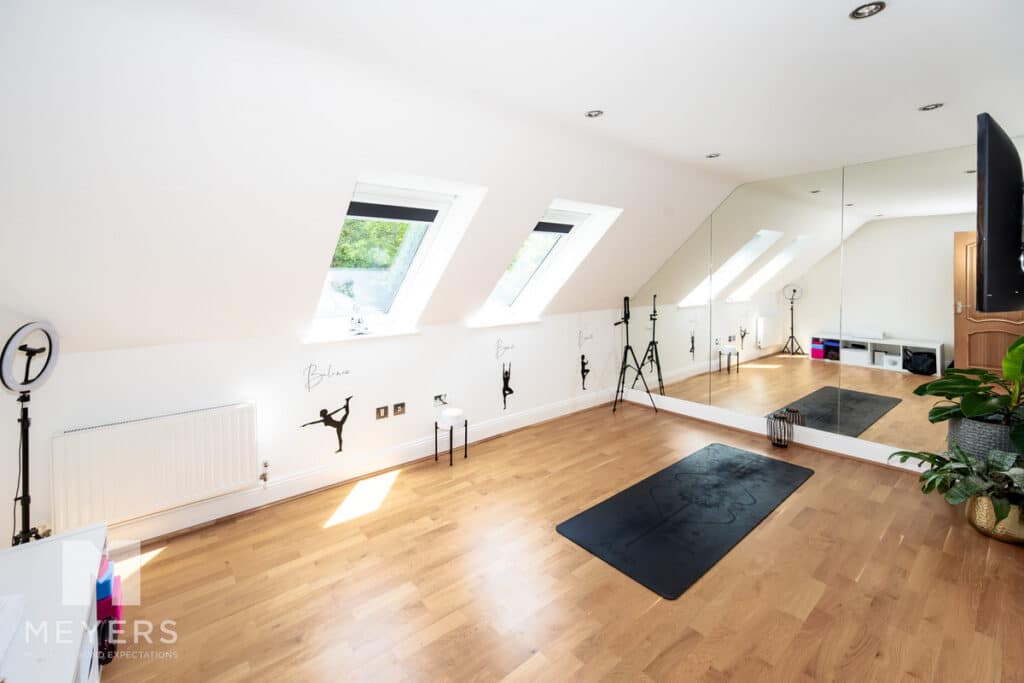 Bedroom five has been converted into a home Yoga/Gym studio. The room has plenty of natural light from the dual Velux windows and has been fitted with laminate flooring and bespoke floor to ceiling mirrors. There is provisions for a wall mounted T.V.