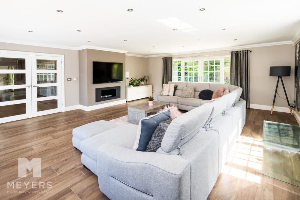 Partially glazed double opening doors lead from the hallway into the wonderful and spacious sitting room. The triple aspect room enjoys views to the front, side and rear elevations and has been finished with a wood effect porcelain tiled floor. A central, inset, remote gas fire place creates a cosy feel to the room and provides a lovely focal point. There is ample space for a large sofa suite and freestanding furniture.