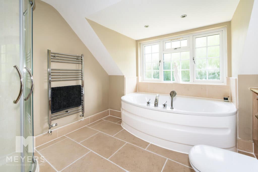 The family bathroom is a great size and comprises a two person panelled bath with mixer tap and separate shower attachment, corner walk-in shower enclosure with Grohe shower valve and shower attachment over, wall mounted towel rail and a bank of storage cupboards with a fitted low-level W.C, ceramic wash hand basin with mixer tap and mirror over. Enclosed with tiled floors and walls.